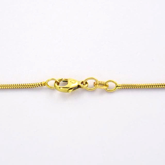 Bei dem Schmuckstück handelt es sich um eine Schlangenkette der Marke FBM mit Anhänger aus 585 Gelbgold mit einem Brillanten von ca. 0,34 ct in der Qualität Weiß mit kleinen Einschlüssen (W/si). Das Schmuckstück hat eine Gesamtlänge von 48,5 cm.