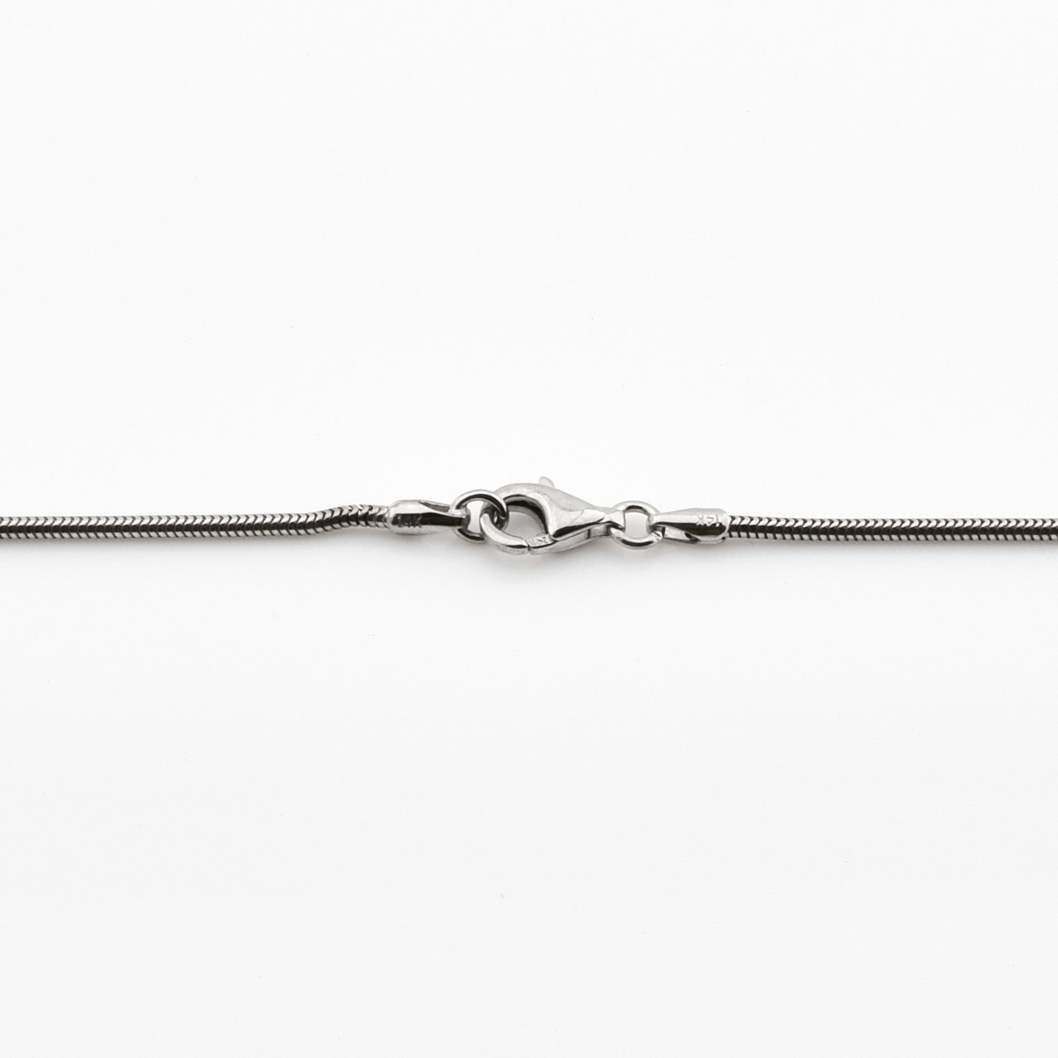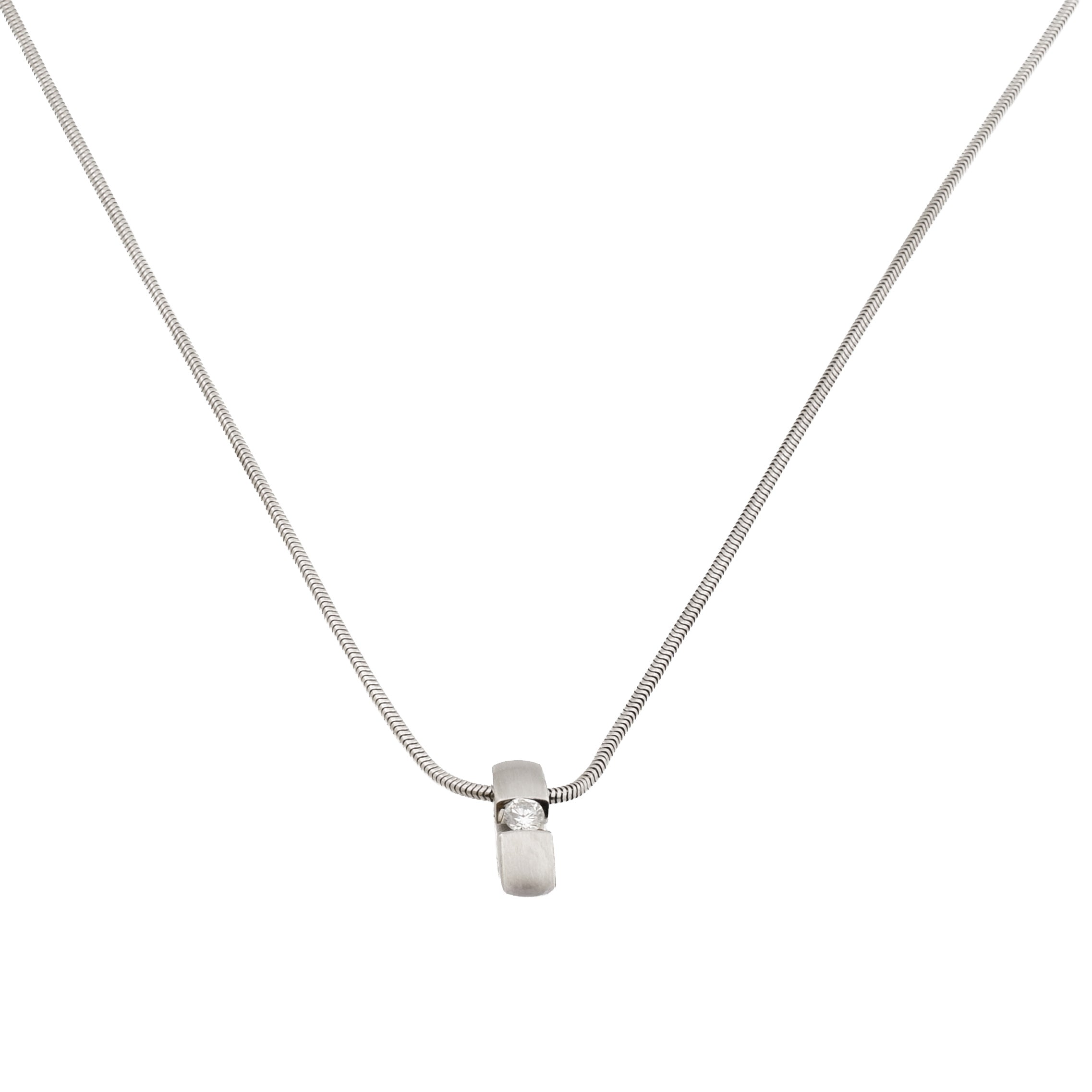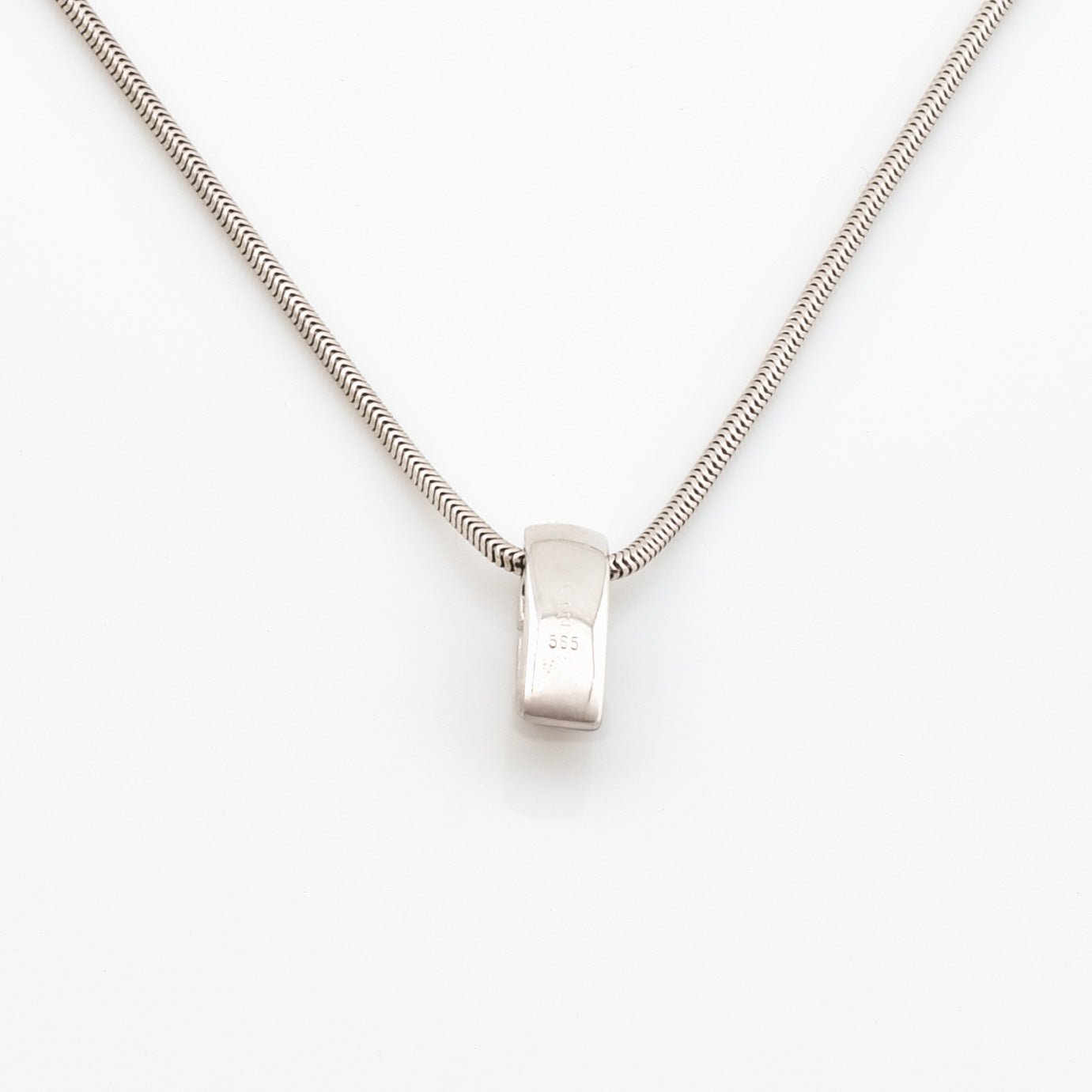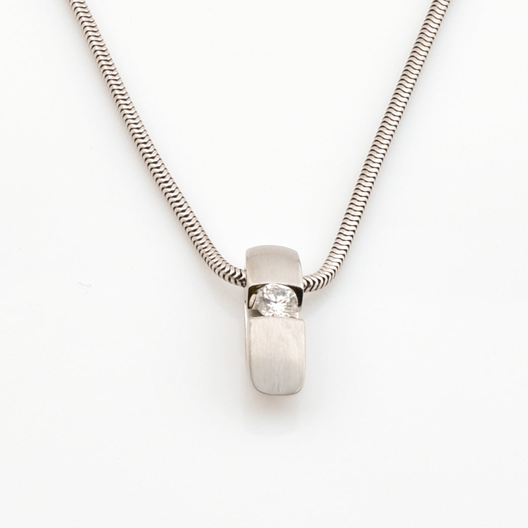 Bei dem Schmuckstück handelt es sich um eine Schlangenkette mit Anhänger aus 585 Weißgold mit einem Brillanten von ca. 0,13 ct in der Qualität Weiß mit sehr kleinen Einschlüssen (W/vs). Das Schmuckstück hat eine Gesamtlänge von 43 cm.