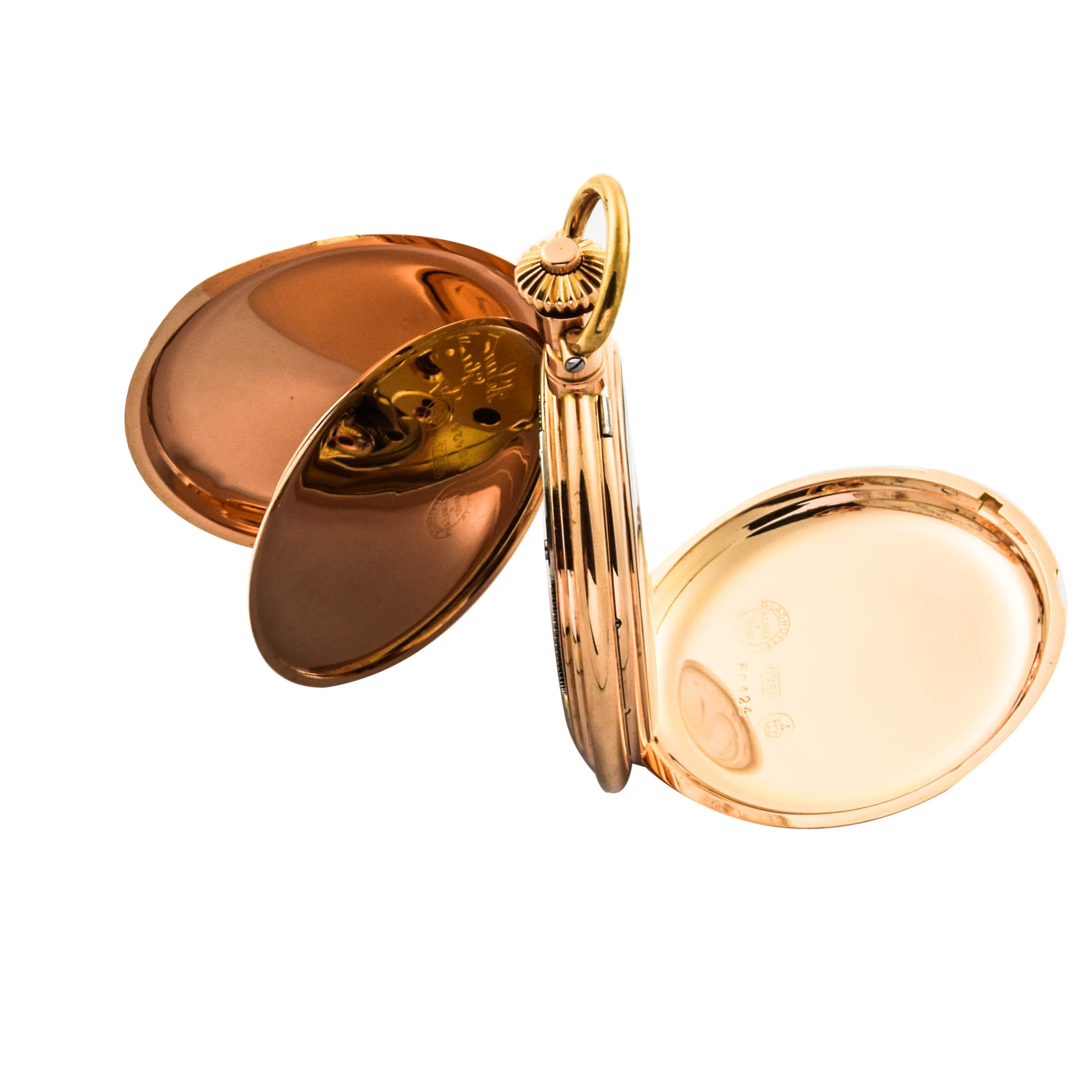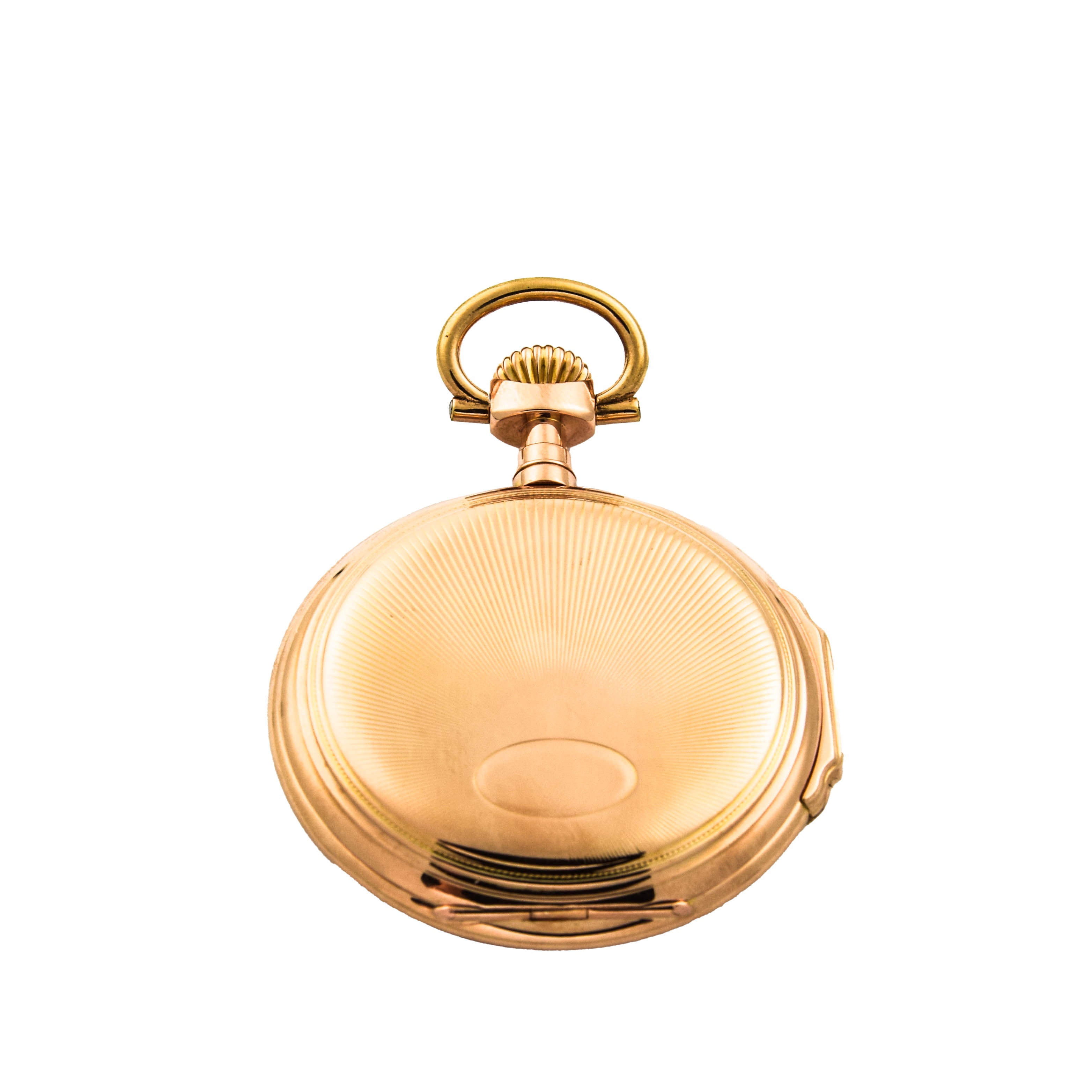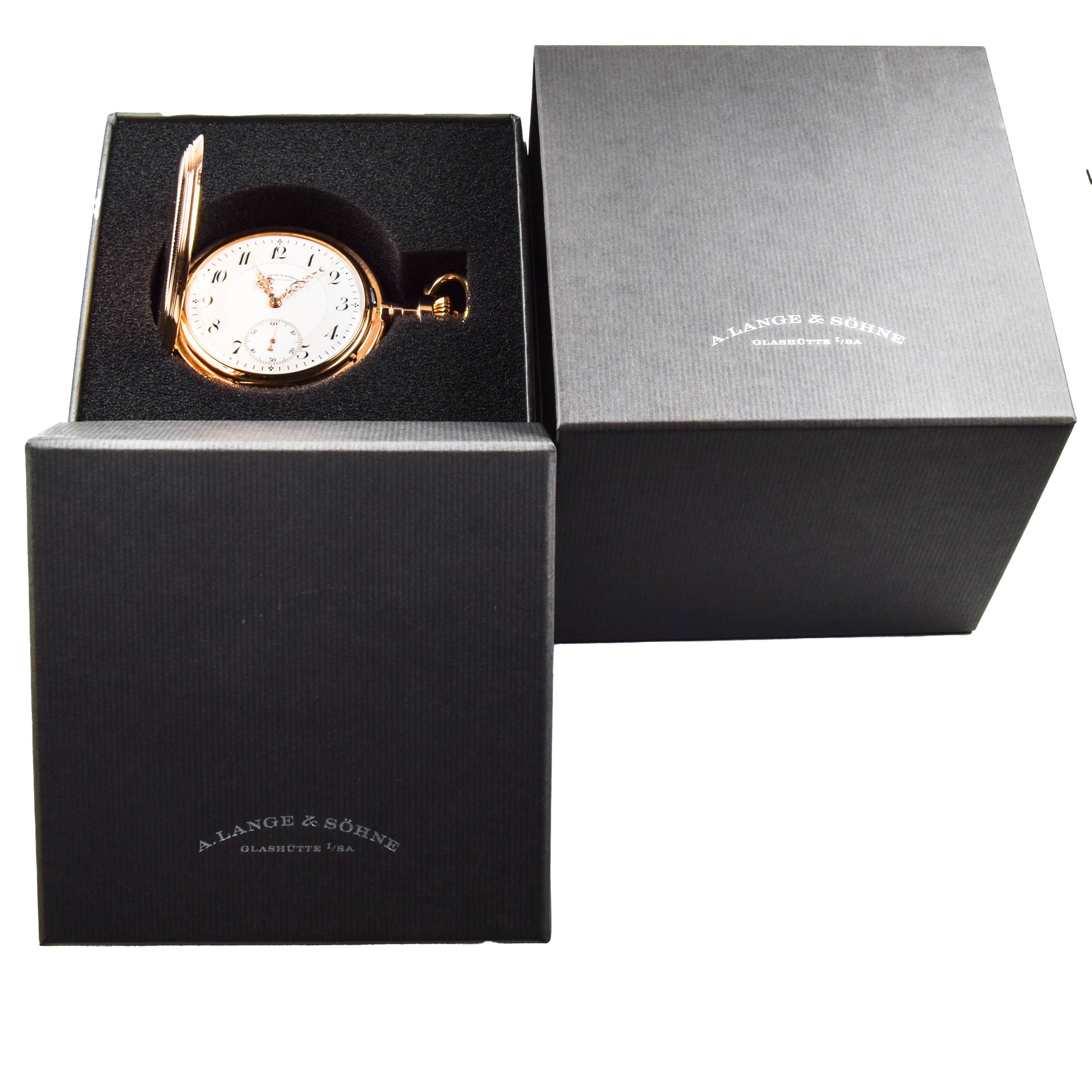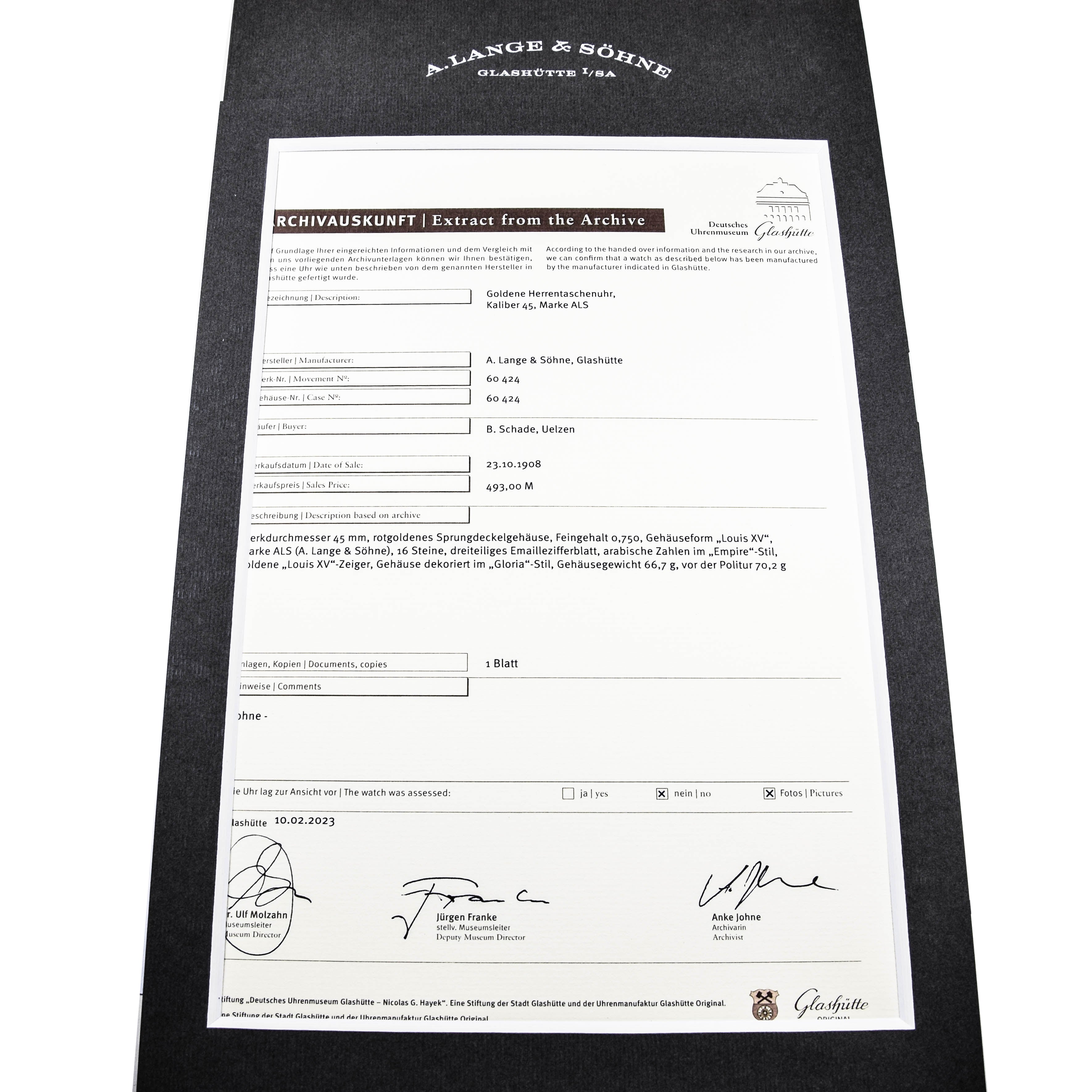 Bei dem Schmuckstück handelt es sich um eine Taschenuhr der Marke A. Lange & Söhne Modell "Louis XV". Das Material der Uhr ist 750 Gelbgold. Sie besitzt ein Handaufzugswerk Kaliber Kaliber 45 mit 16 Steinen. Die Uhr verfügt über eine Kleine Sekunde. Die Armbanduhr ist aus dem Jahr 1908. Es erfolgte eine Revision durch Lange & Söhne. Ein Stammbuchauszug liegt vor.