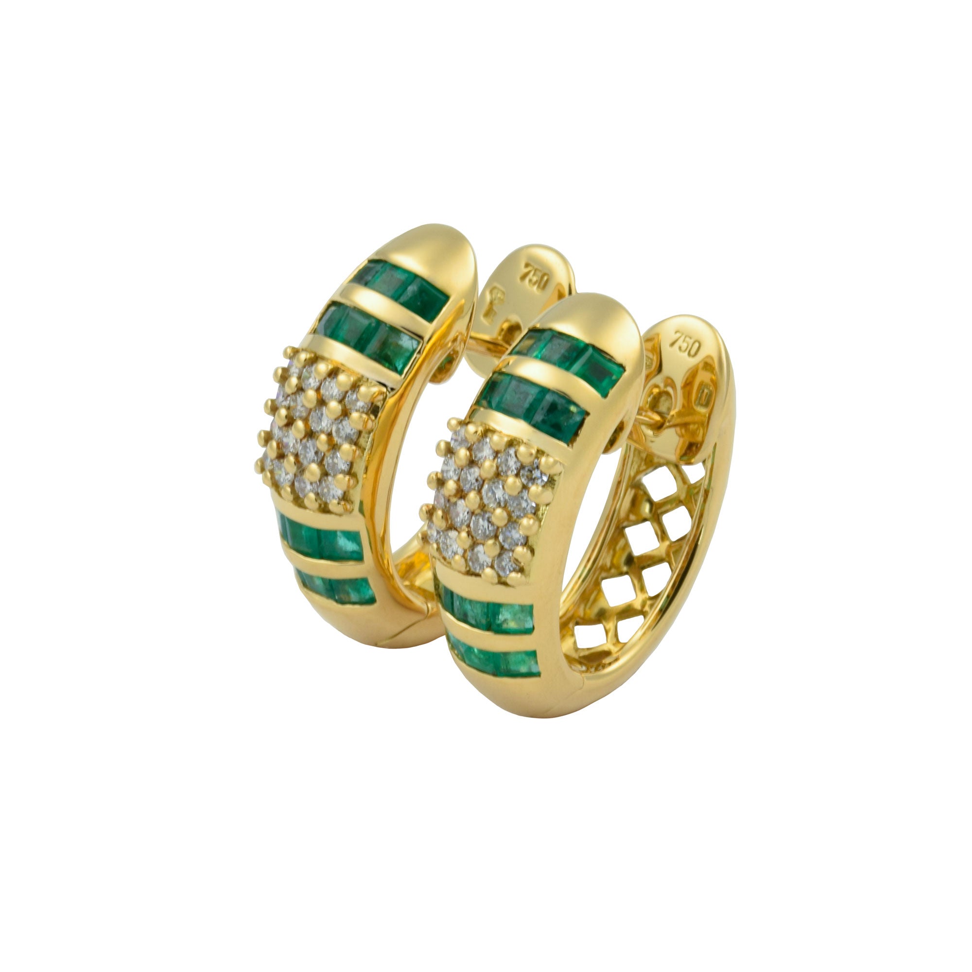 Bei dem Schmuckstück handelt es sich um ein Paar Creolen von Juwelier Christ aus 750 Gelbgold mit 24 Smaragdcarrés und 32 Brillanten von zusammen ca. 0,32 ct in der Qualität Weiß mit kleinen Einschlüssen (W/si).