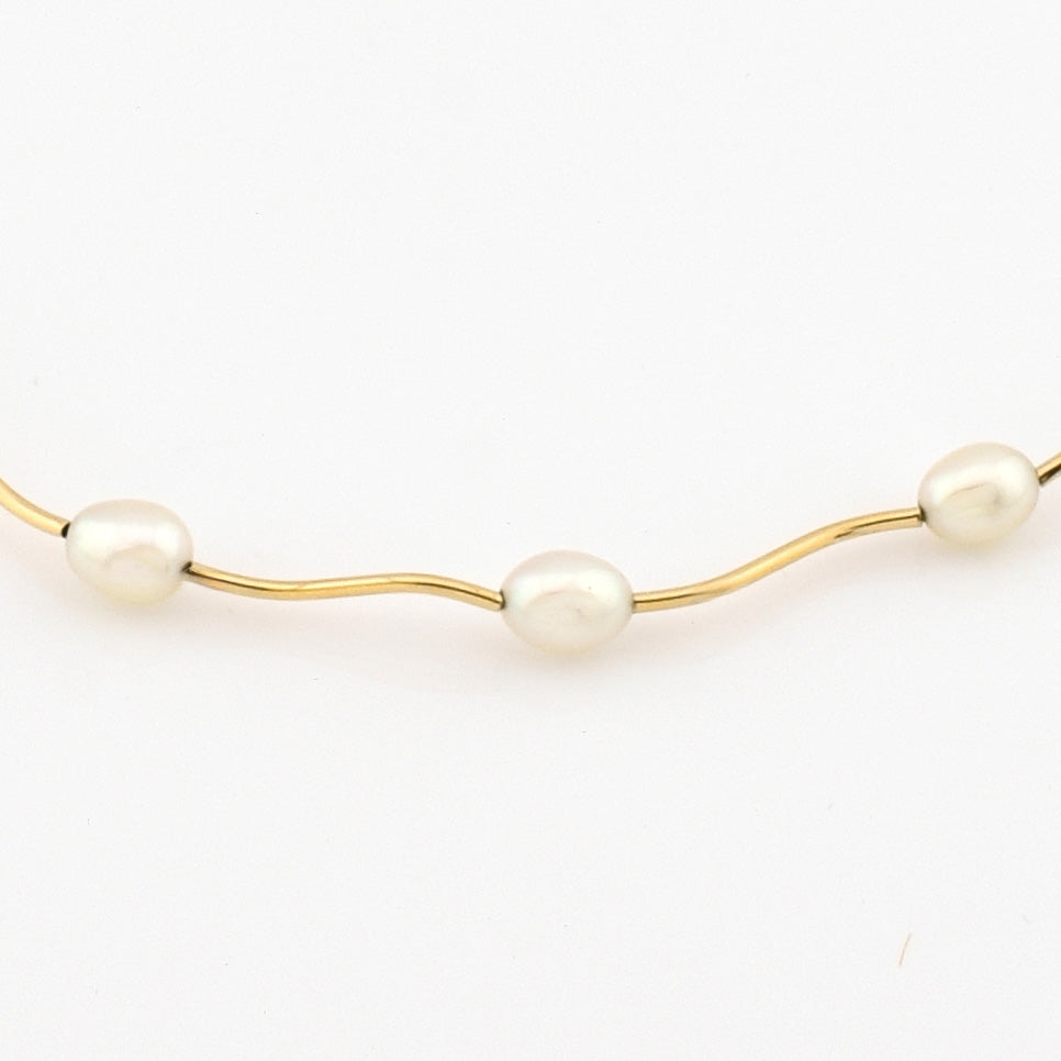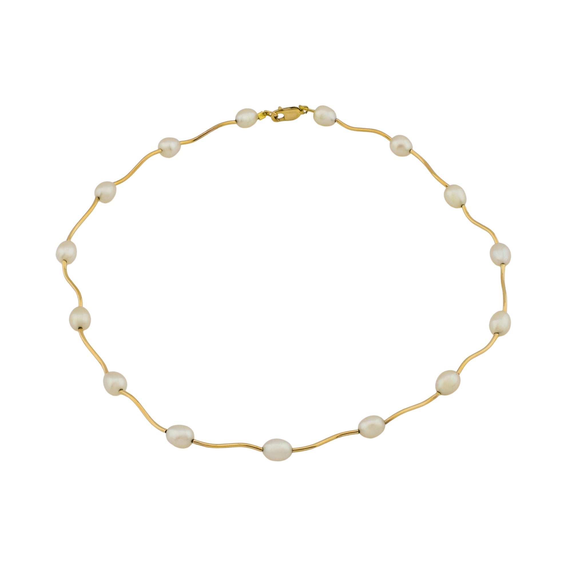 Bei dem Schmuckstück handelt es sich um eine Halskette von Juwelier Christ aus 585 Gelbgold mit 15 Süßwasserzuchtperlen. Das Schmuckstück hat eine Gesamtlänge von 40 cm.