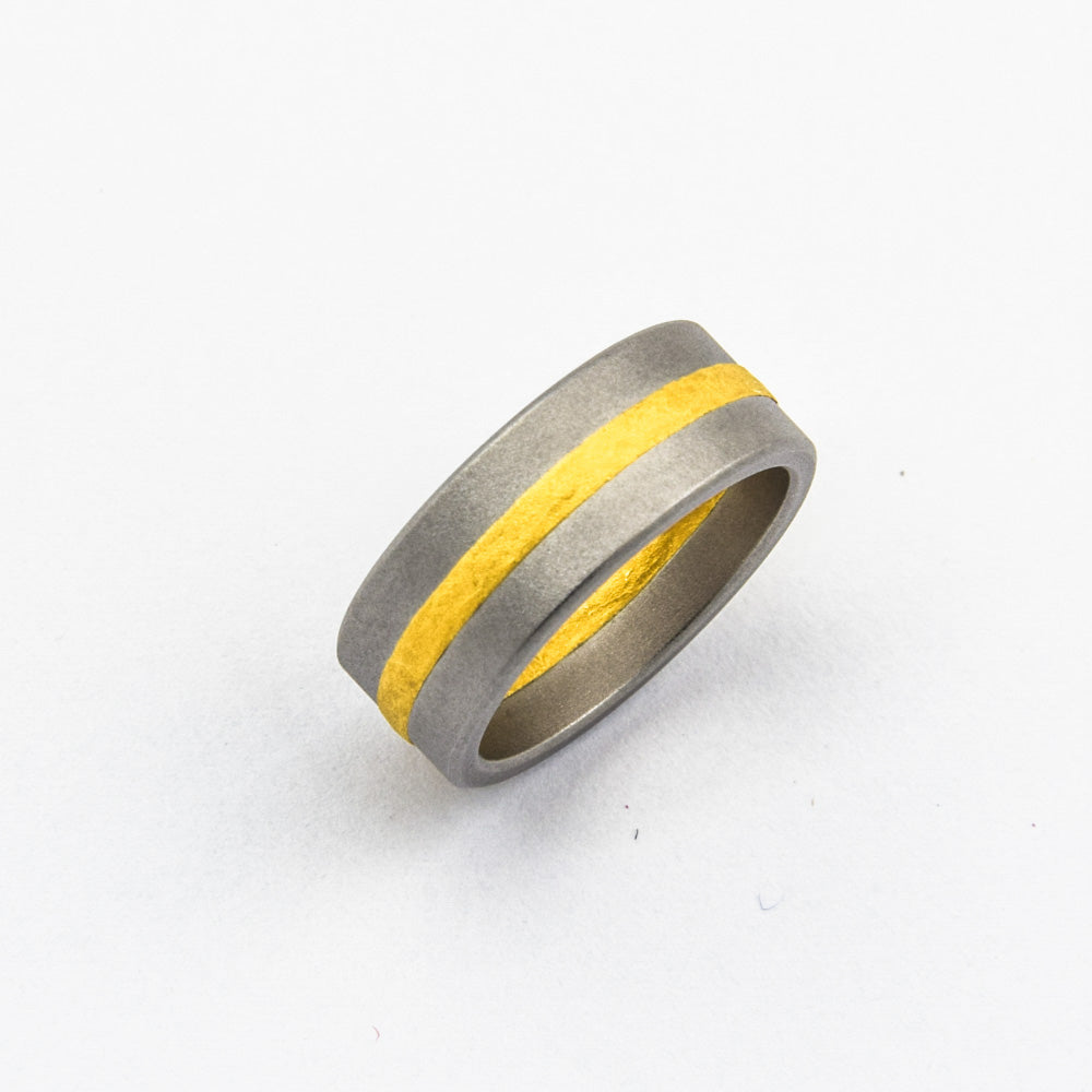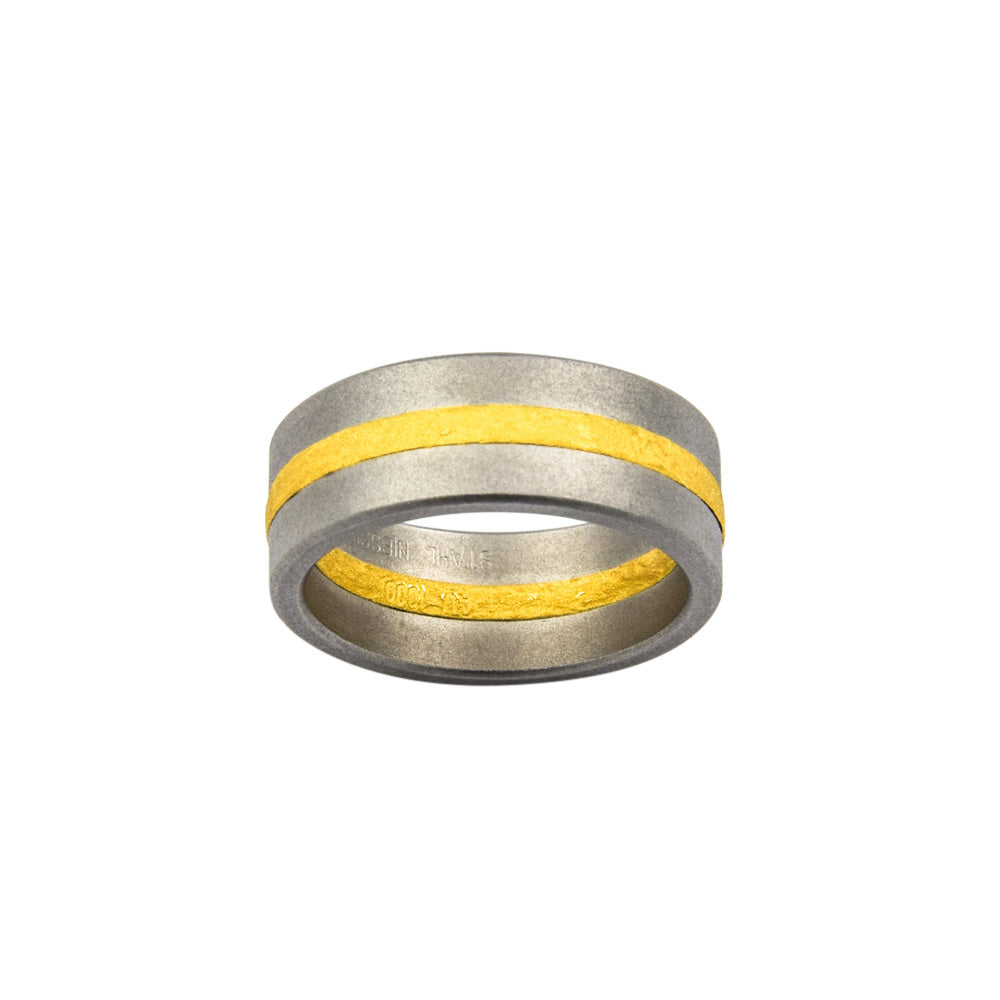 Bei dem Schmuckstück handelt es sich um einen neuwertigen Ring "Fusion" der Manufaktur Niessing aus Edelstahl/1000 Gelbgold.