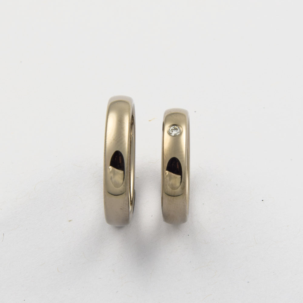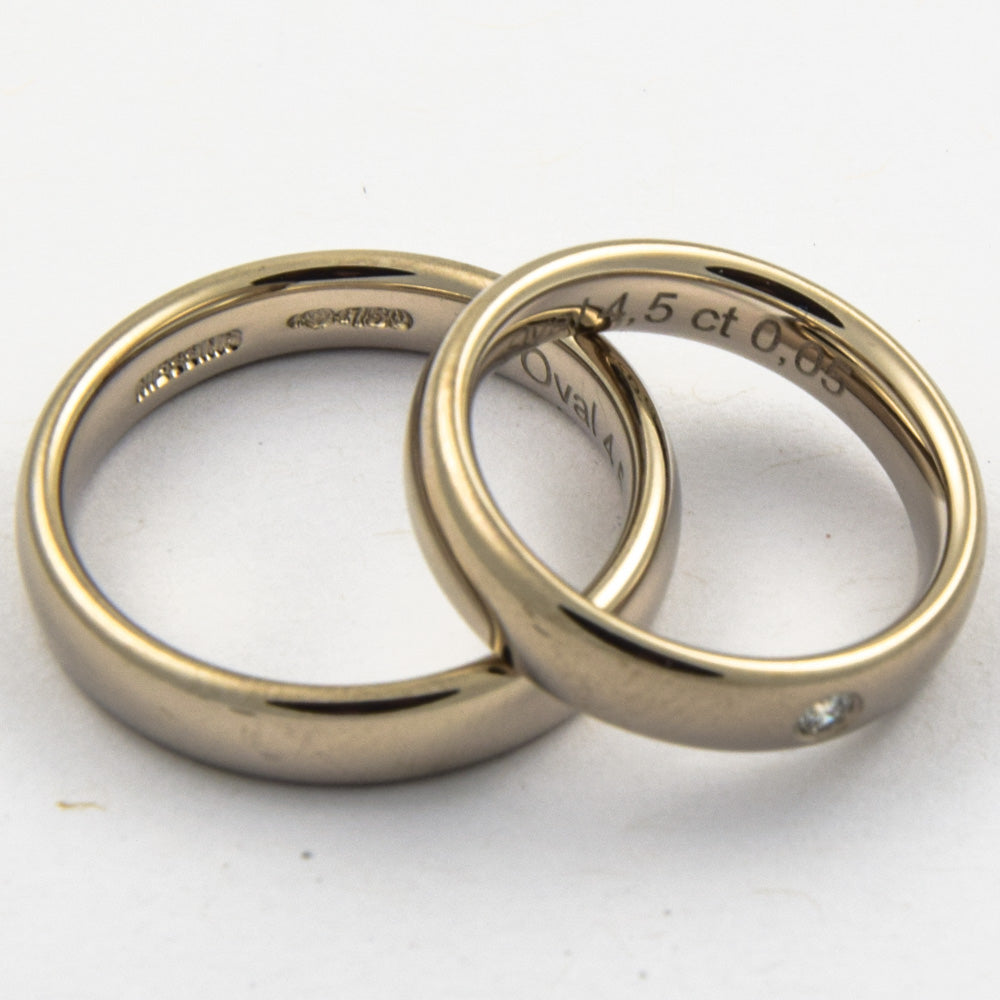 Bei dem Schmuckstück handelt es sich um ein Paar neuwertige Trauringe "Oval" der Manufaktur Niessing aus 750 Graugold mit einem Brillanten von ca. 0,05 ct in der Qualität feines Weiß mit sehr kleinen Einschlüssen (TW/vs).