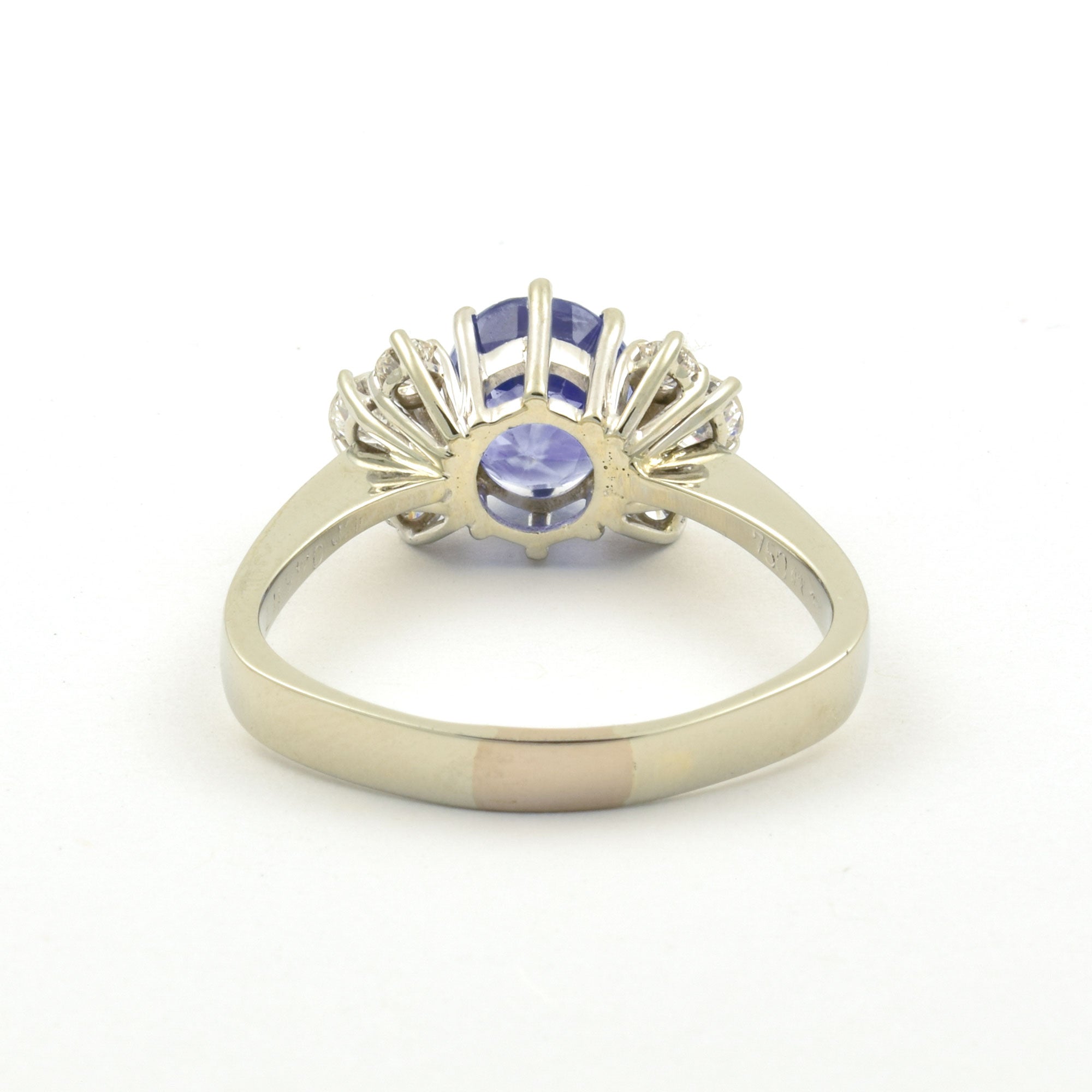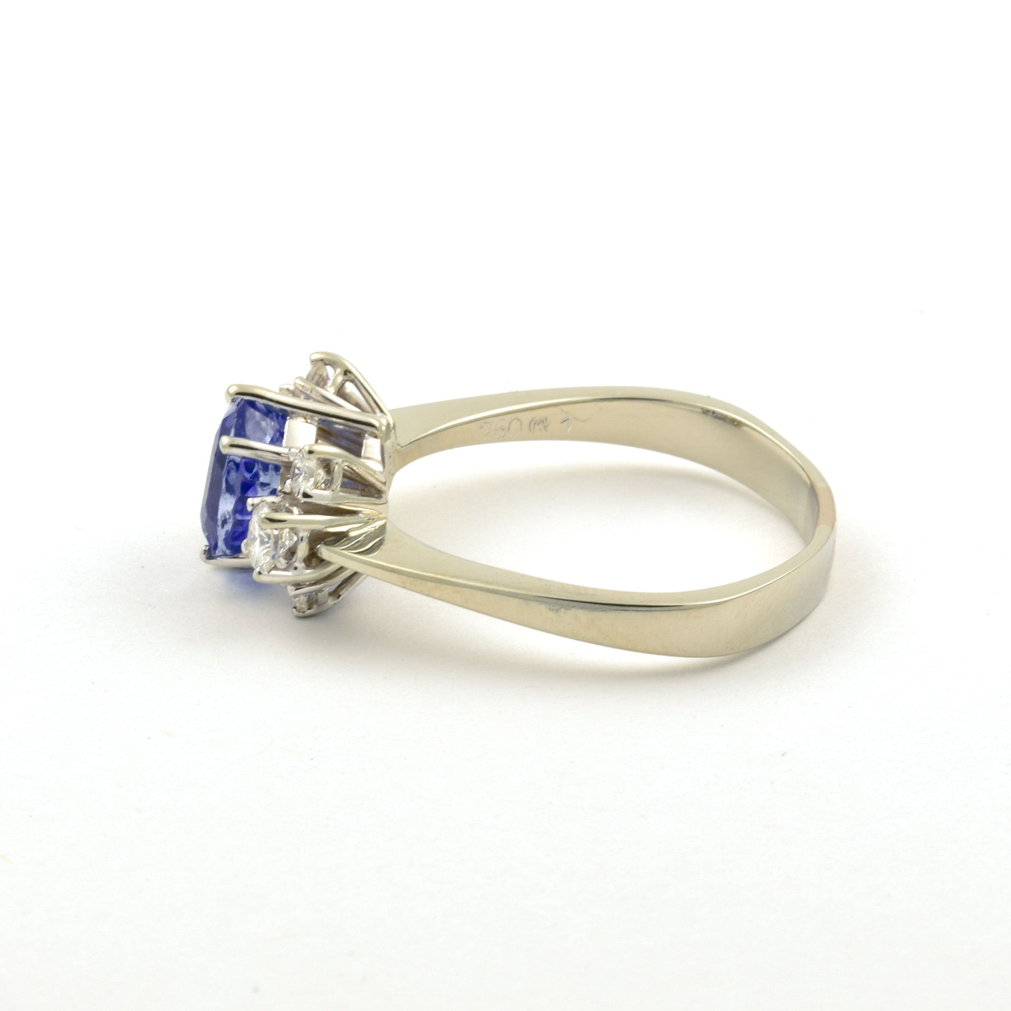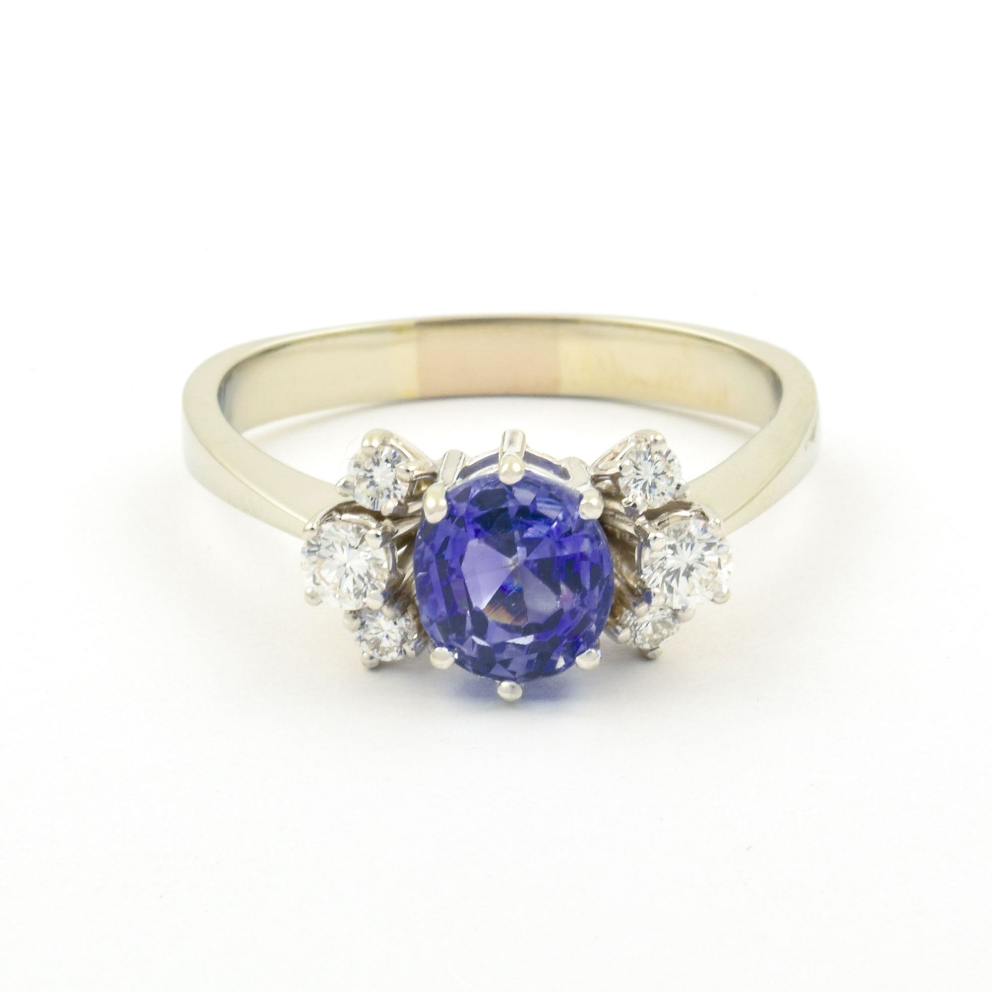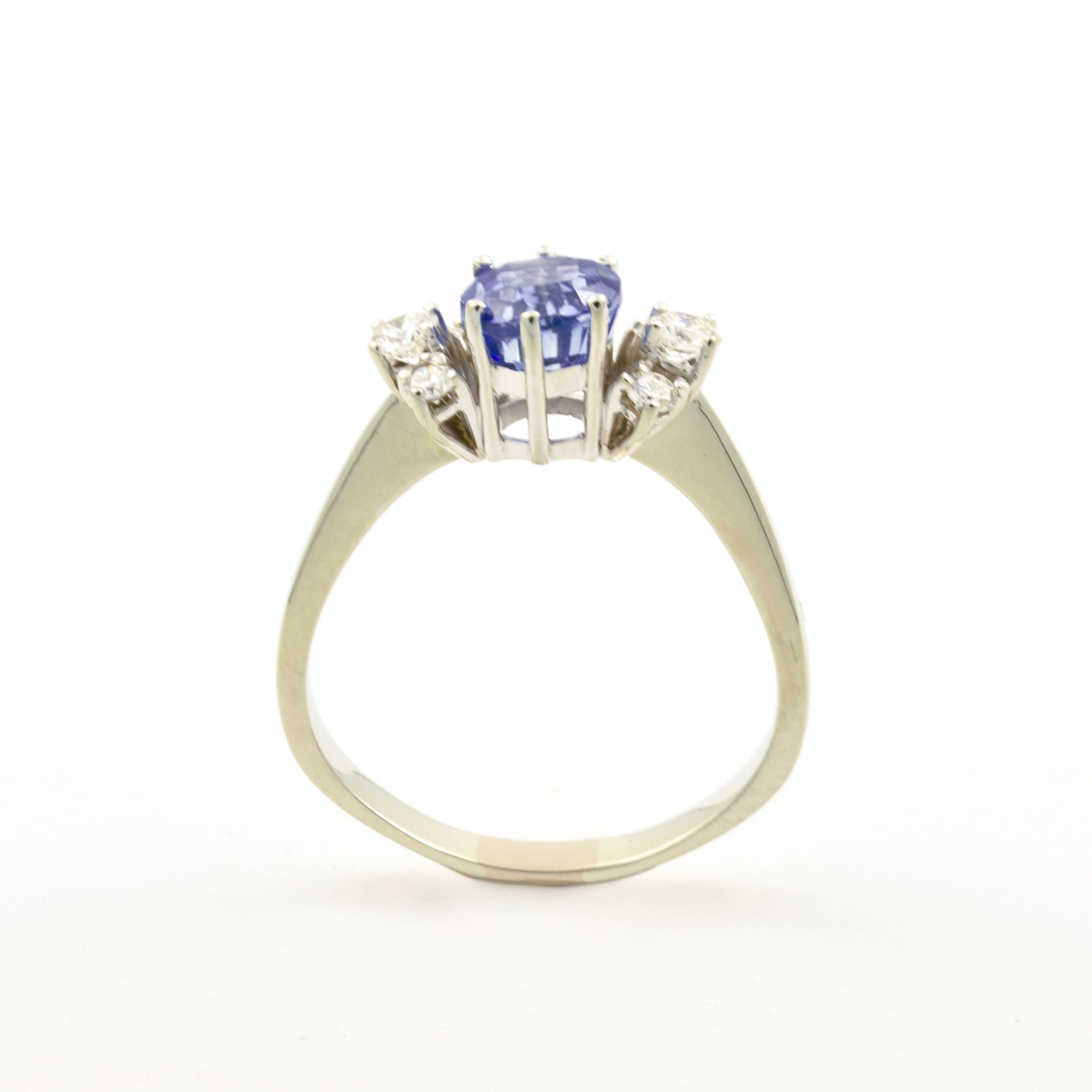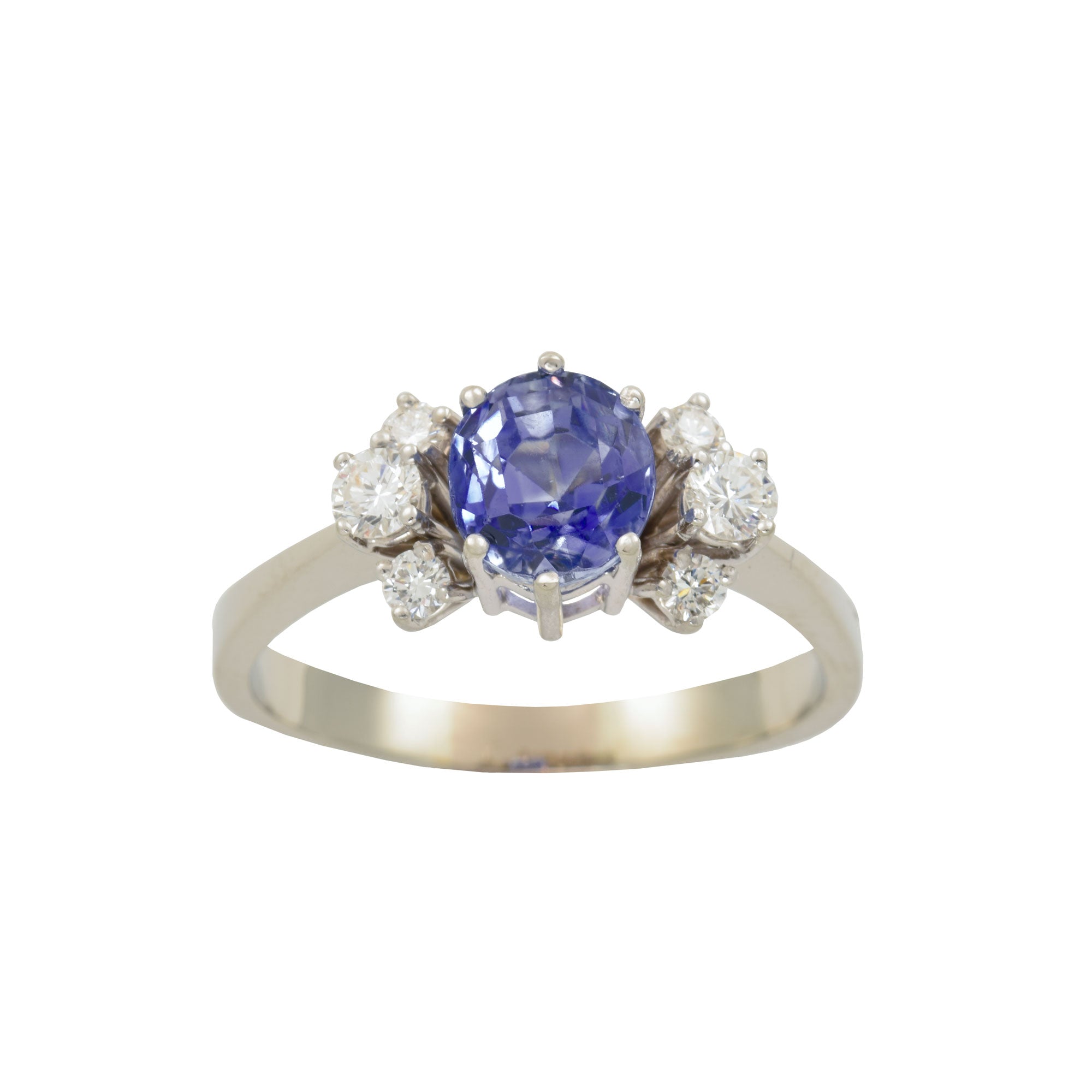 Bei dem Schmuckstück handelt es sich um einen Ring von Juwelier Richarz aus 750 Weißgold mit einem Ceylon Saphir und sechs Brillanten von zusammen ca. 0,46 ct in der Qualität feines Weiß und lupenrein (TW/lupenrein).