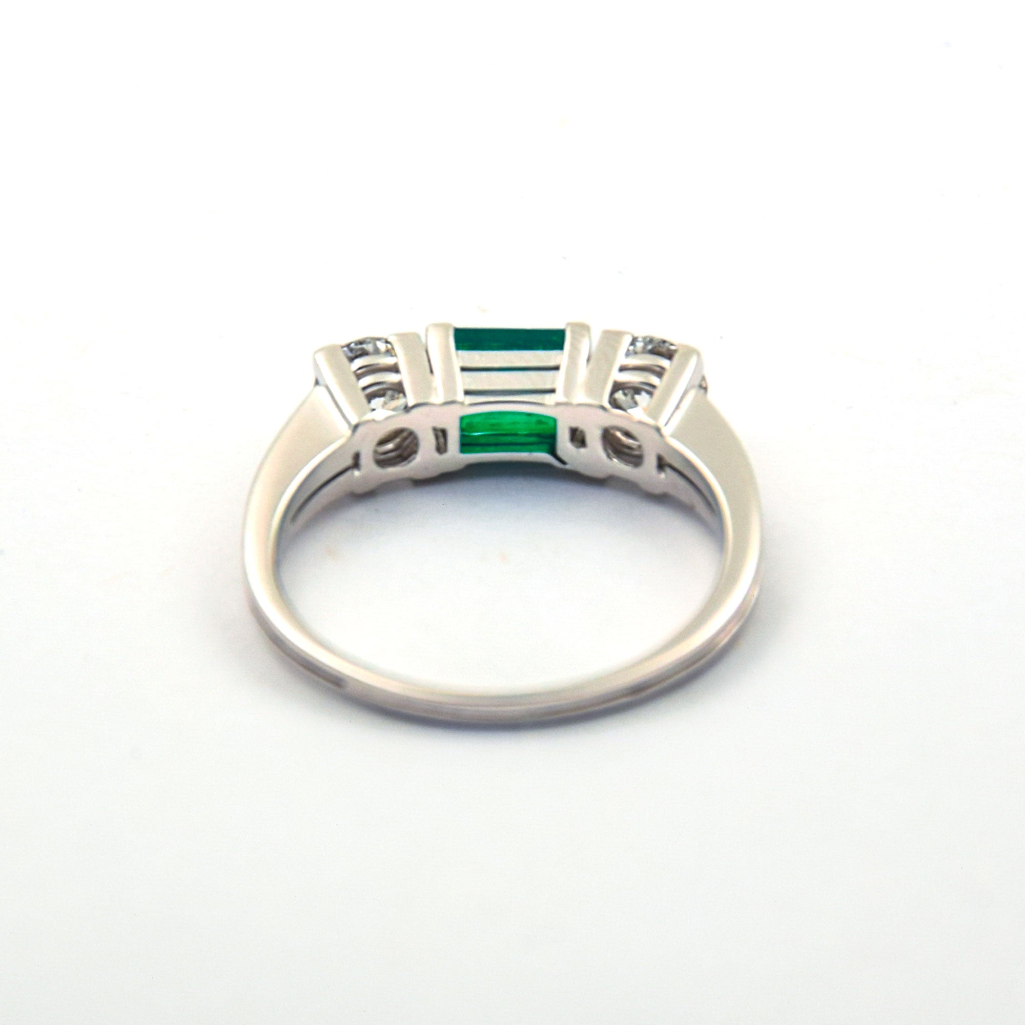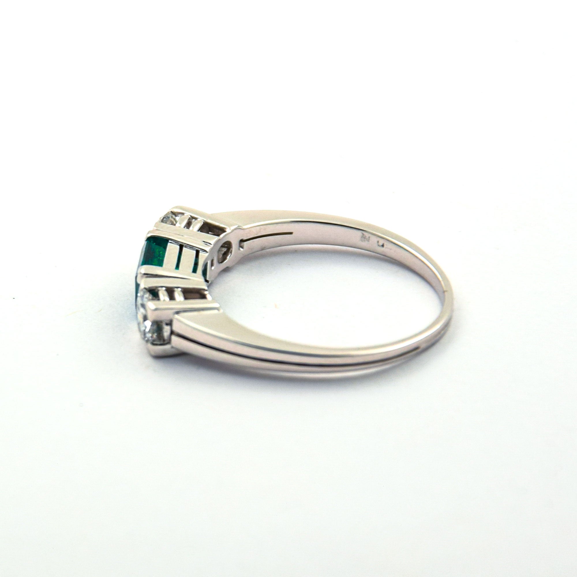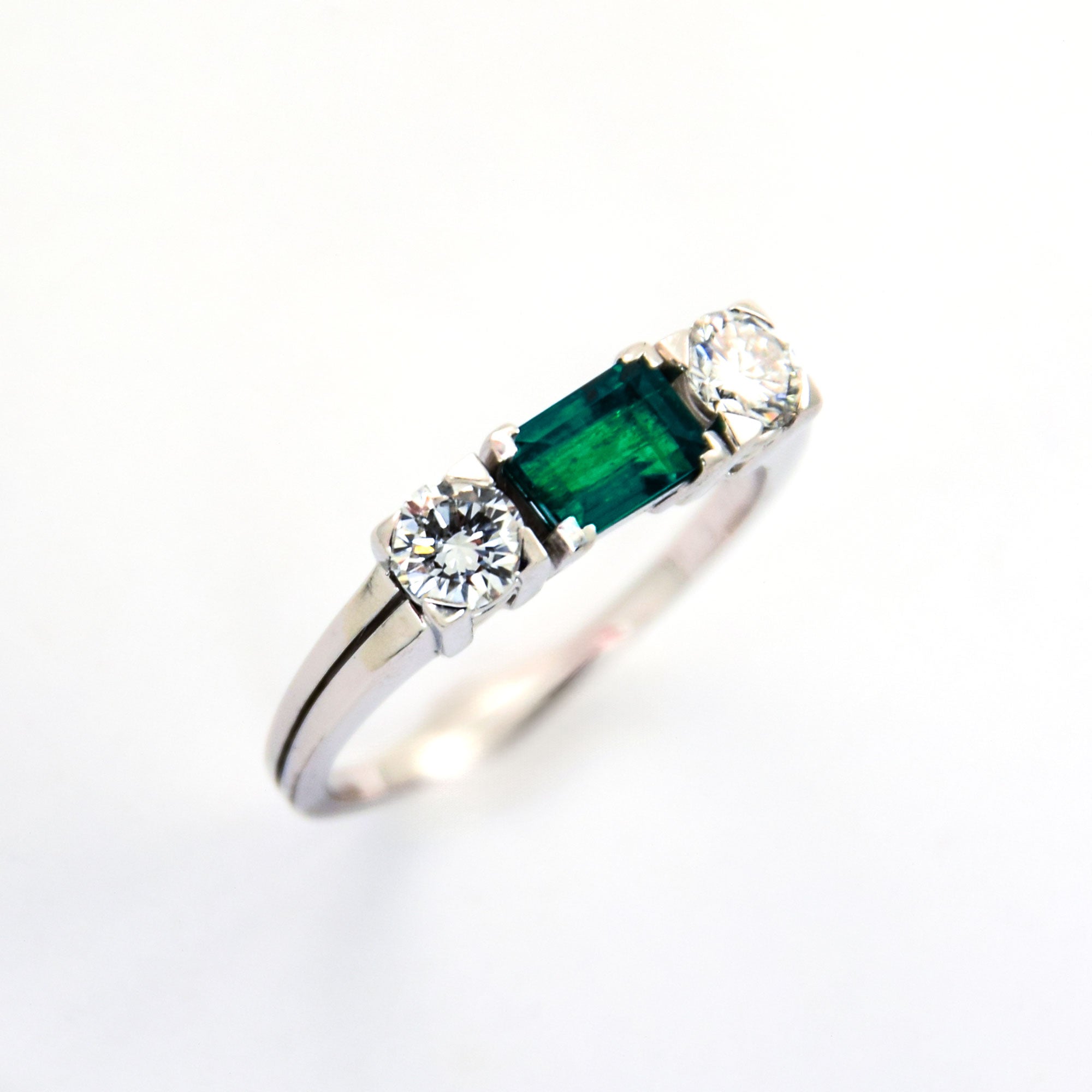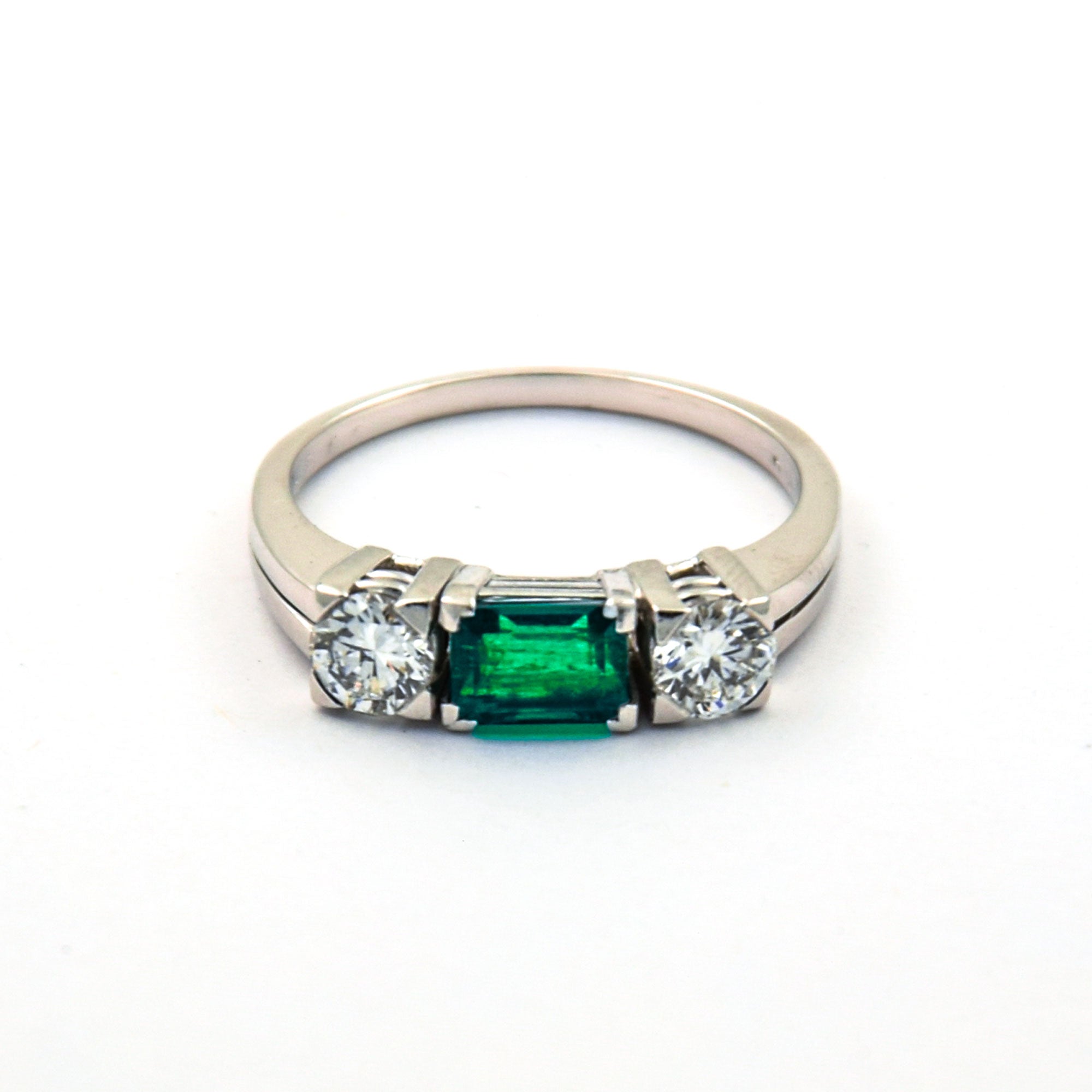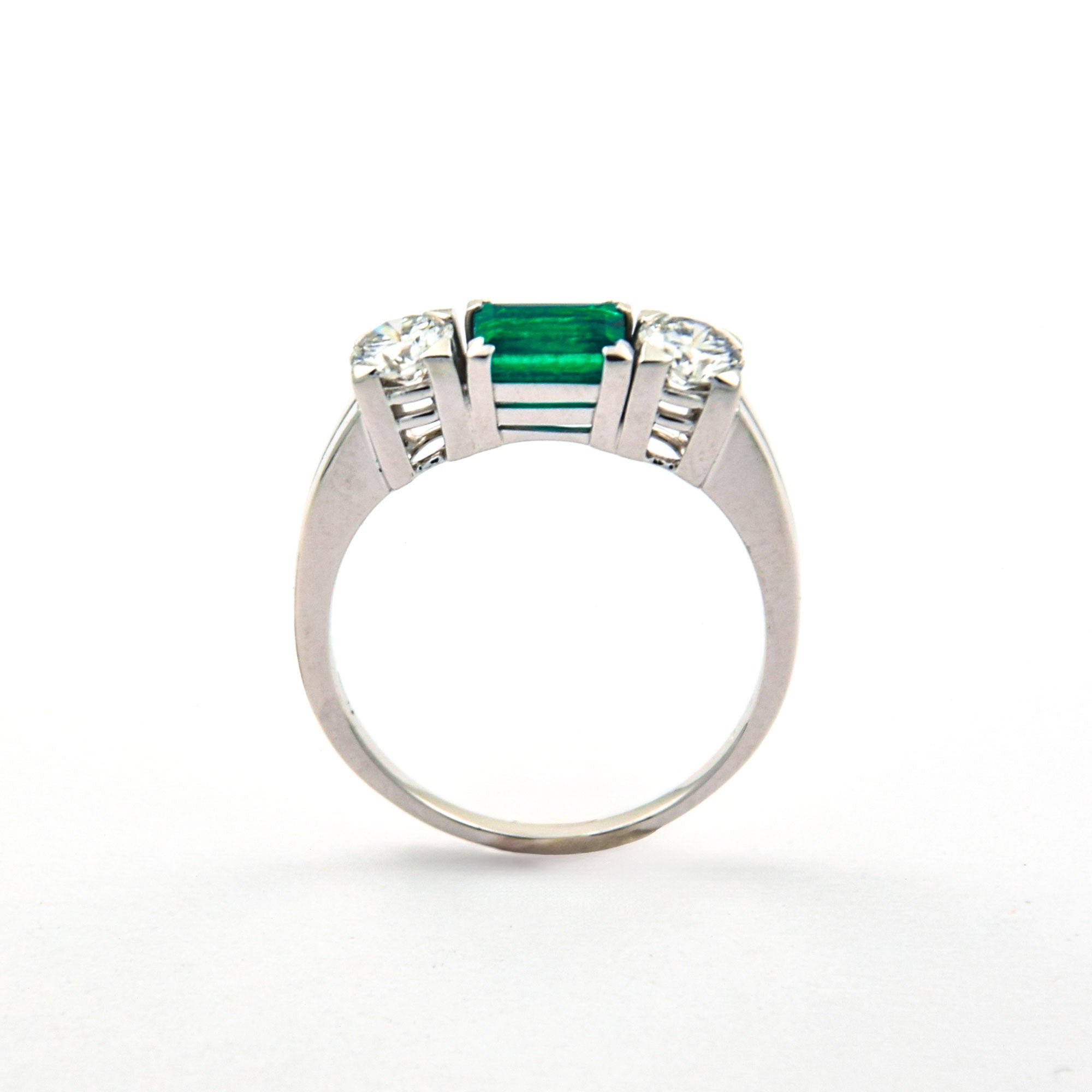 Bei dem Schmuckstück handelt es sich um einen Ring von Juwelier Richarz aus 750 Weißgold mit einem Smaragd von ca. 1,12 ct und zwei Brillanten von zusammen ca. 0,8 ct in der Qualität feines Weiß mit sehr, sehr kleinen Einschlüssen (TW/vvs).
