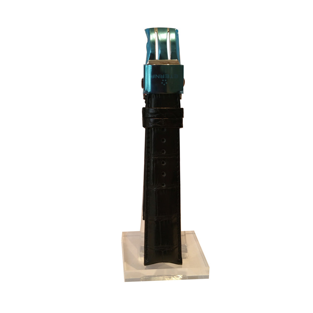 Bei dem Schmuckstück handelt es sich um ein neuwertiges Uhrenarmband der Marke Eterna aus schwarzem Krokodilleder mit Faltschließe aus Edelstahl (Anstoß 22 mm, passend für das Modell Vaughan)