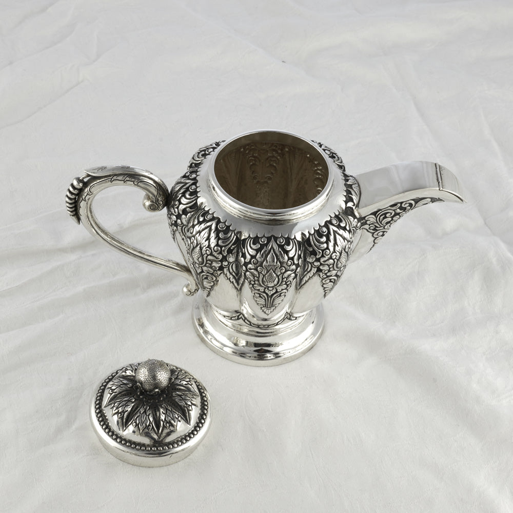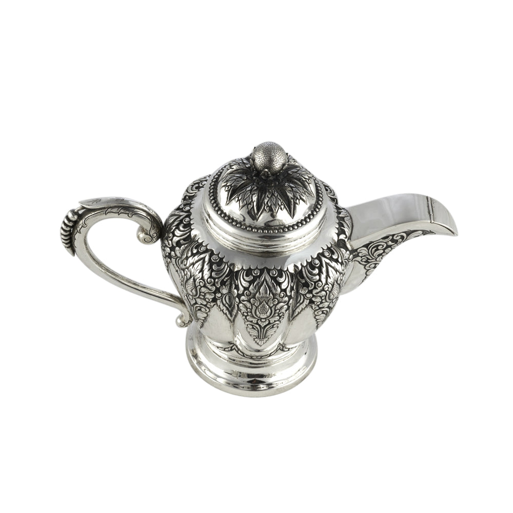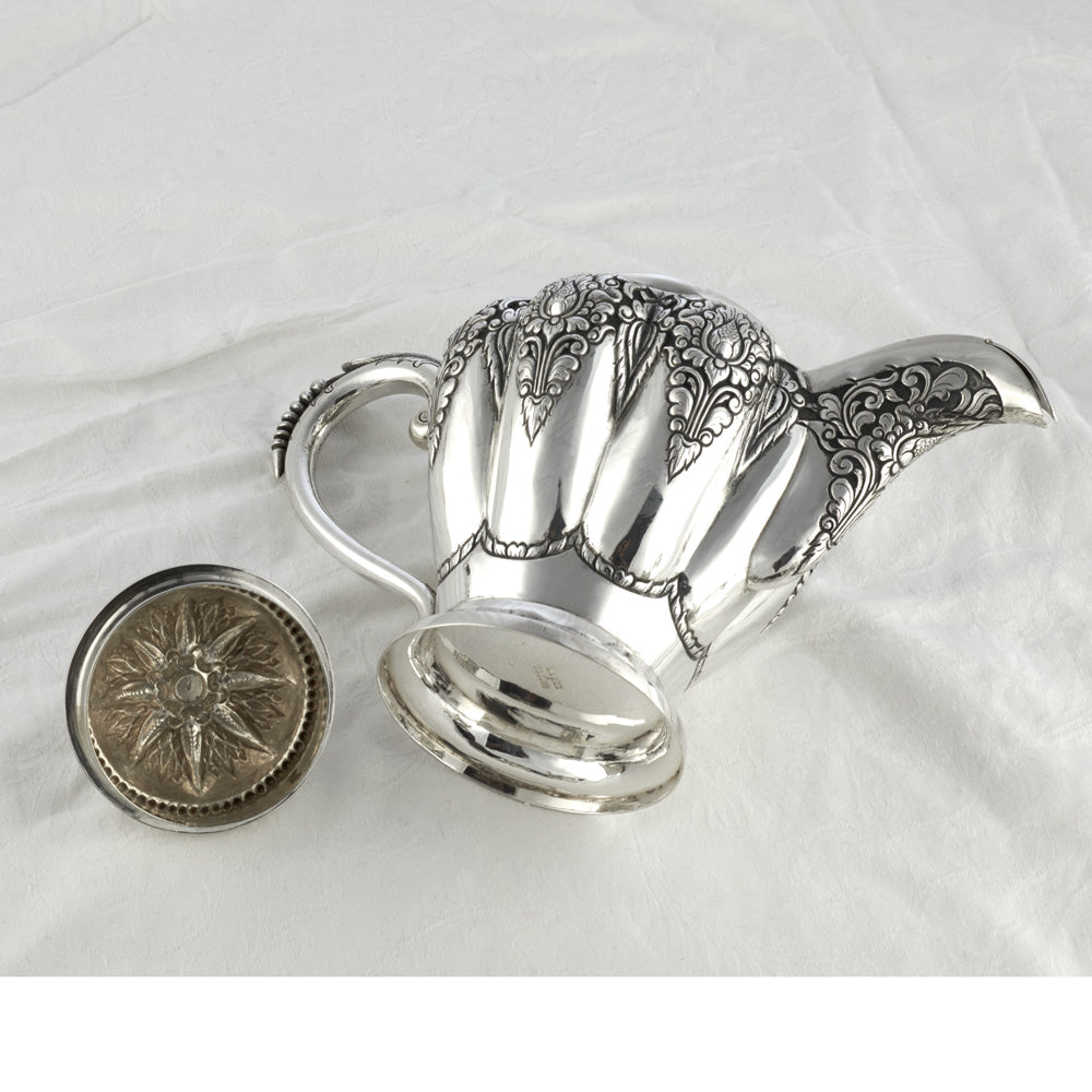 Bei dem Schmuckstück handelt es sich um eine Milchkanne "Deluxe" aus 800 Silber. Das Set mit der Punze DU (vermutlich der Marke Unger & Düring aus der 1. Hälfte des 19. Jahrhunderts) aus einem Tablett, einer Kaffeekanne, einer Michkanne, drei Zuckerdosen, einem Teesieb, sechs Kaffeelöffeln und einem Zuckerlöffel.