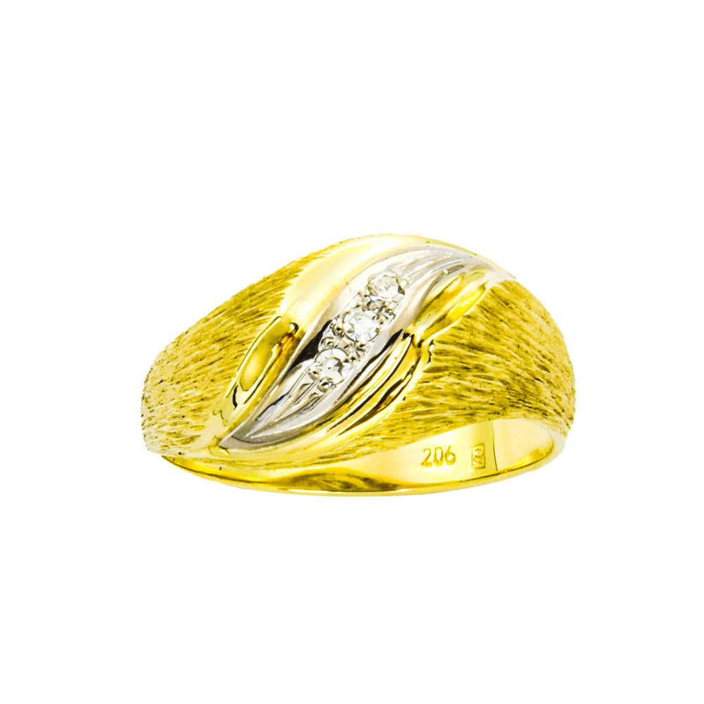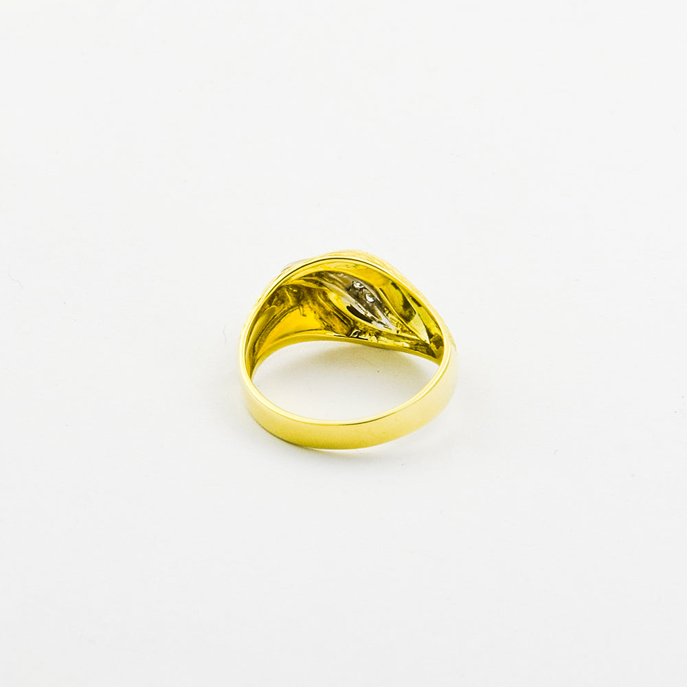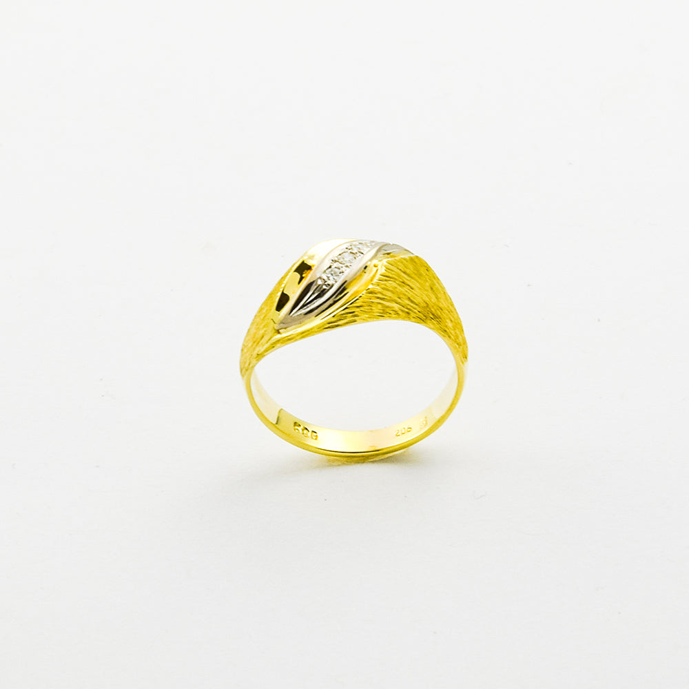 Bei dem Schmuckstück handelt es sich um einen Ring aus 585 Gelb- und Weißgold mit drei Diamanten im 8/8 Schliff von zusammen ca. 0,03 ct in der Qualität Weiß mit kleinen Einschlüssen (W/si).