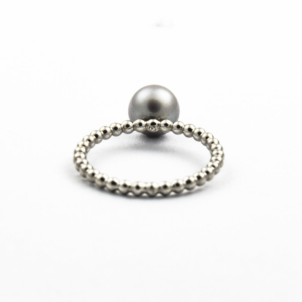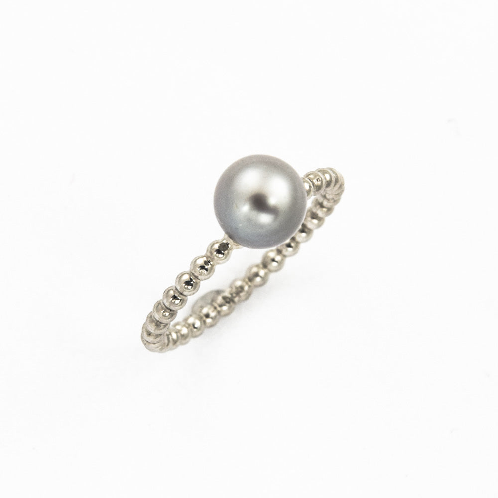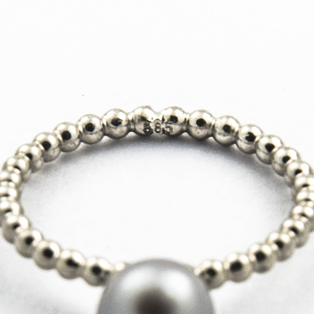 Bei dem Schmuckstück handelt es sich um einen neuwertigen Ring "Perldraht" aus 585 Weißgold mit grauer Süßwasserzuchtperle.