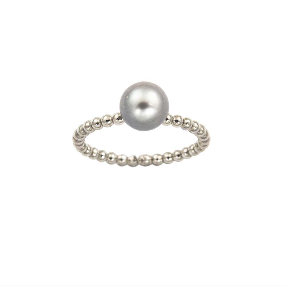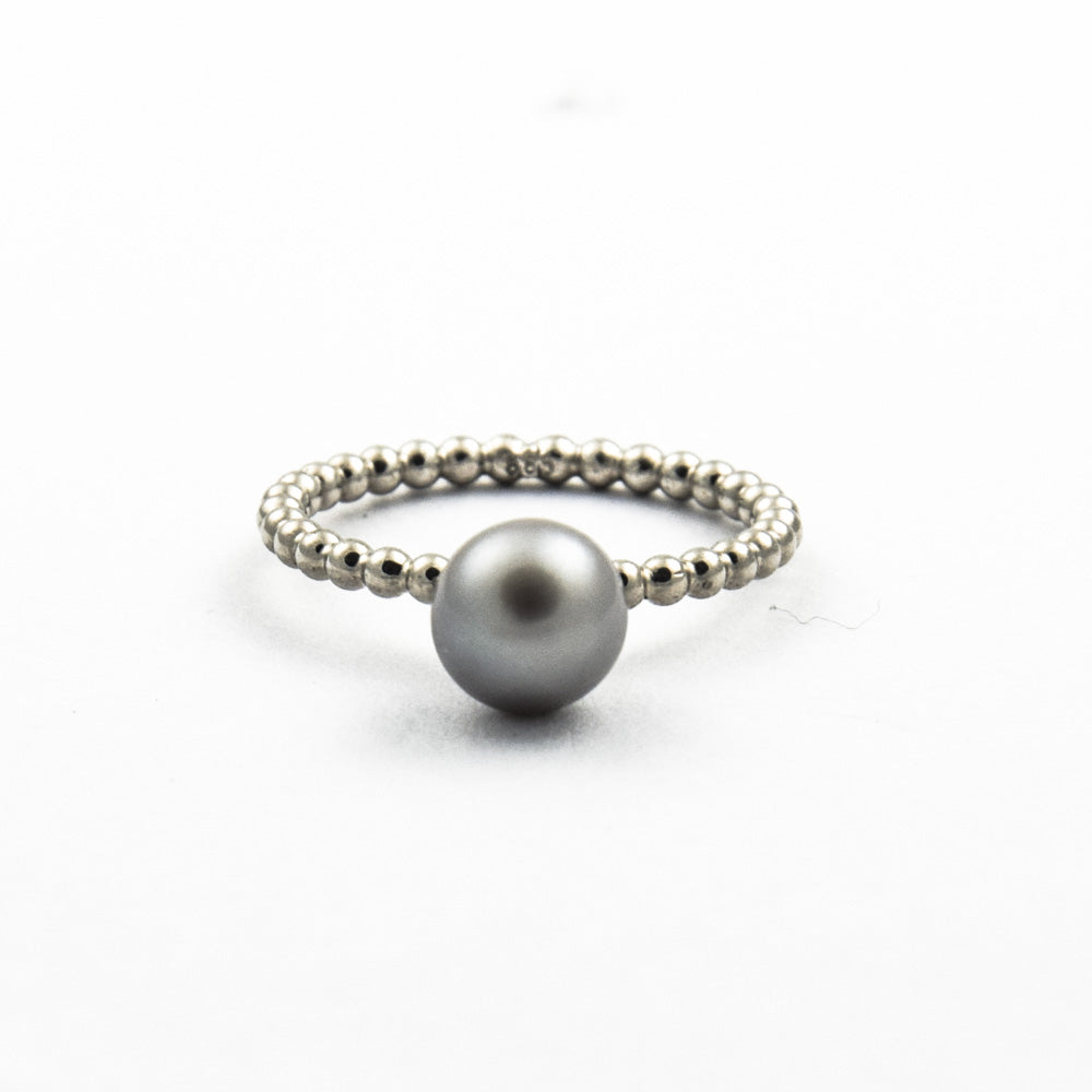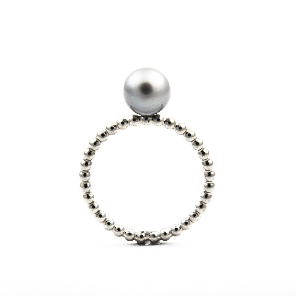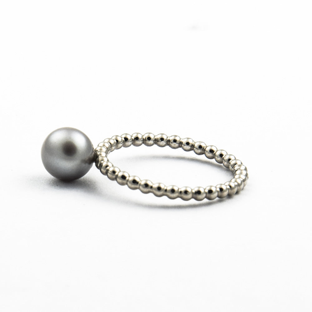 Bei dem Schmuckstück handelt es sich um einen neuwertigen Ring "Perldraht" aus 585 Weißgold mit grauer Süßwasserzuchtperle.