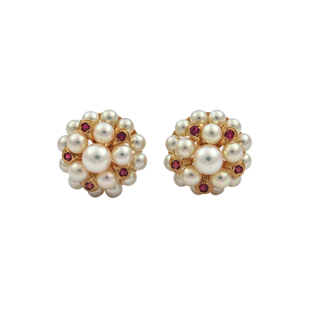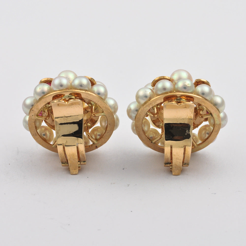 Bei dem Schmuckstück handelt es sich um ein Paar Ohrclips aus 585 Rotgold mit zehn Rubinen und 36 Akoyazuchtperlen.