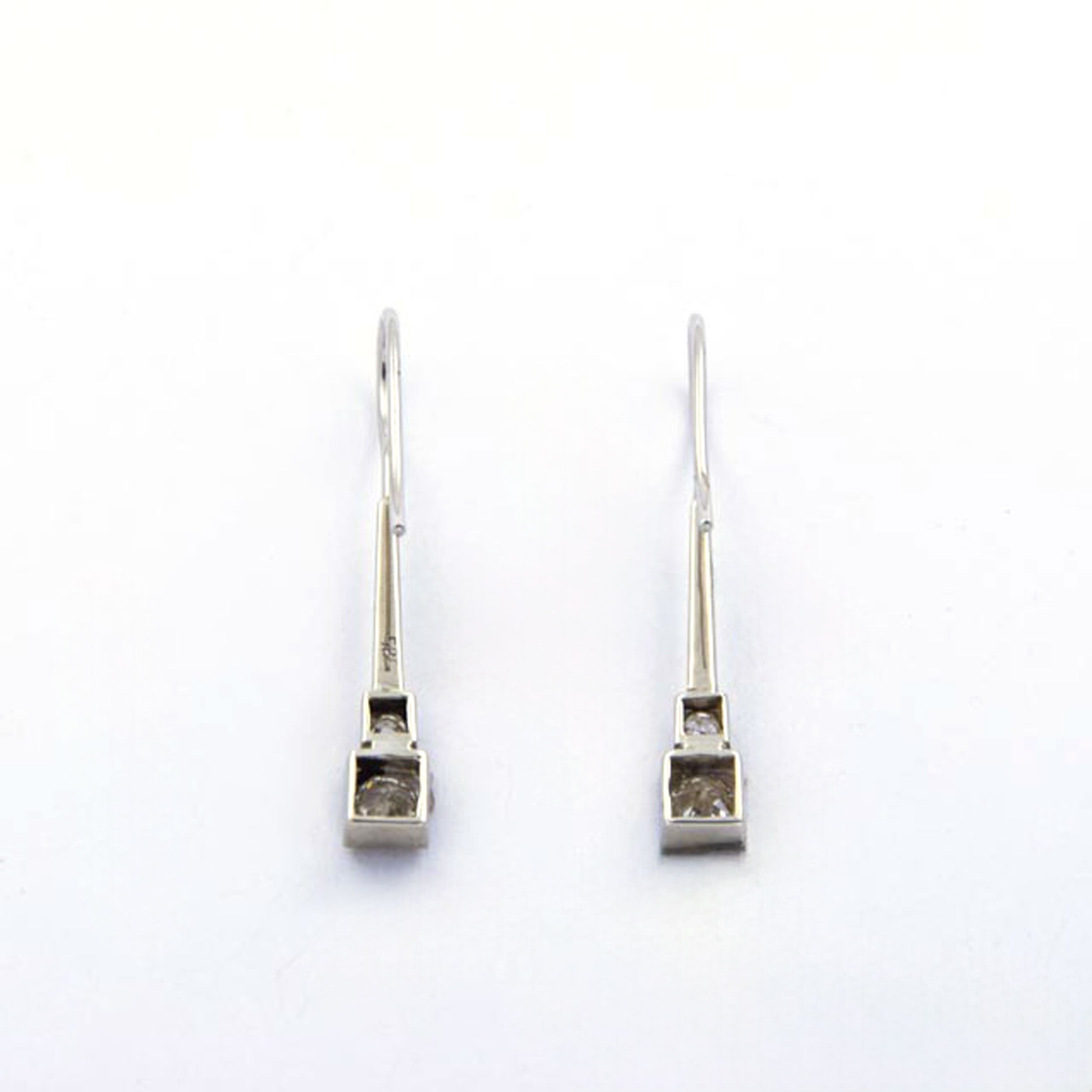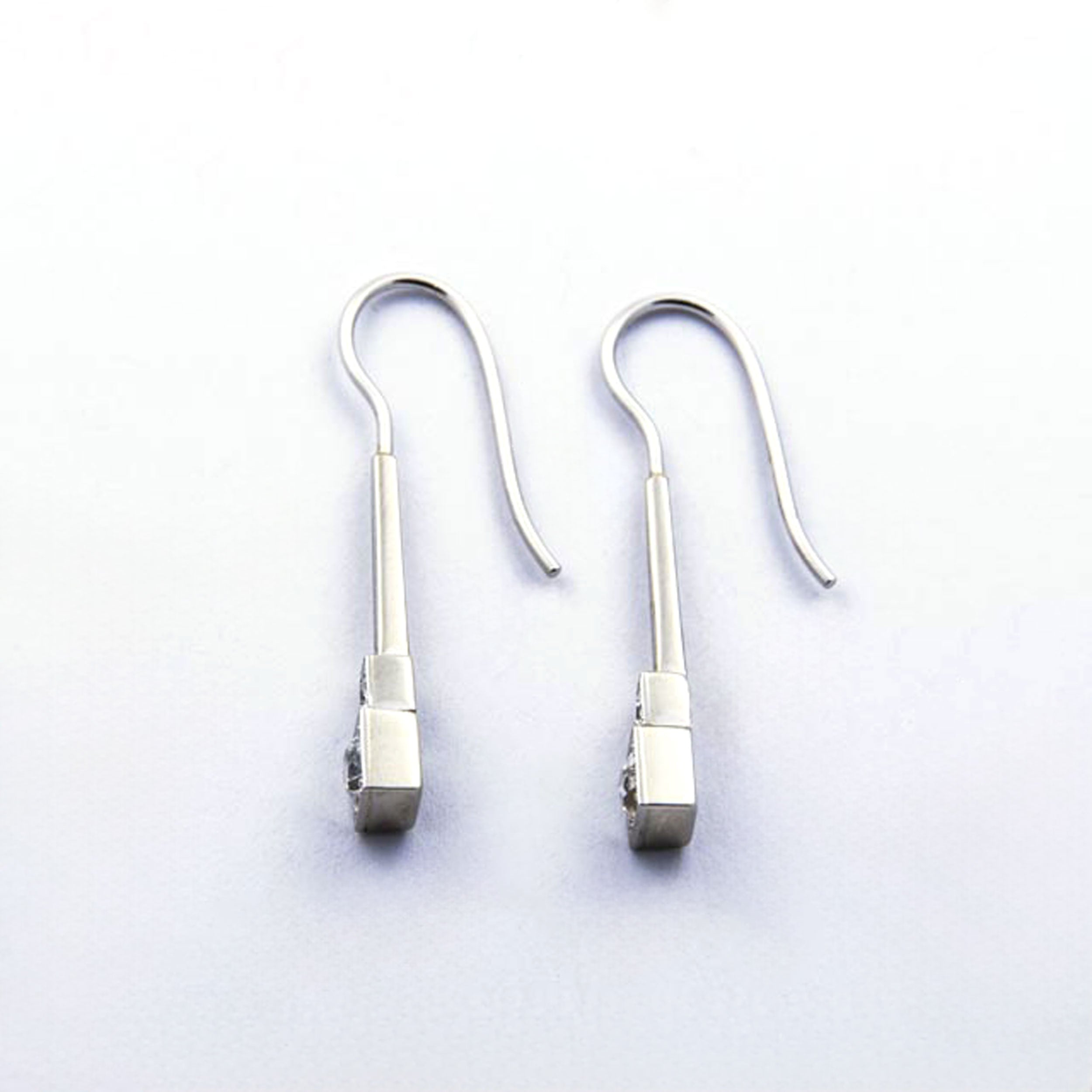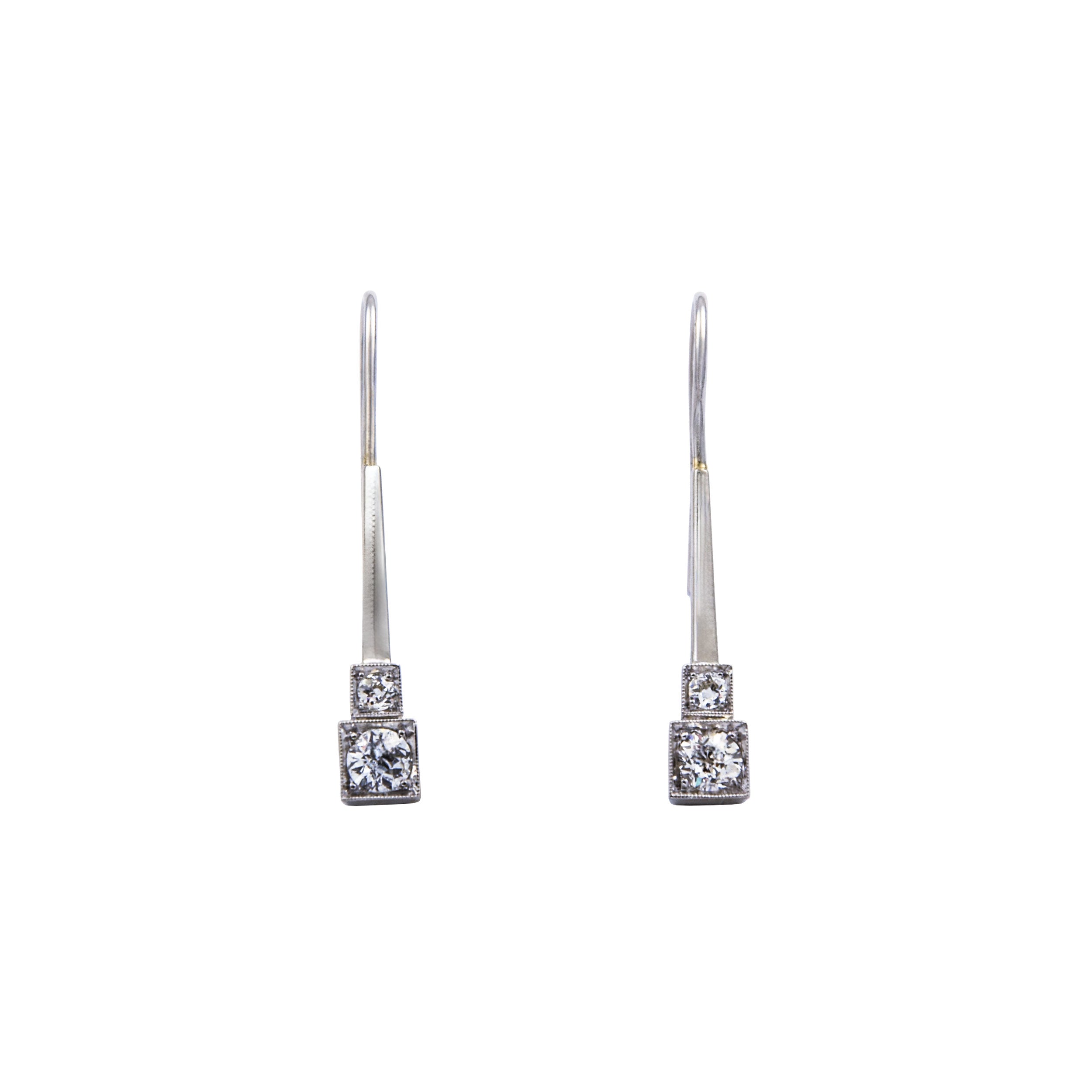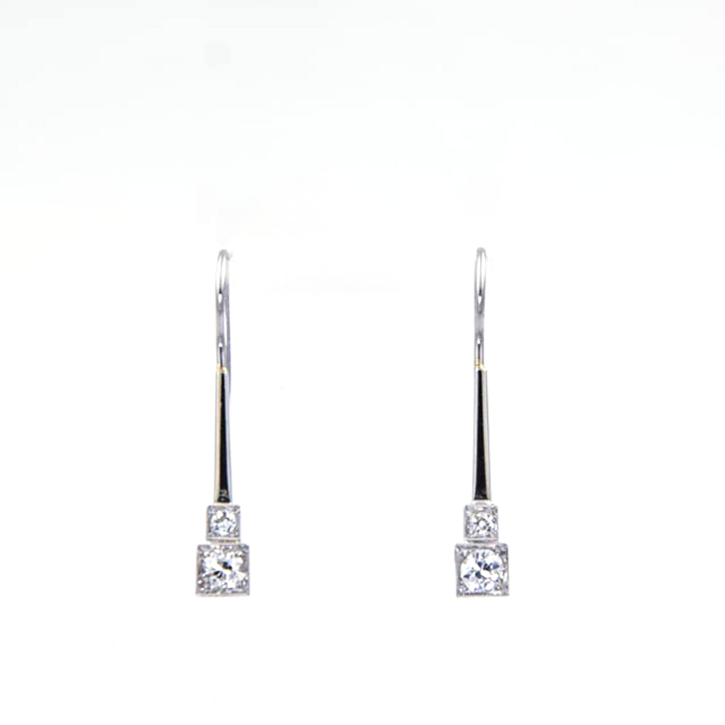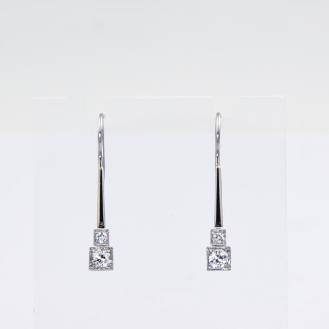 Bei dem Schmuckstück handelt es sich um ein Paar Ohrhänger aus 585 Weißgold und Platinbügeln mit vier Brillanten im Altschliff von zusammen ca. 0,9 ct in der Qualität Weiß mit kleinen Einschlüssen (W/si).
