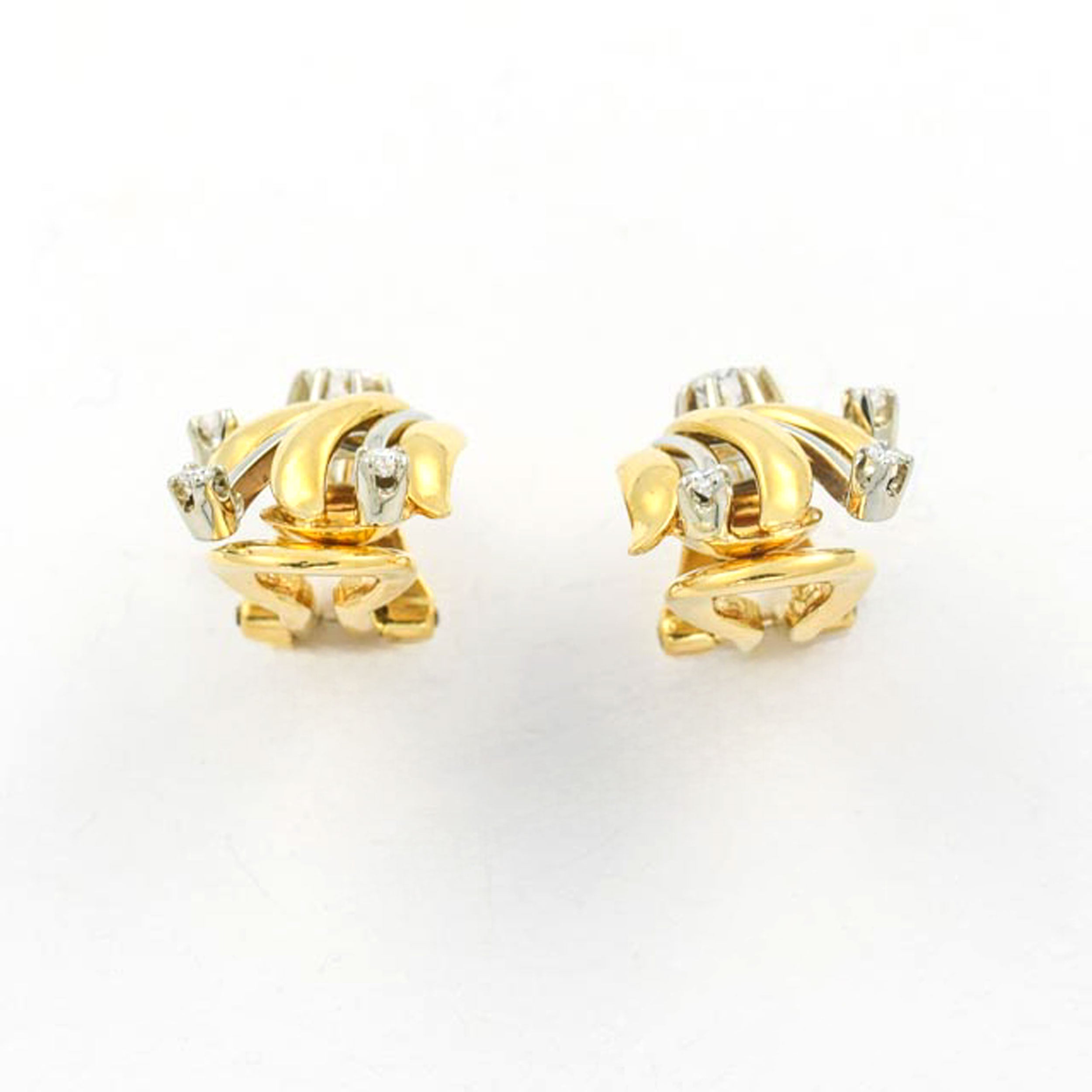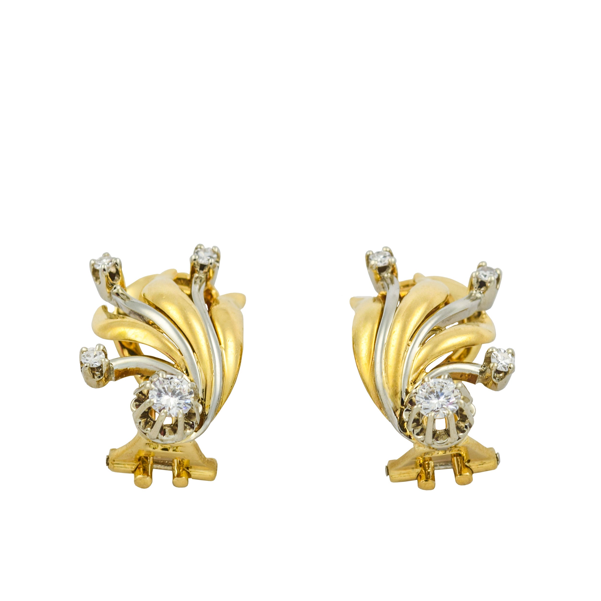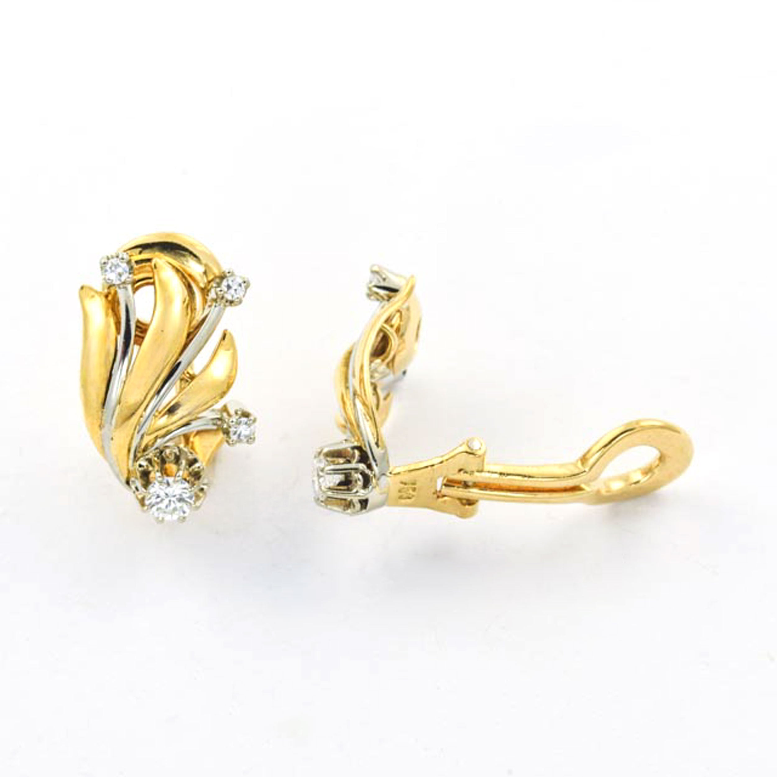 Bei dem Schmuckstück handelt es sich um ein Paar Ohrclips aus 750 Gelb- und Weißgold mit zwei Brillanten von zusammen ca. 0,2 ct in der Qualität Weiß mit kleinen Einschlüssen (W/si) und sechs Diamanten im 8/8 Schliff von zusammen ca. 0,06 ct in der Qualität Weiß mit kleinen Einschlüssen (W/si).