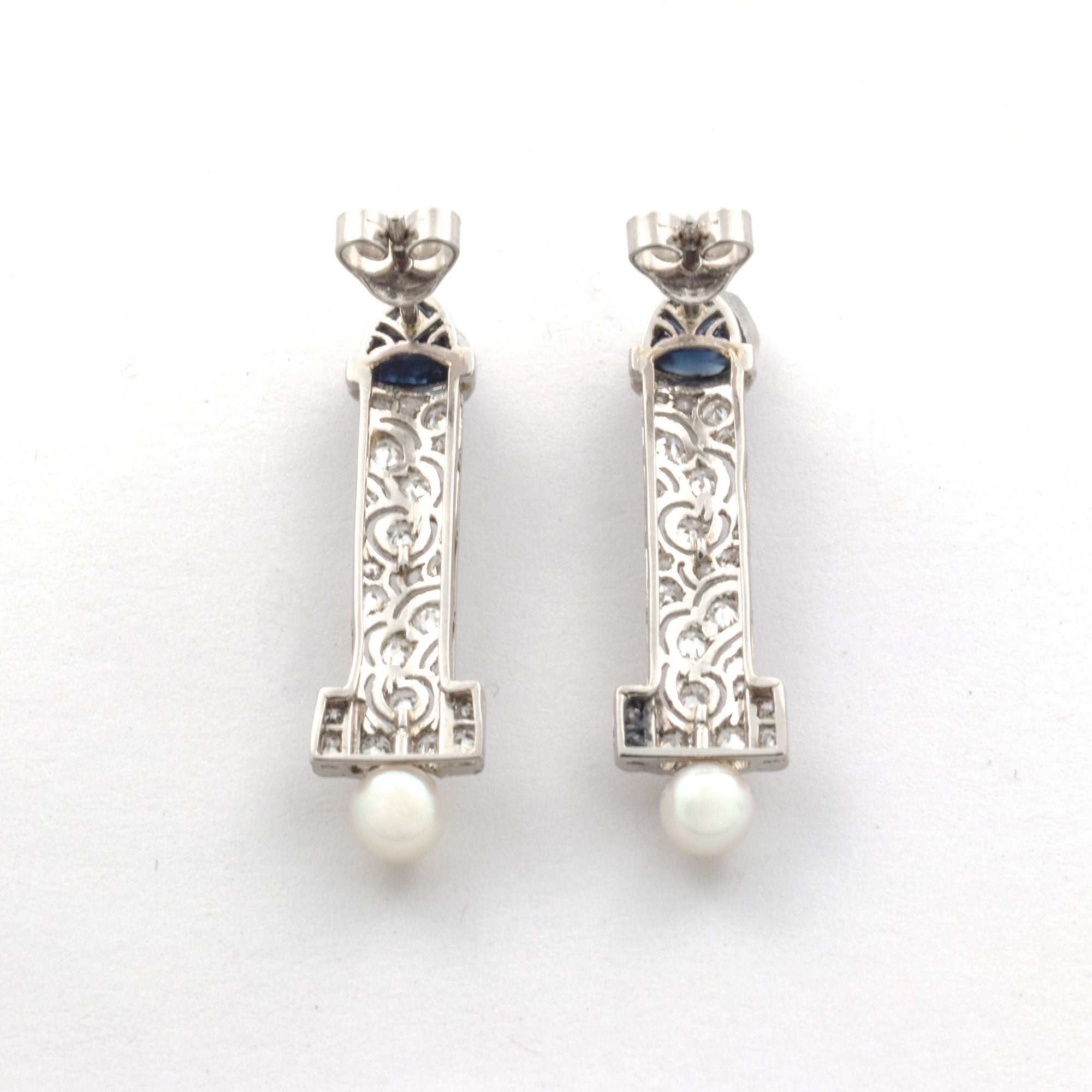 Bei dem Schmuckstück handelt es sich um ein Paar Ohrstecker aus 950 Platin/Weißgold mit zwei Saphiren, zwei Zuchtperlen, 18 Brillanten von zusammen ca. 0,36 ct in der Qualität Weiß mit kleinen Einschlüssen (W/si), zwölf Diamanten im 8/8 Schliff von zusammen ca. 0,12 ct in der Qualität Weiß mit kleinen Einschlüssen (W/si) und 28 Diamantrosen.