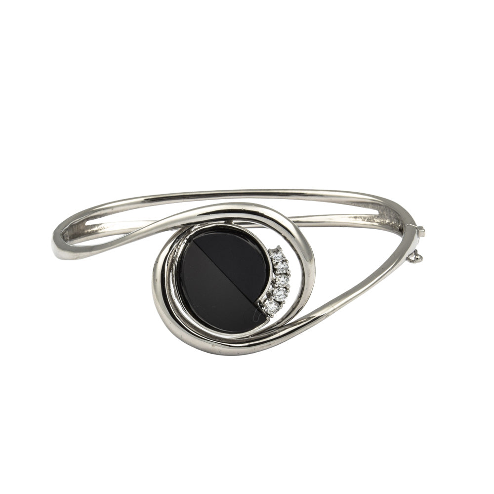 Bei dem Schmuckstück handelt es sich um einen Armreif aus 750 Weißgold mit zwei Onyxen und fünf Brillanten von zusammen ca. 0,2 ct in der Qualität Weiß mit sehr kleinen Einschlüssen (W/vs).