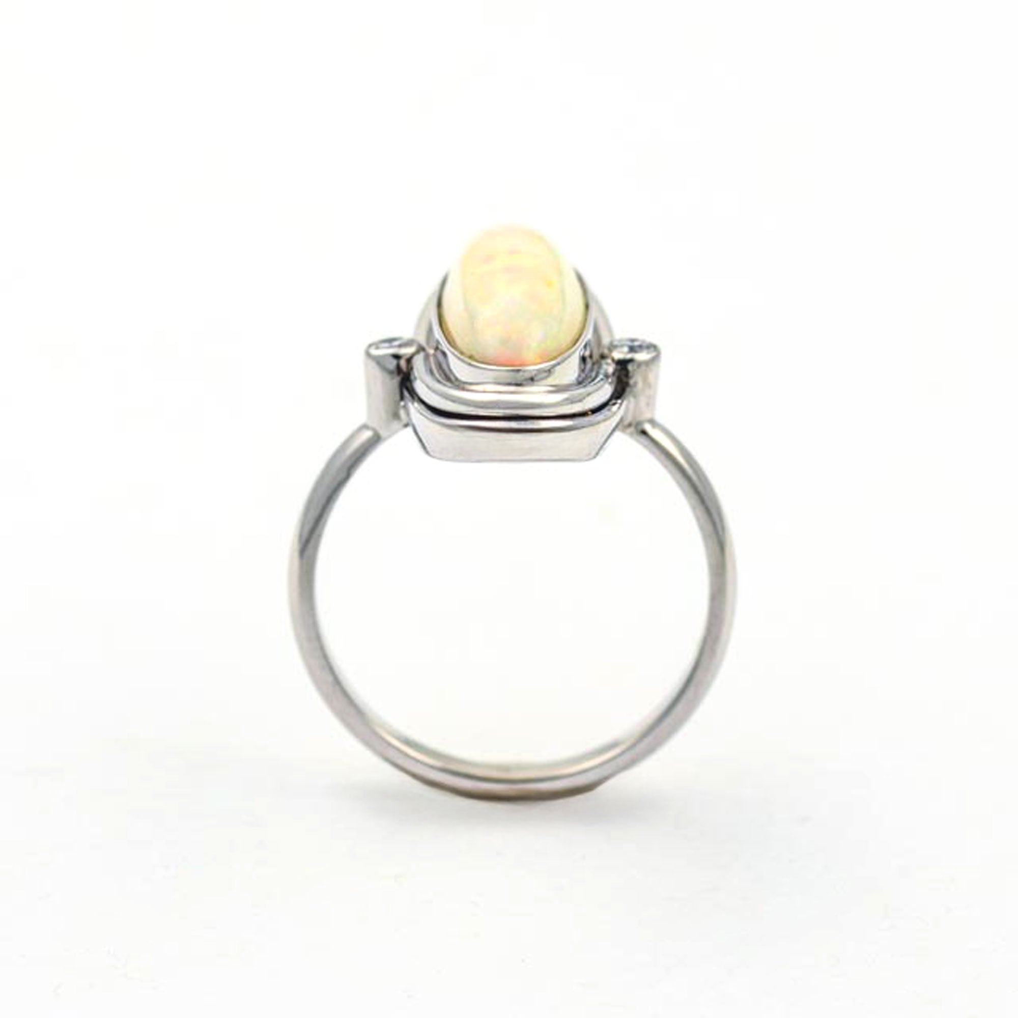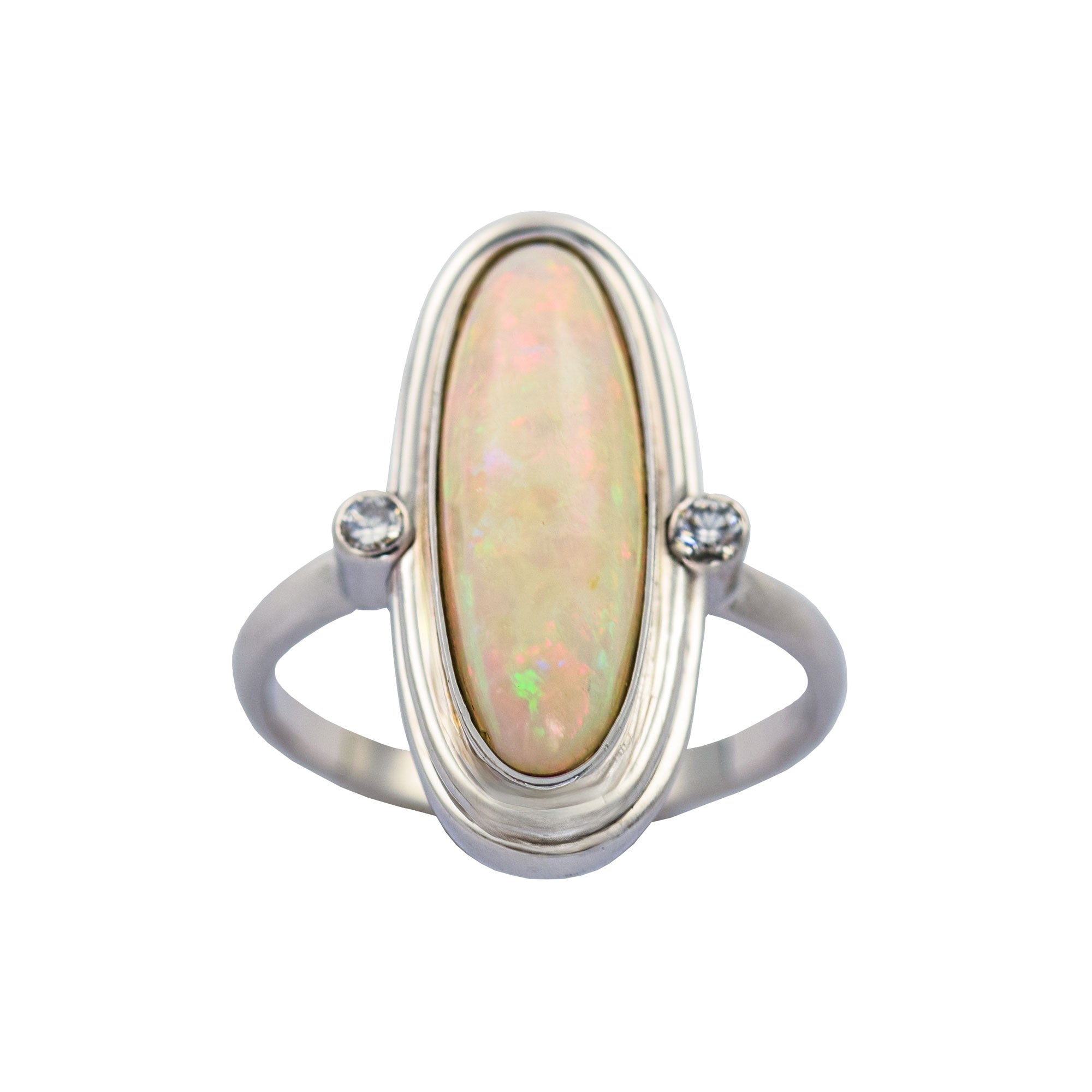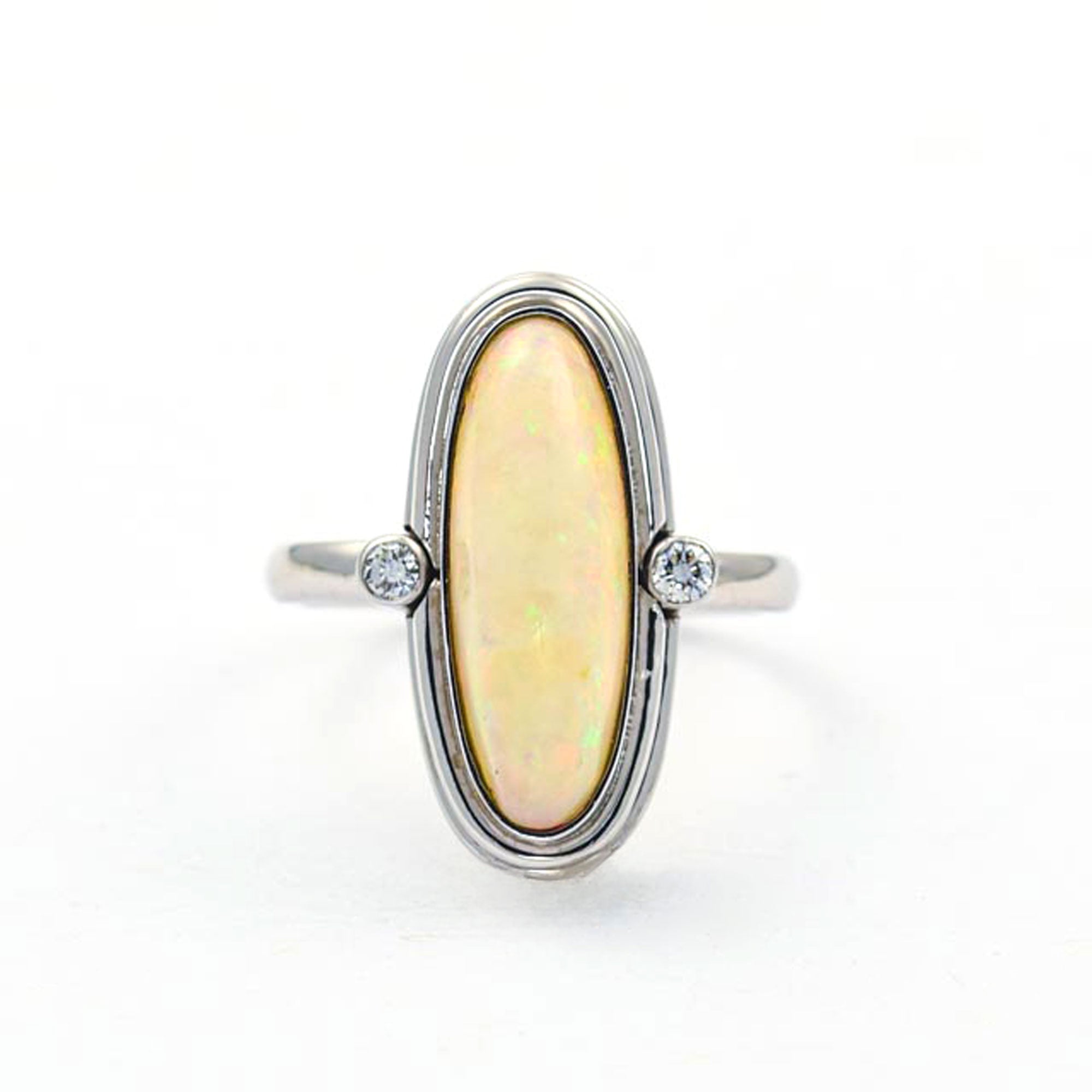 Bei dem Schmuckstück handelt es sich um einen Ring aus 585 Weißgold mit einem Opalcabochon und zwei Brillanten von zusammen ca. 0,08 ct in der Qualität Weiß mit sehr kleinen Einschlüssen (W/vs).
