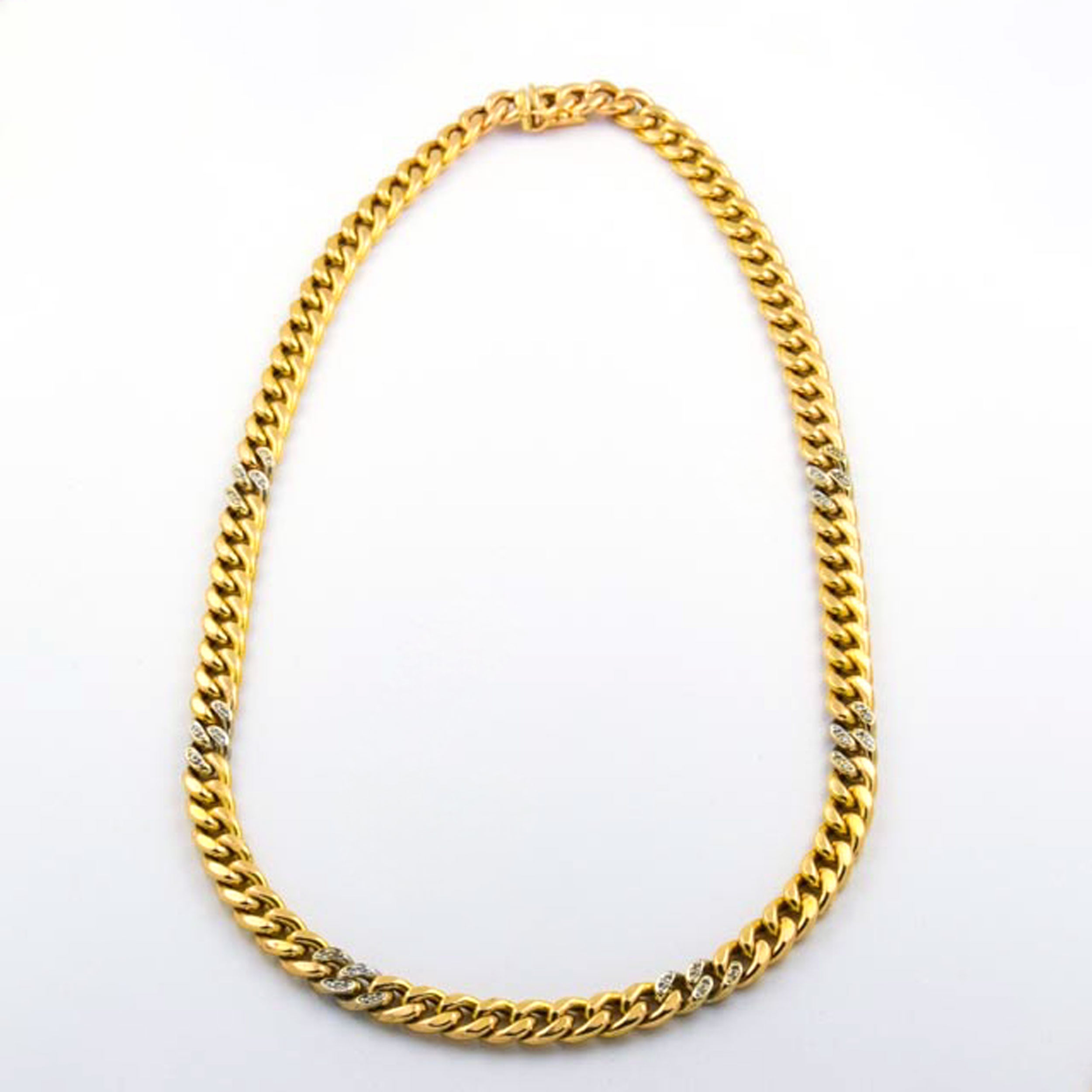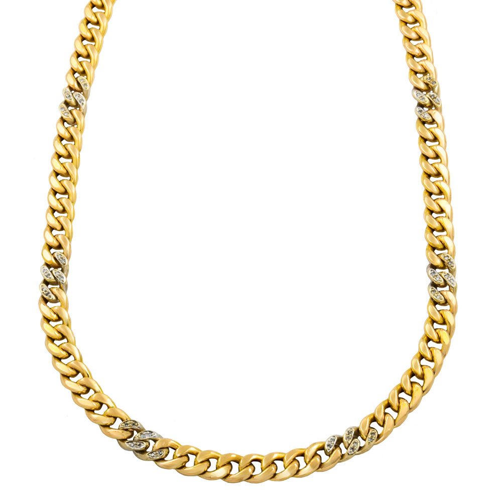 Bei dem Schmuckstück handelt es sich um eine Panzerkette aus 585 Gelb- und Weißgold mit 48 Diamanten im 8/8 Schliff von zusammen ca. 0,24 ct in der Qualität Weiß mit kleinen Einschlüssen (W/si). Das Schmuckstück hat eine Gesamtlänge von 45,5 cm.