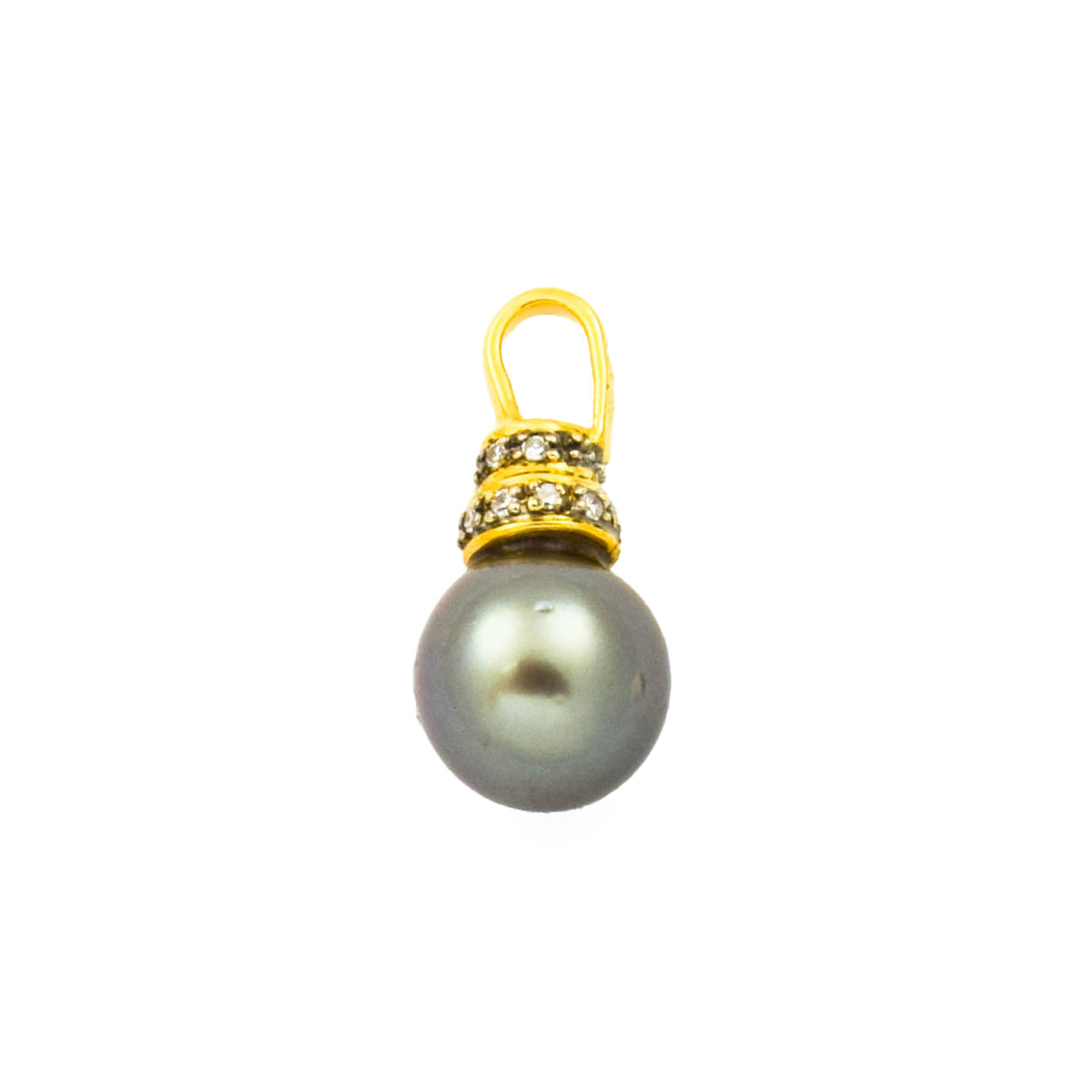Bei dem Schmuckstück handelt es sich um einen Anhänger aus 750 Gelbgold mit einer Tahitizuchtperle und 15 Diamanten im 8/8 Schliff von zusammen ca. 0,075 ct in der Qualität Weiß mit kleinen Einschlüssen (W/si).