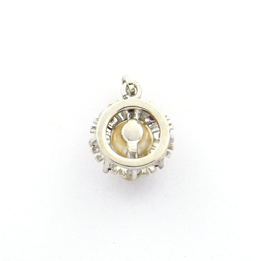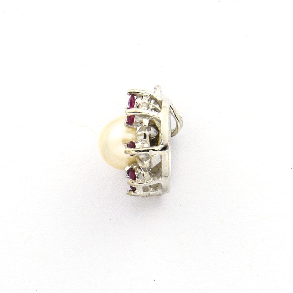 Bei dem Schmuckstück handelt es sich um einen Anhänger aus 585 Weißgold mit einer Akoyazuchtperle und acht Rubinen.