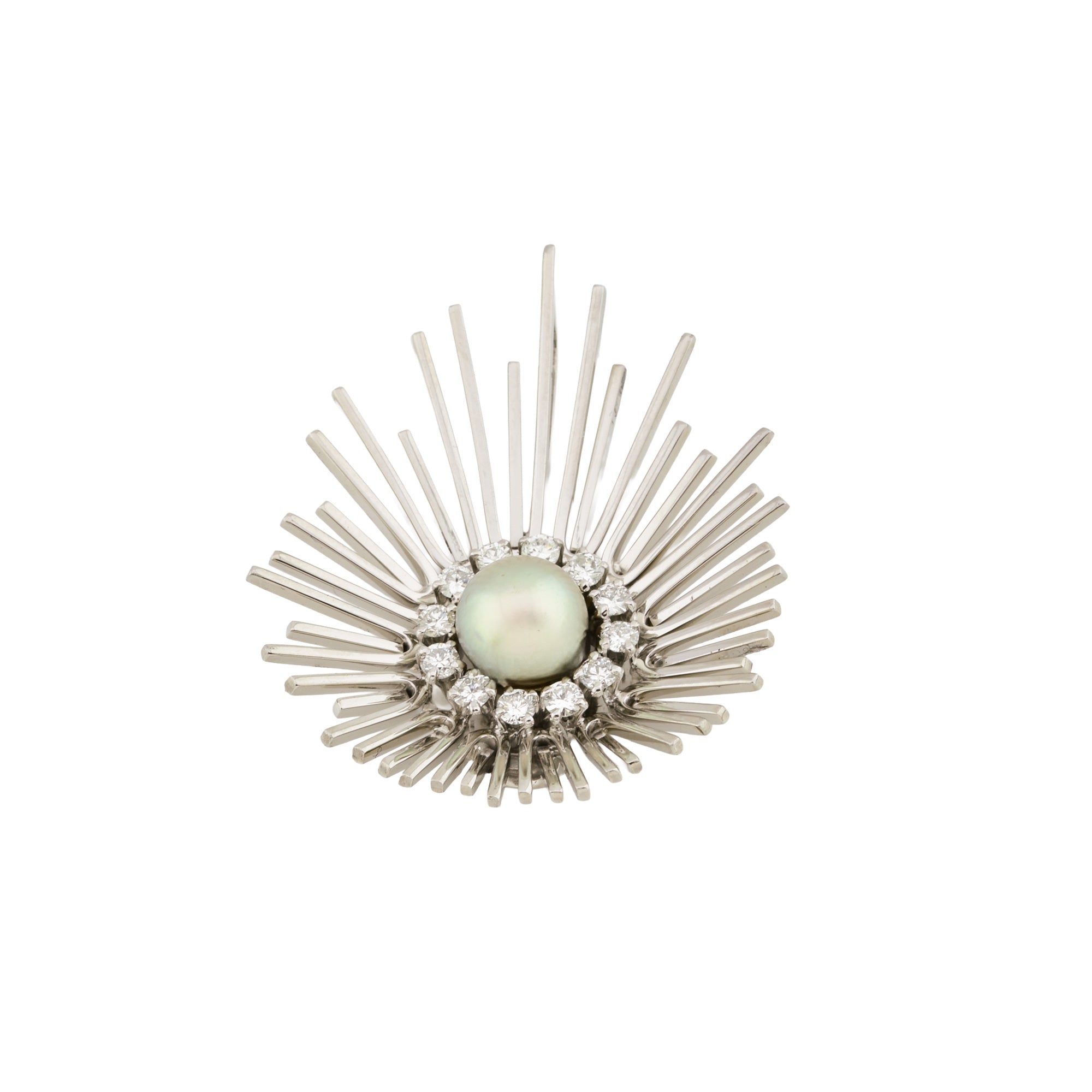 Bei dem Schmuckstück handelt es sich um einen in Handarbeit gefertigten Anhänger aus 750 Weißgold mit einer Zuchtperle und zwölf Brillanten von zusammen ca. 0,48 ct in der Qualität Weiß mit sehr kleinen Einschlüssen (W/vs).
