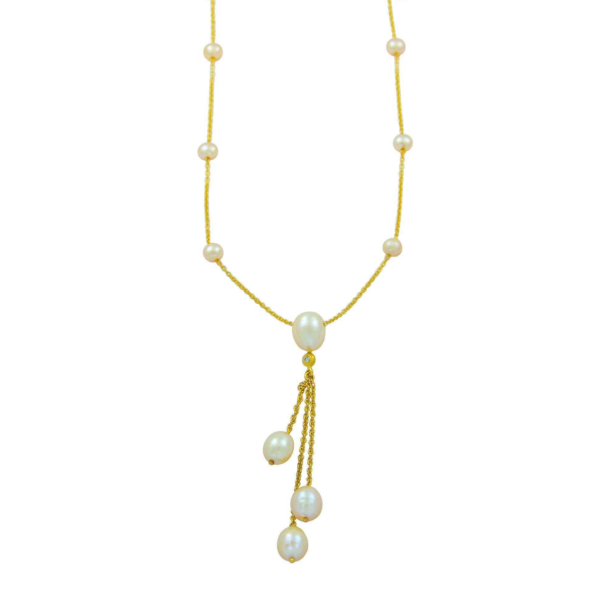 Bei dem Schmuckstück handelt es sich um eine Halskette aus 750 Gelbgold mit 13 Zuchtperlen und einem Brillanten von ca. 0,02 ct in der Qualität Weiß mit kleinen Einschlüssen (W/si). Das Schmuckstück hat eine Gesamtlänge von 40 cm.