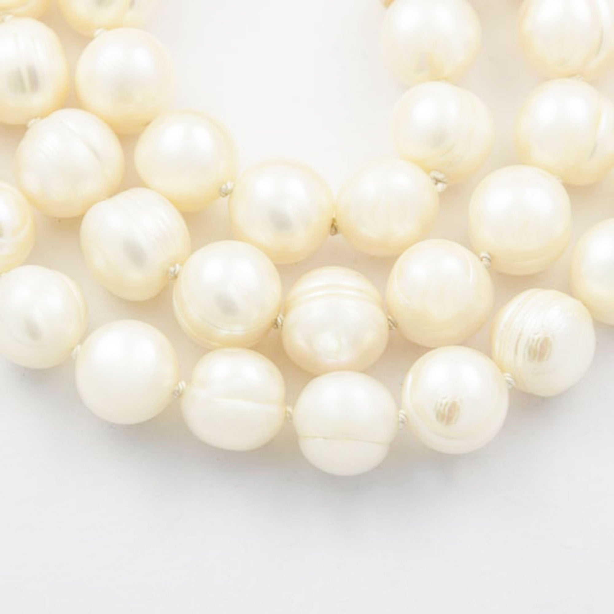 Bei dem Schmuckstück handelt es sich um eine Halskette aus Südseezuchtperlen mit Schließe aus 585 Gelb- und Weißgold mit 72 Diamanten im 8/8 Schliff von zusammen ca. 0,36 ct in der Qualität Weiß mit sehr kleinen Einschlüssen (W/vs). Das Schmuckstück hat eine Gesamtlänge von cm.