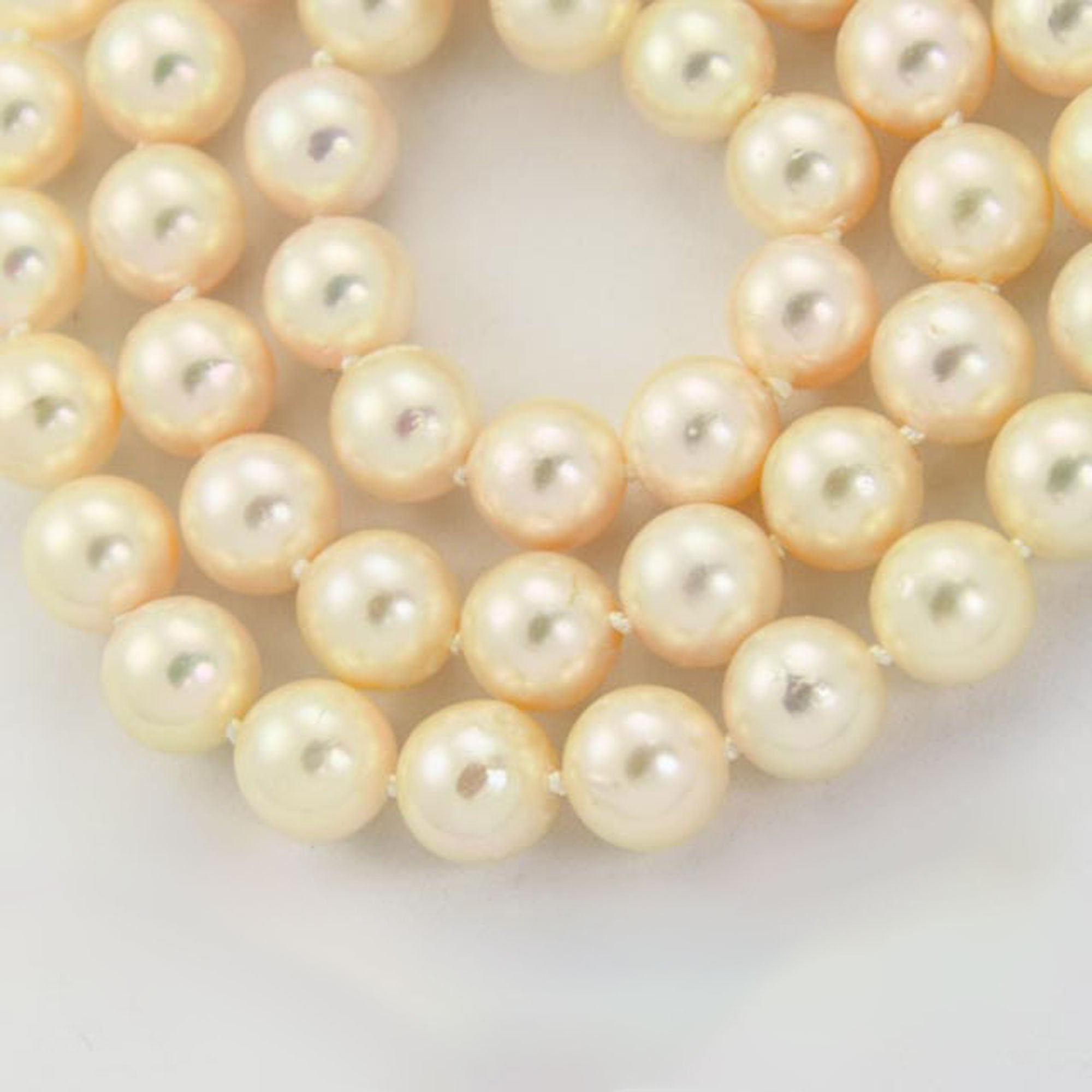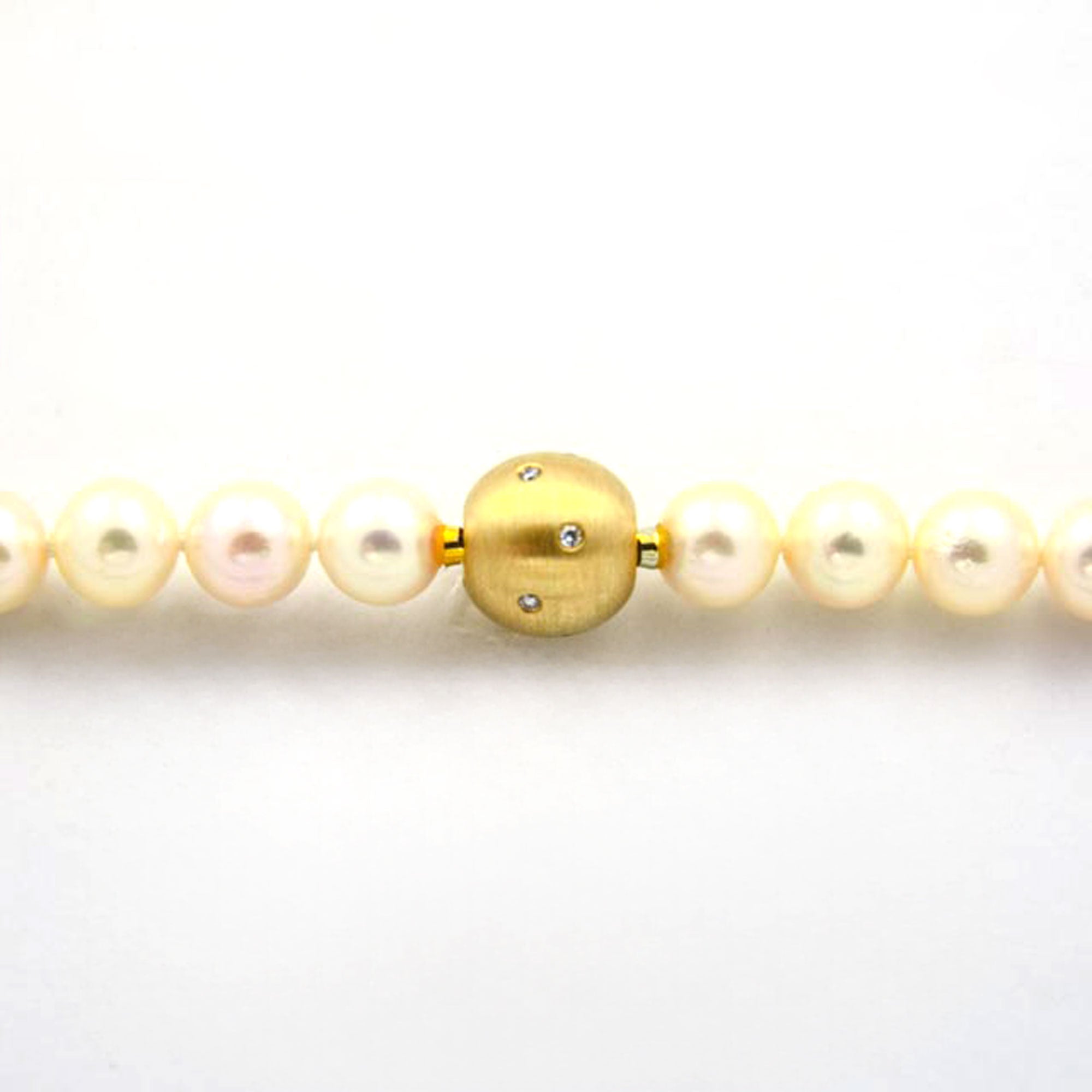 Bei dem Schmuckstück handelt es sich um eine Halskette aus Akoyazuchtperlen mit Schließe aus 750 Gelbgold mit acht Brillanten von zusammen ca. 0,08 ct in der Qualität Weiß und piqué 1 (W/p 1). Das Schmuckstück hat eine Gesamtlänge von 44 cm.