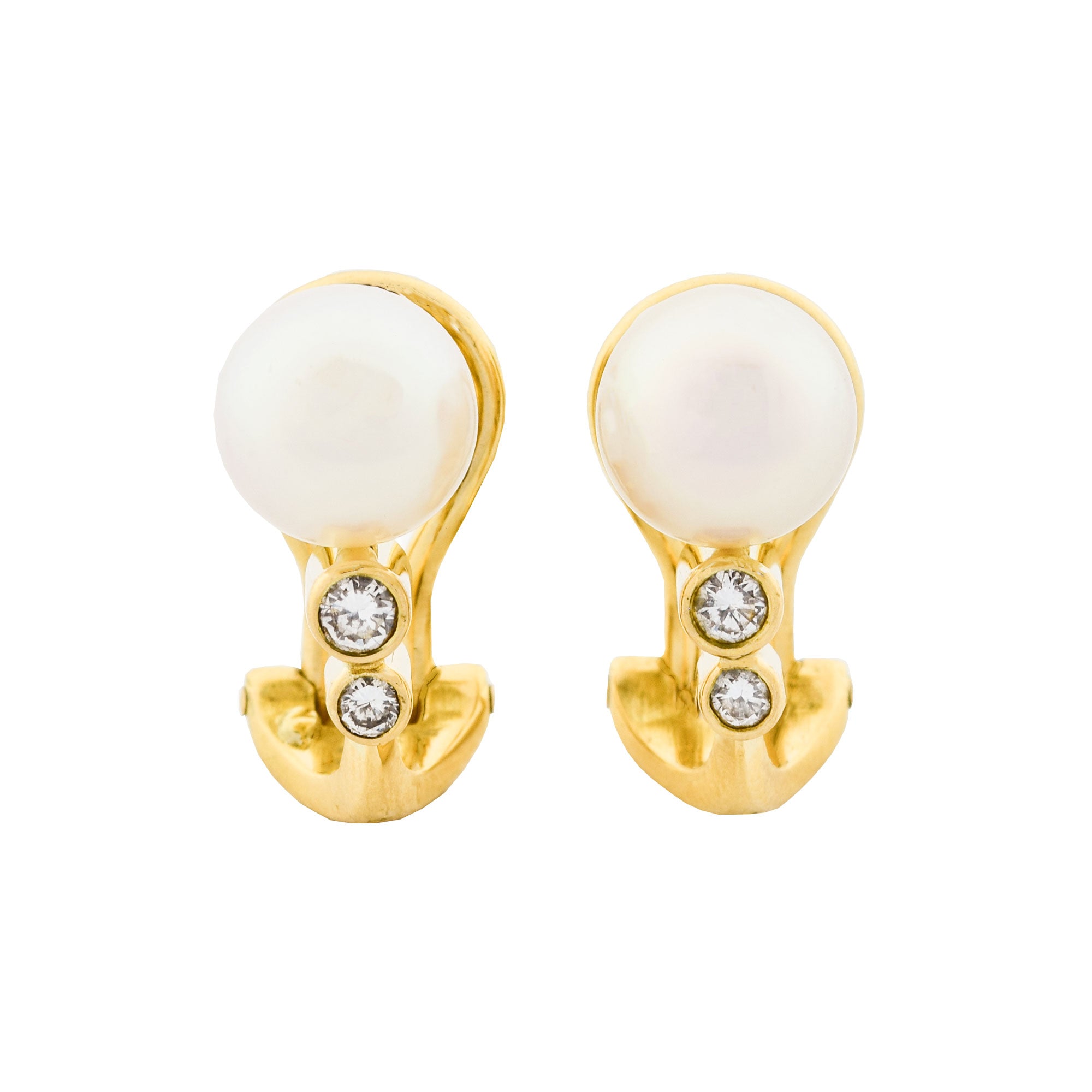 Bei dem Schmuckstück handelt es sich um ein Paar Ohrclips aus 750 Gelbgold mit zwei Akoyazuchtperlen und vier Brillanten von zusammen ca. 0,16 ct in der Qualität Weiß mit kleinen Einschlüssen (W/si).