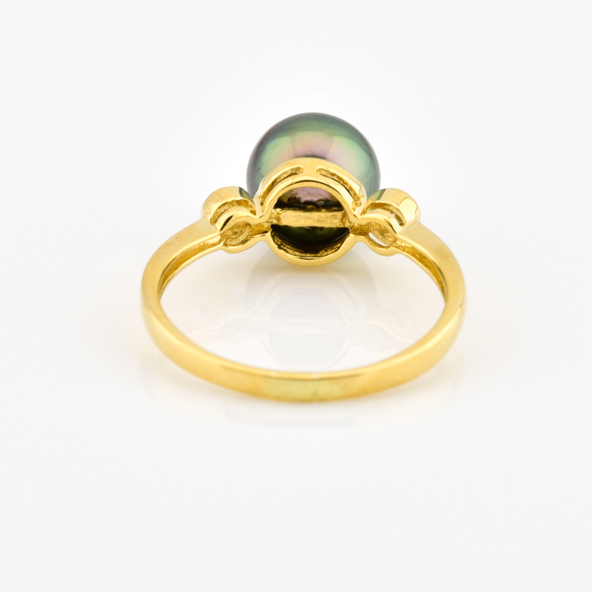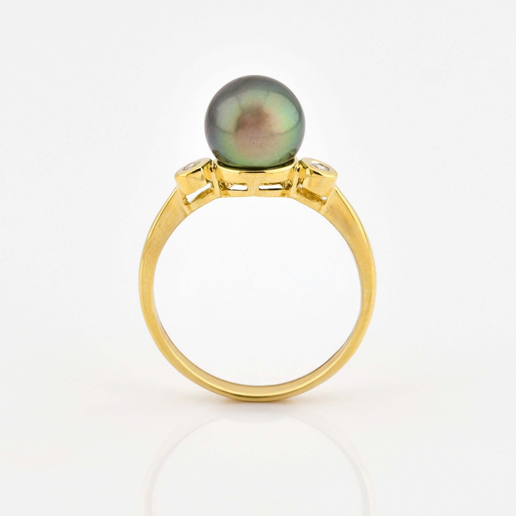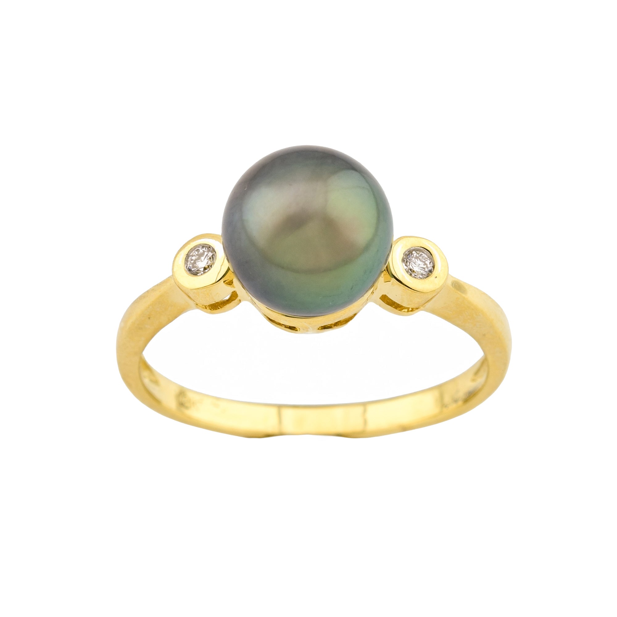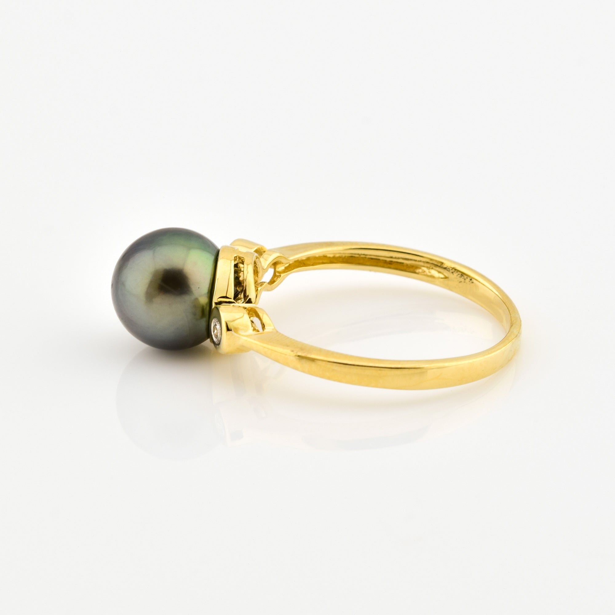 Bei dem Schmuckstück handelt es sich um einen Ring aus 750 Gelb- und Weißgold mit einer Zuchtperle und zwei Brillanten von zusammen ca. 0,04 ct in der Qualität Weiß mit sehr kleinen Einschlüssen (W/vs).