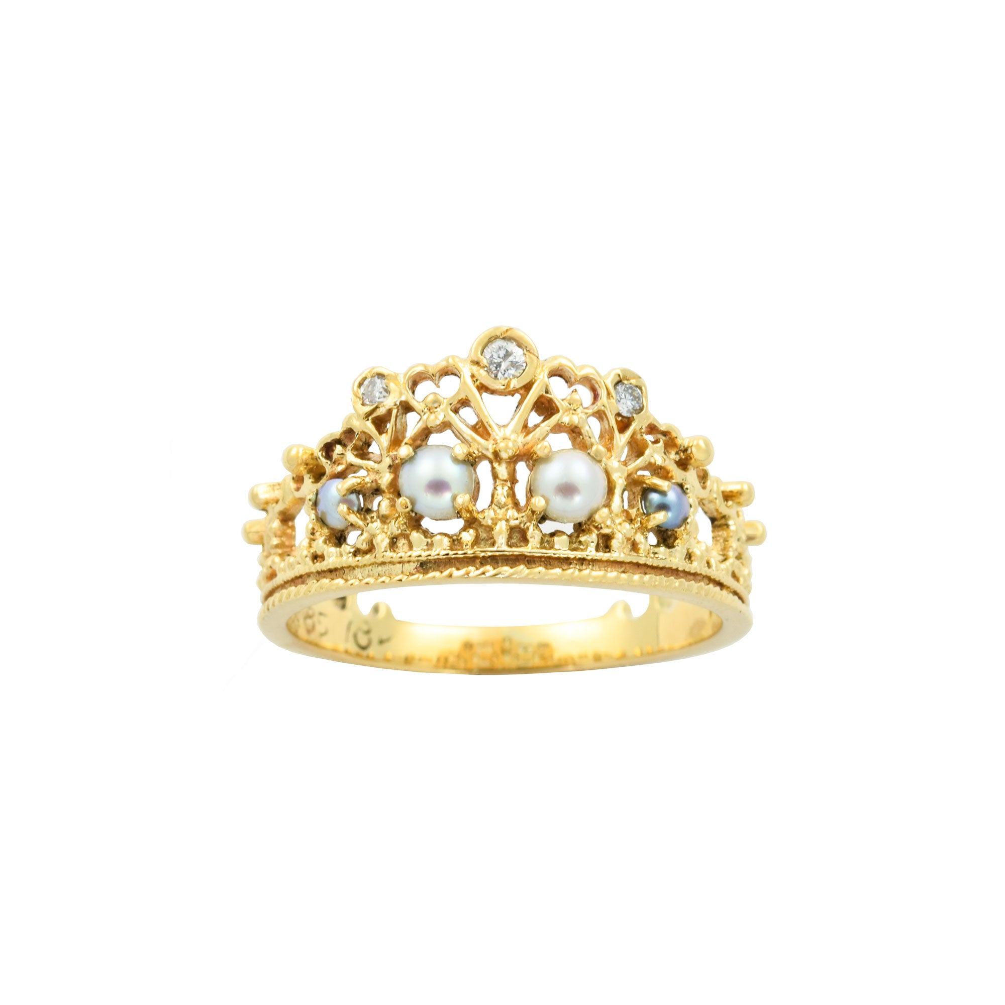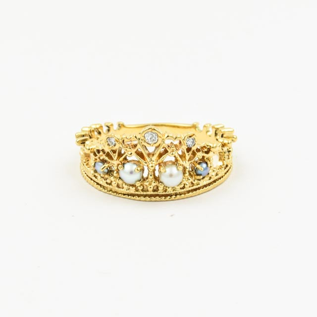 Bei dem Schmuckstück handelt es sich um einen Ring aus 750 Gelbgold mit vier Zuchtperlen und drei Brillanten von zusammen ca. 0,02 ct in der Qualität Weiß mit kleinen Einschlüssen (W/si).