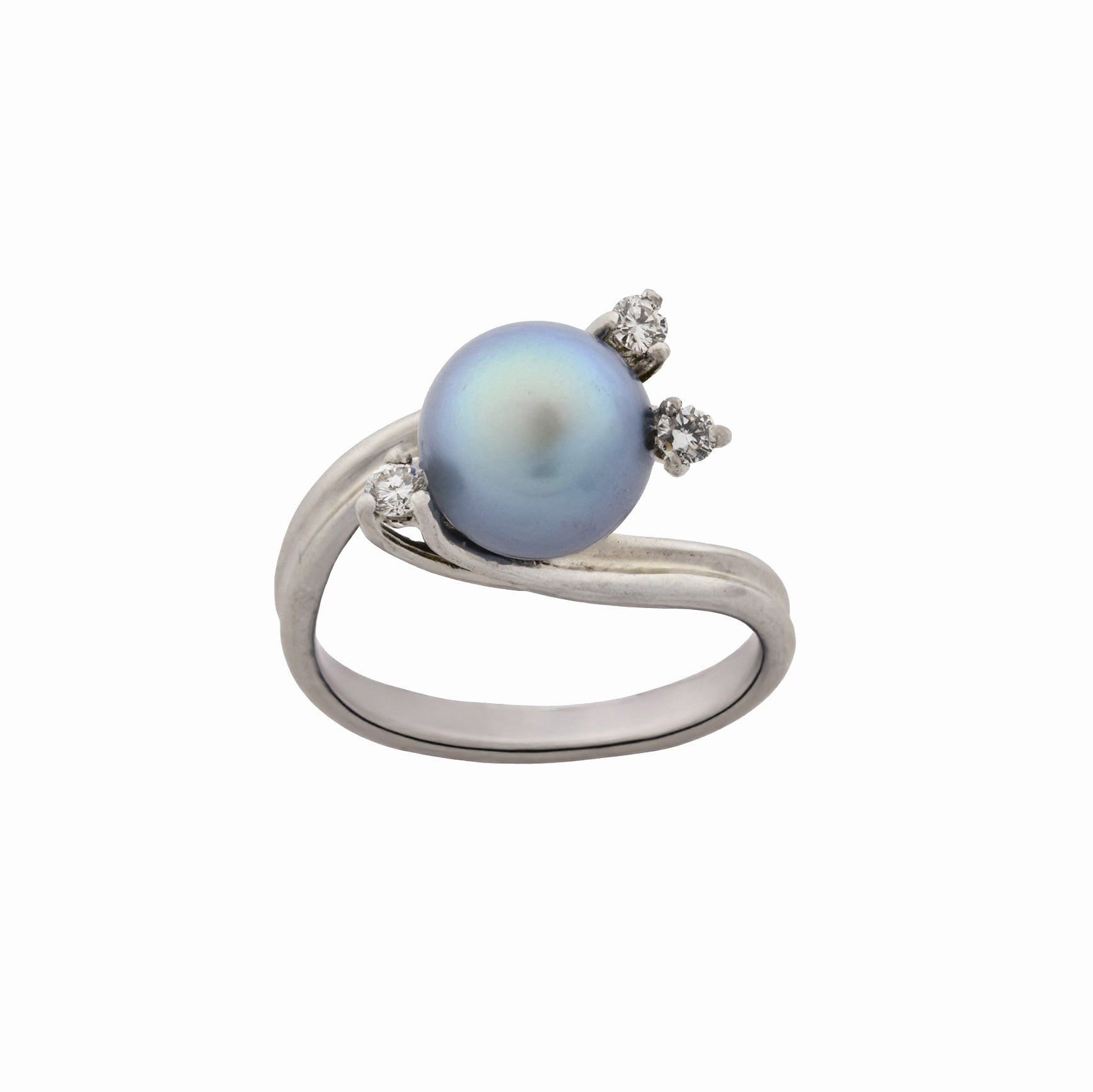 Bei dem Schmuckstück handelt es sich um einen in Handarbeit gefertigten Ring aus 585 Weißgold mit einer Tahitizuchtperle und drei Brillanten von zusammen ca. 0,09 ct in der Qualität Weiß mit kleinen Einschlüssen (W/si).