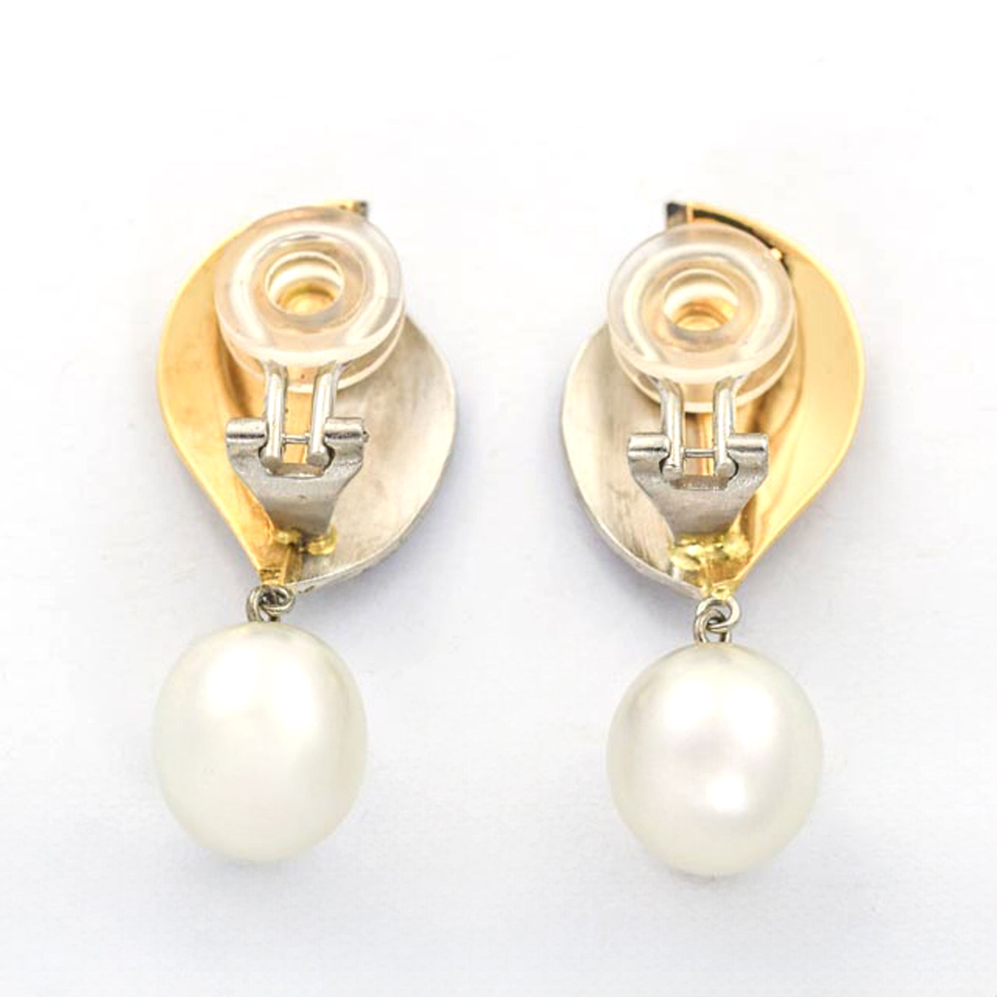 Bei dem Schmuckstück handelt es sich um ein Paar in Handarbeit gefertigte Ohrclips aus 950 Platin/750 Gelbgold mit zwei Südseezuchtperlen und zwei Brillanten von zusammen ca. 0,16 ct in der Qualität feines Weiß und lupenrein (TW/lupenrein).