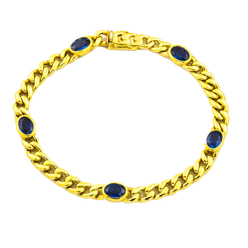 Bei dem Schmuckstück handelt es sich um ein Panzerarmband der Marke Quinn aus 585 Gelbgold mit fünf Saphiren. Das Schmuckstück hat eine Gesamtlänge von 20 cm.