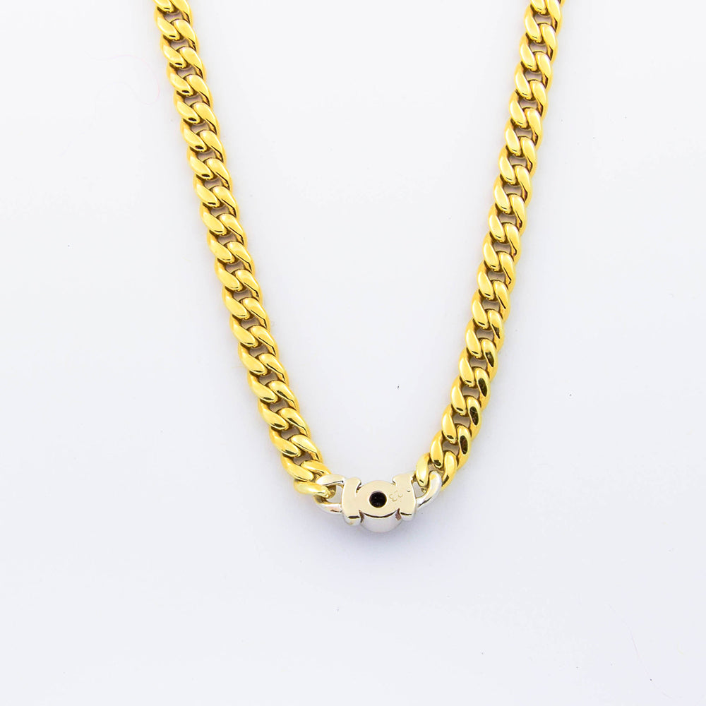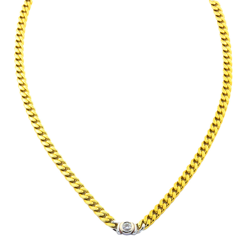 Bei dem Schmuckstück handelt es sich um ein Panzercollier der Marke Quinn aus 585 Gelb- und Weißgold mit einem Brillanten von ca. 0,23 ct in der Qualität Weiß mit kleinen Einschlüssen (W/si). Das Schmuckstück hat eine Gesamtlänge von 44,5 cm.
