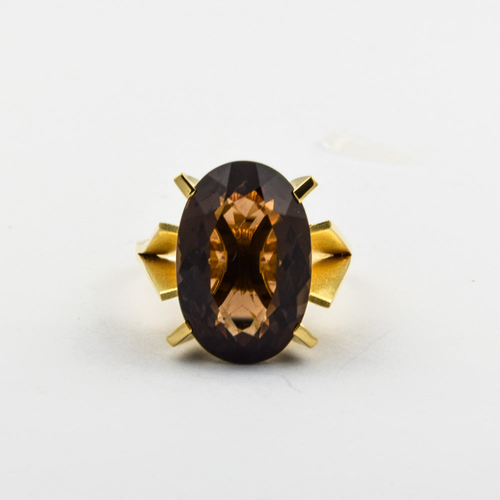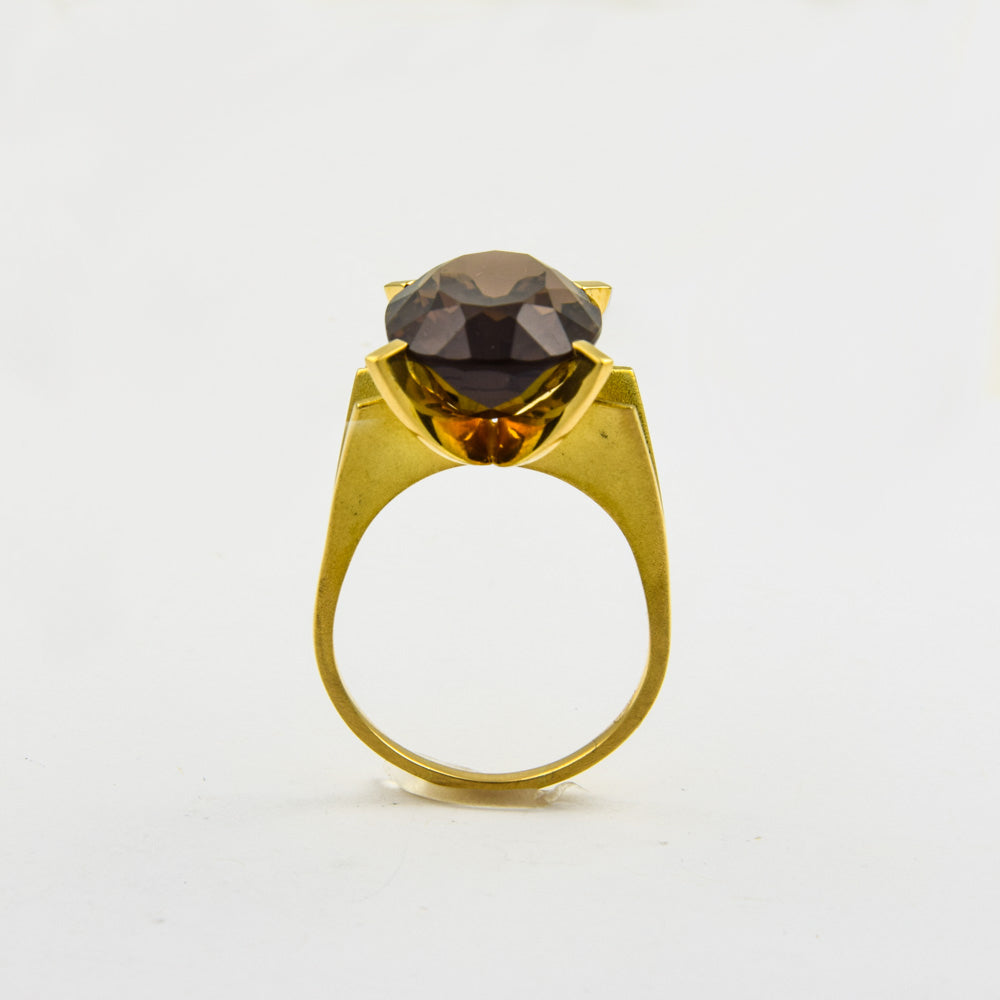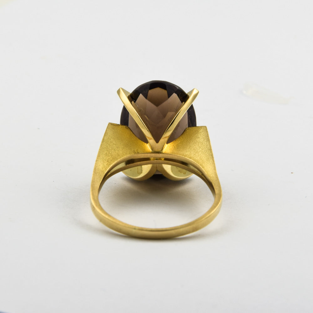 Bei dem Schmuckstück handelt es sich um einen in Handarbeit gefertigten Ring aus 750 Gelbgold mit einem Rauchquarz.