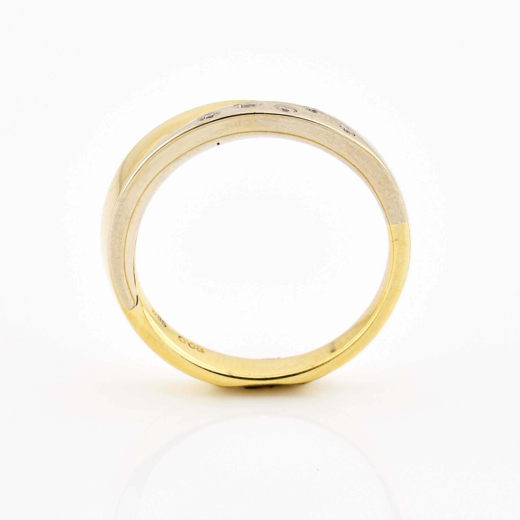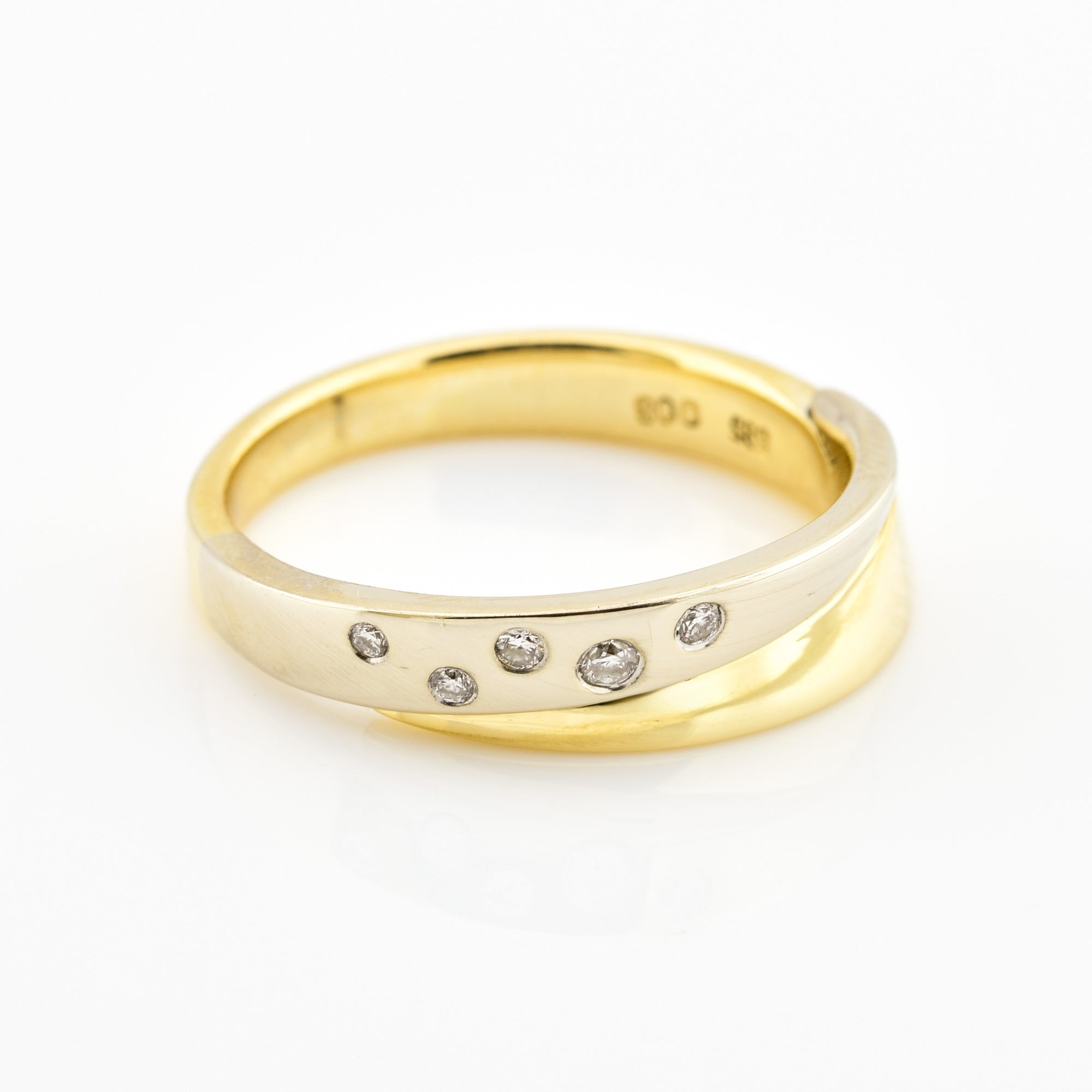 Bei dem Schmuckstück handelt es sich um einen Ring aus 585 Gelb- und Weißgold mit fünf Brillanten von zusammen ca. 0,08 ct in der Qualität Weiß mit kleinen Einschlüssen (W/si).