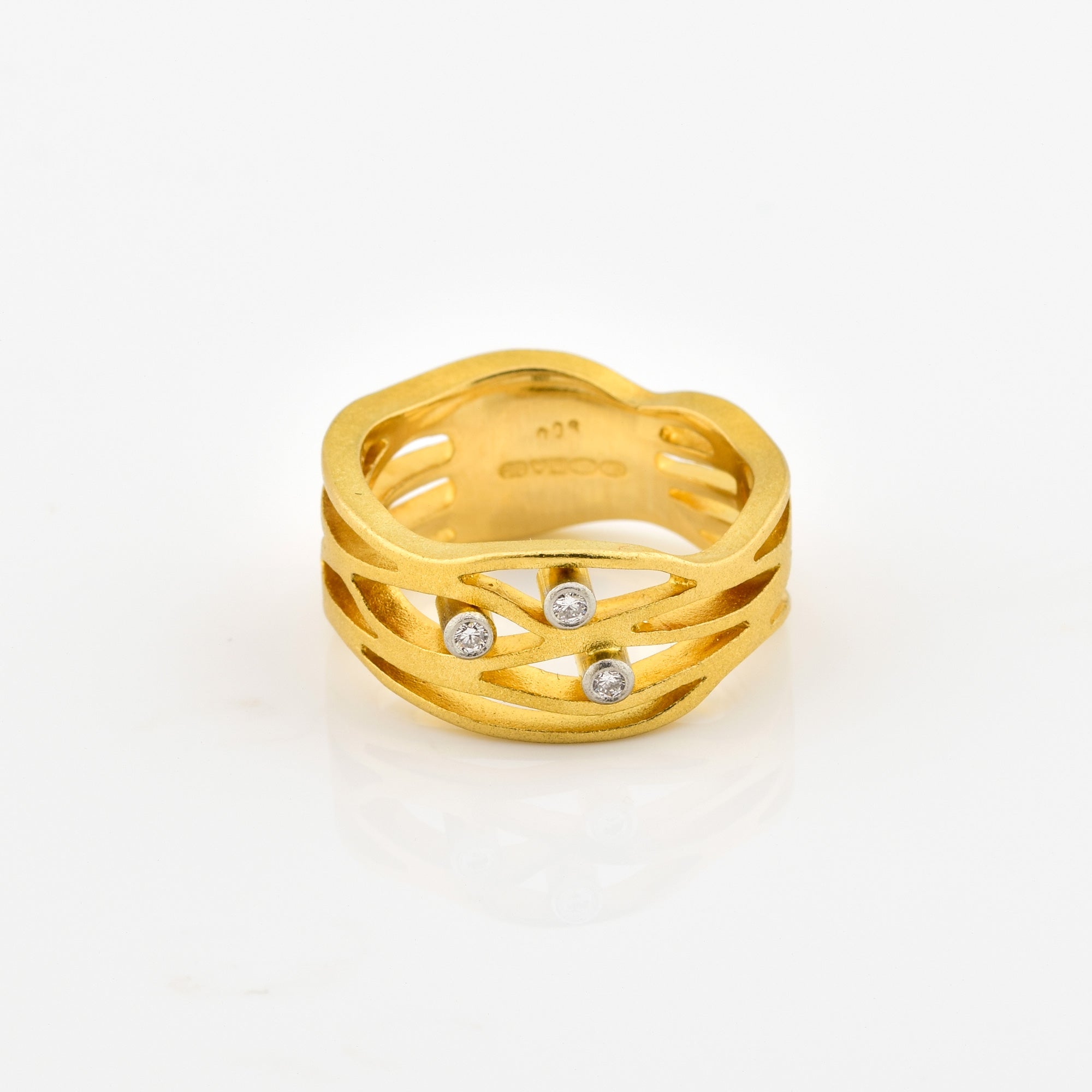 Bei dem Schmuckstück handelt es sich um einen Ring aus 750 Gelb- und Weißgold mit drei Brillanten von zusammen ca. 0,09 ct in der Qualität Weiß mit sehr kleinen Einschlüssen (W/vs).