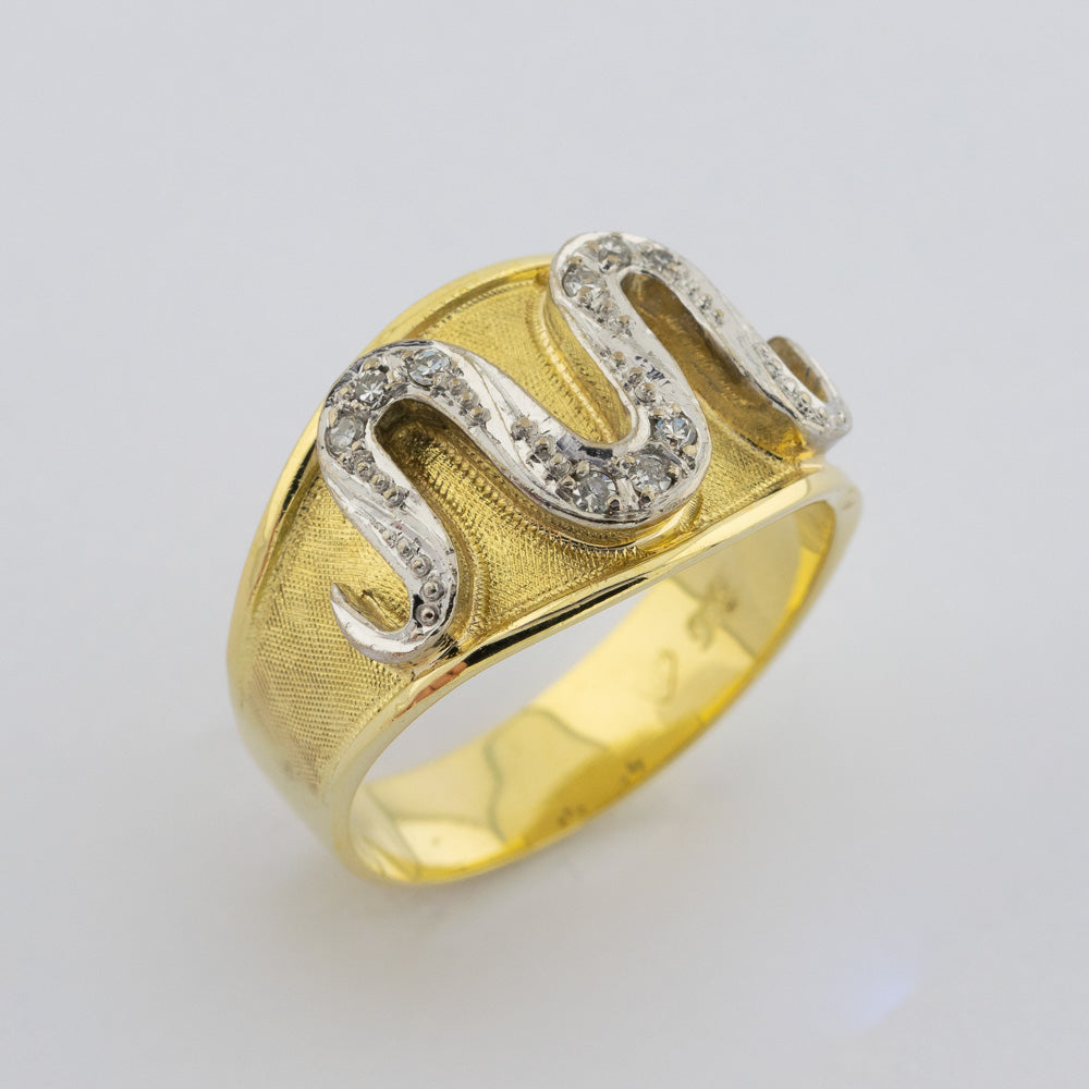 Bei dem Schmuckstück handelt es sich um einen Ring aus 585 Gelb- und Weißgold mit neun Diamanten im 8/8 Schliff von zusammen ca. 0,09 ct in der Qualität Weiß mit kleinen Einschlüssen (W/si).