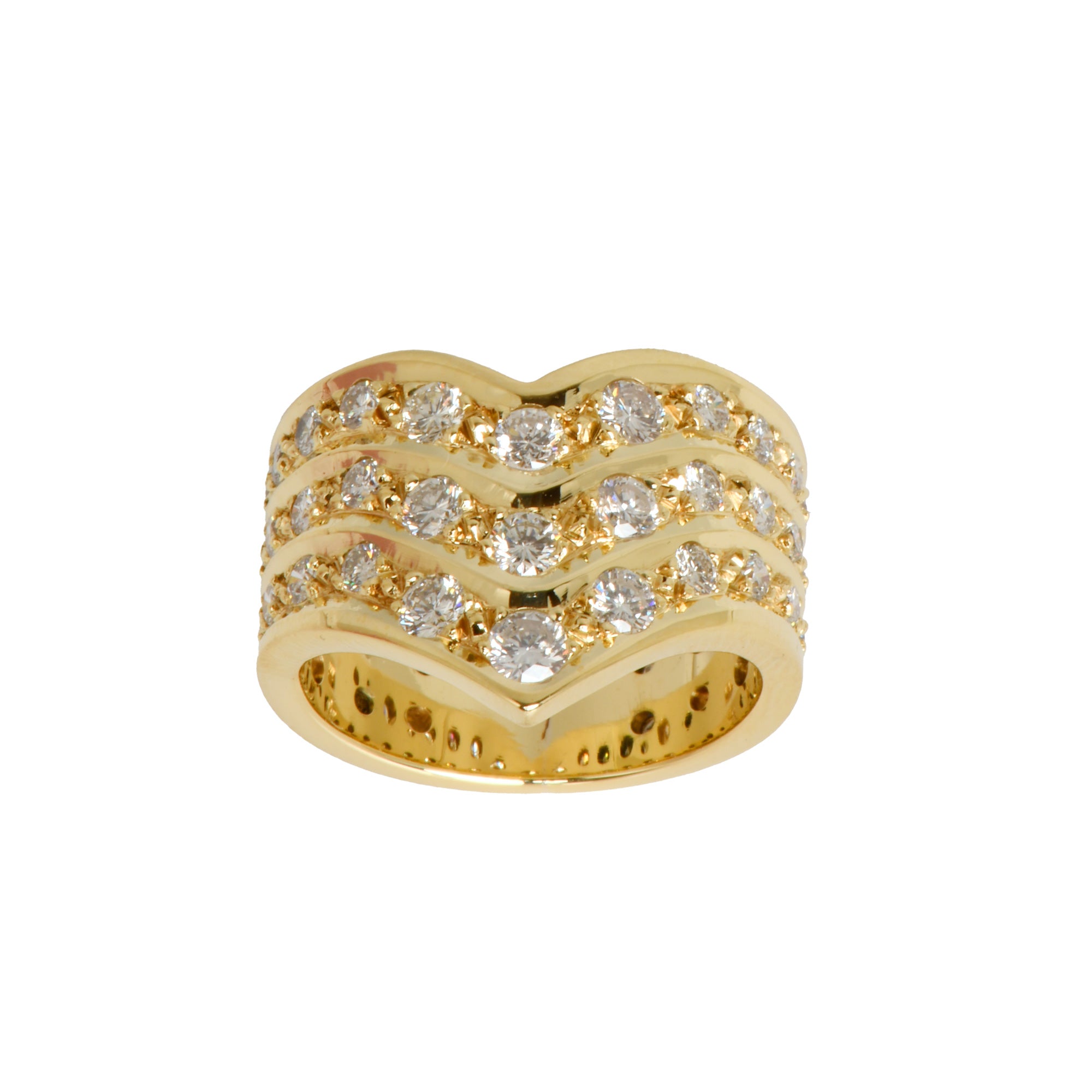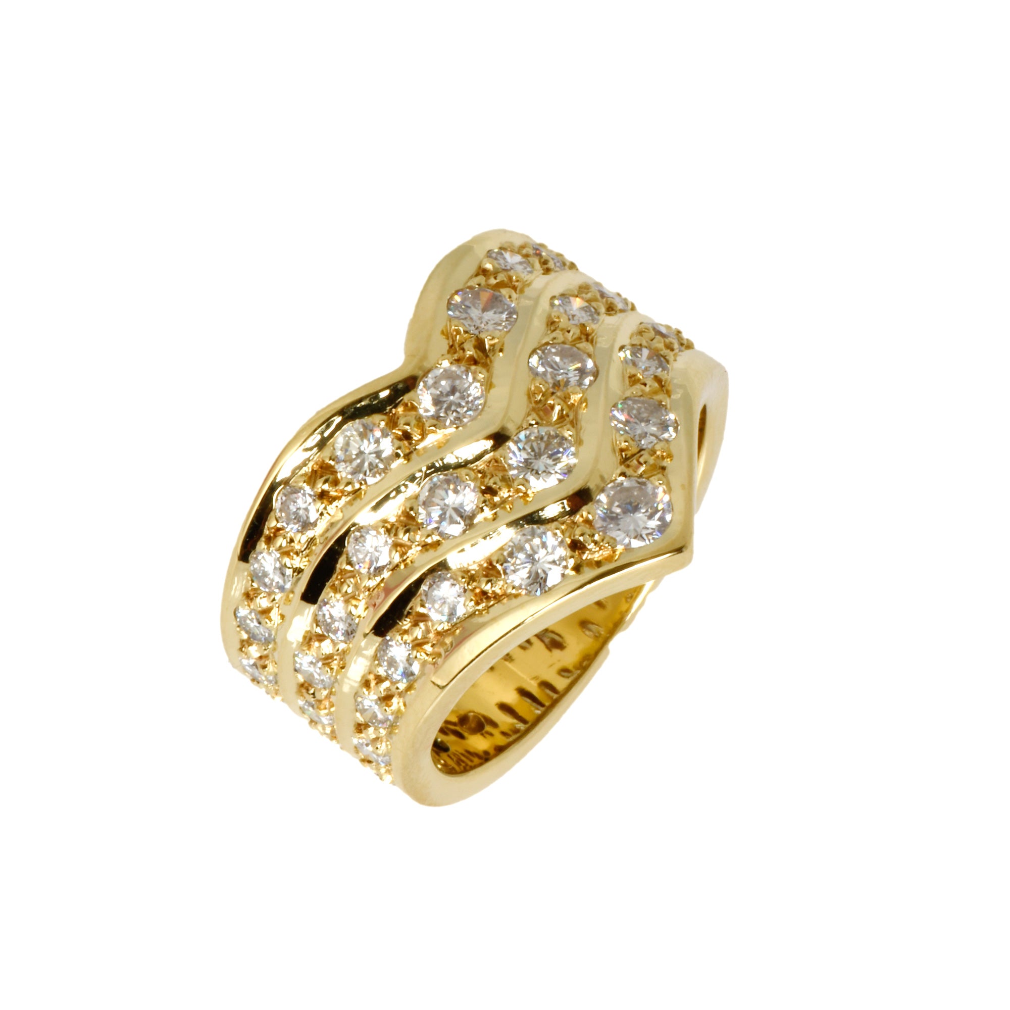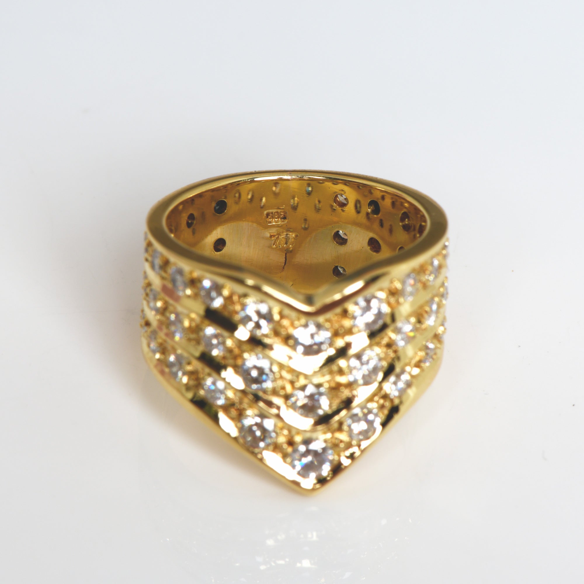 Bei dem Schmuckstück handelt es sich um einen Ring aus 585 Gelbgold mit 39 Brillanten von zusammen ca. 1,46 ct in der Qualität Weiß mit kleinen Einschlüssen (W/si) und zwölf Diamanten von zusammen ca. 0,12 ct in der Qualität Weiß mit kleinen Einschlüssen (W/si).