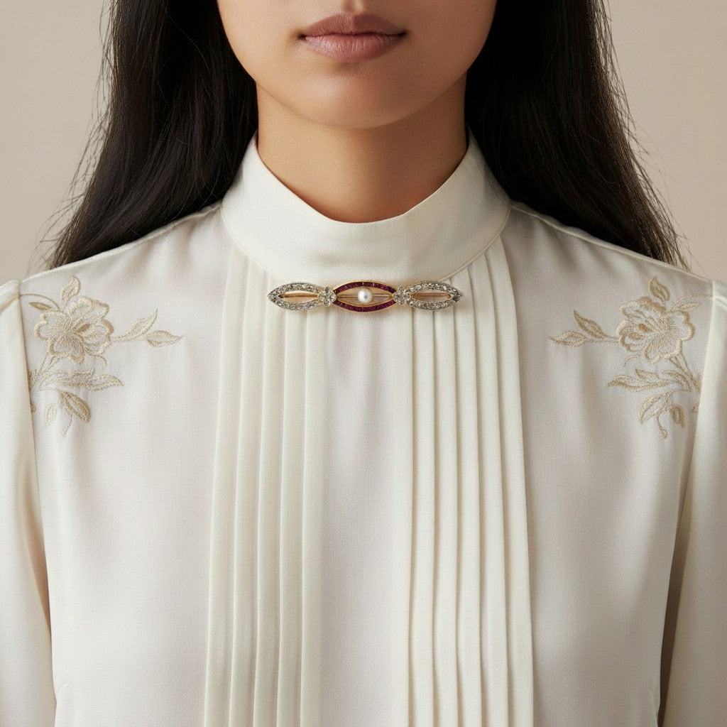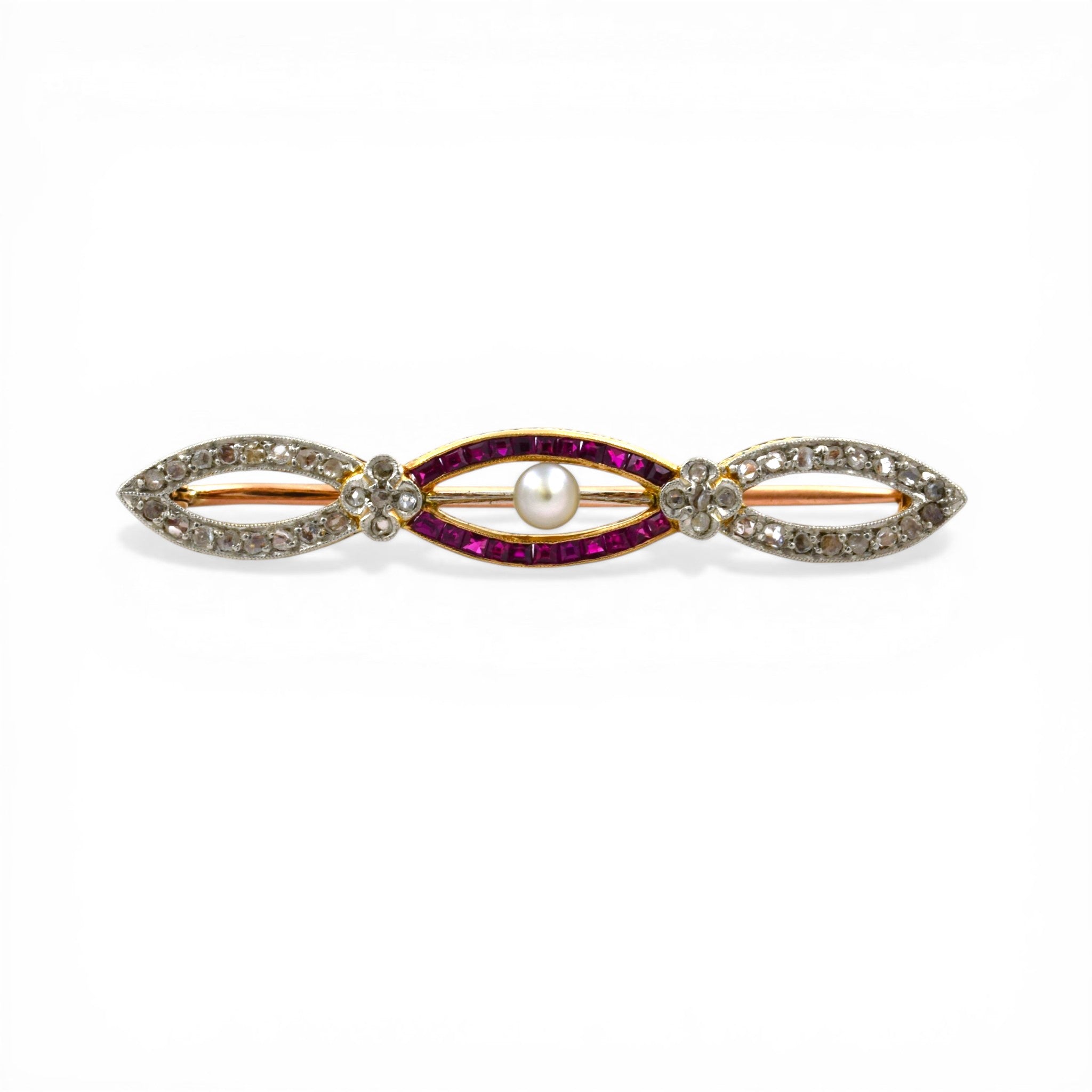 Art Déco Rubinbrosche aus Gelbgold/Platin mit Perle und Diamant