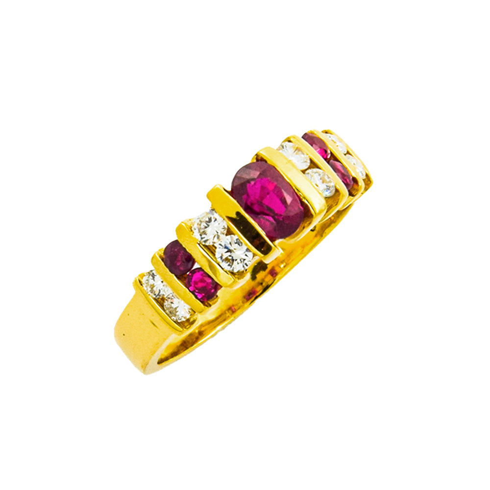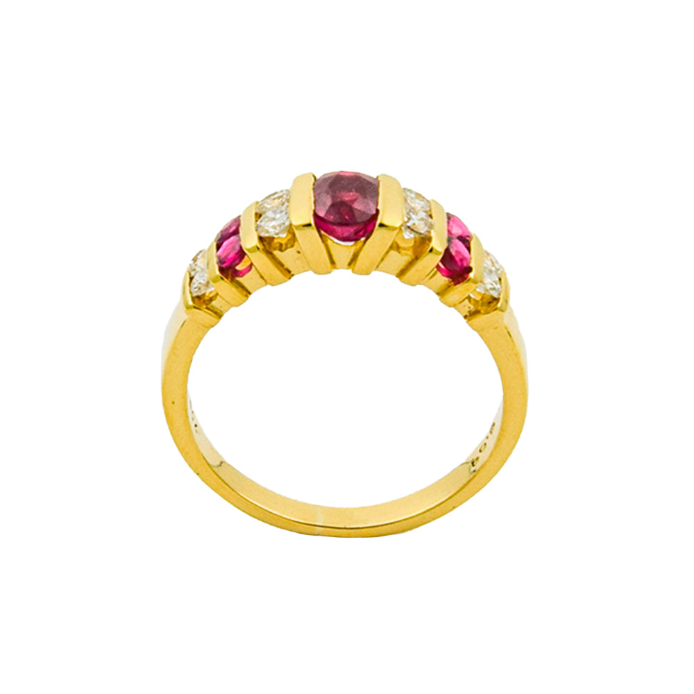 Bei dem Schmuckstück handelt es sich um einen Ring aus 750 Gelbgold mit fünf Rubinen und acht Brillanten von zusammen ca. 0,3 ct in der Qualität Weiß mit kleinen Einschlüssen (W/si).