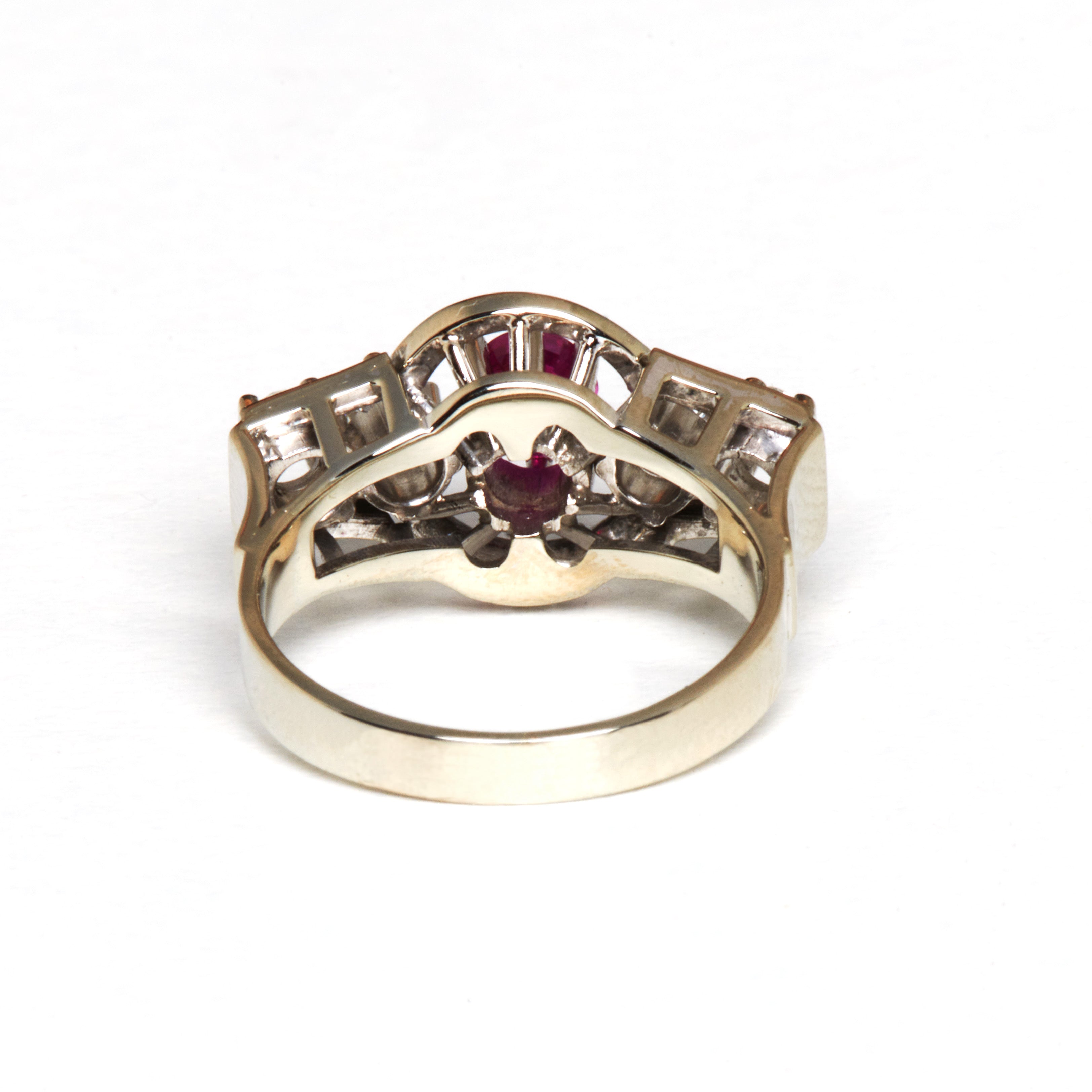 Bei dem Schmuckstück handelt es sich um einen Ring aus 750 Weißgold mit einem Rubin und vier Brillanten von zusammen ca. 0,36 ct in der Qualität feines Weiß mit sehr kleinen Einschlüssen (TW/vs).