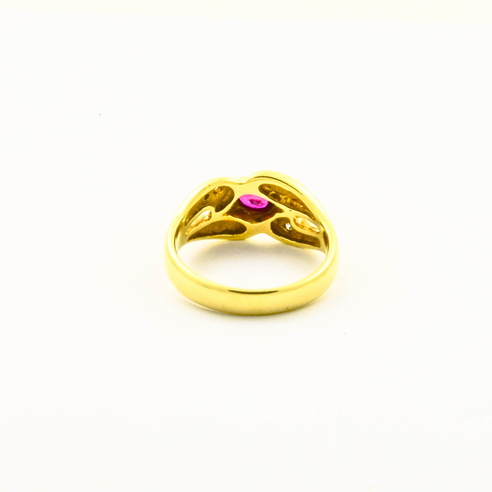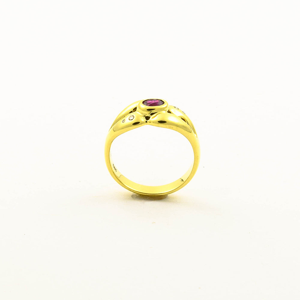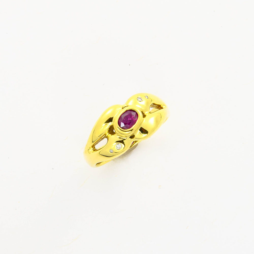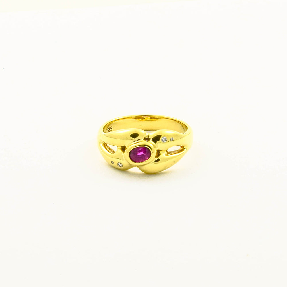 Bei dem Schmuckstück handelt es sich um einen Ring aus 585 Gelbgold mit einem Rubin und vier Brillanten von zusammen ca. 0,03 ct in der Qualität Weiß mit kleinen Einschlüssen (W/si).