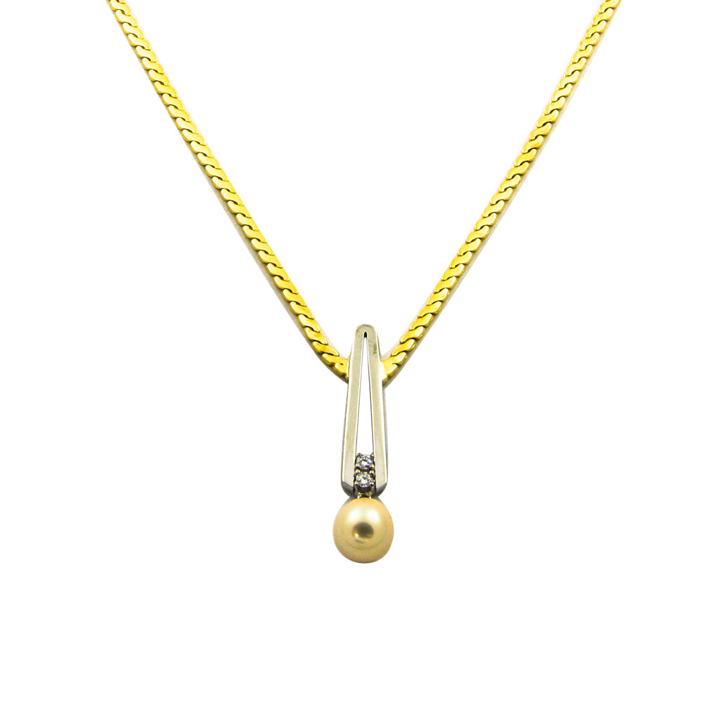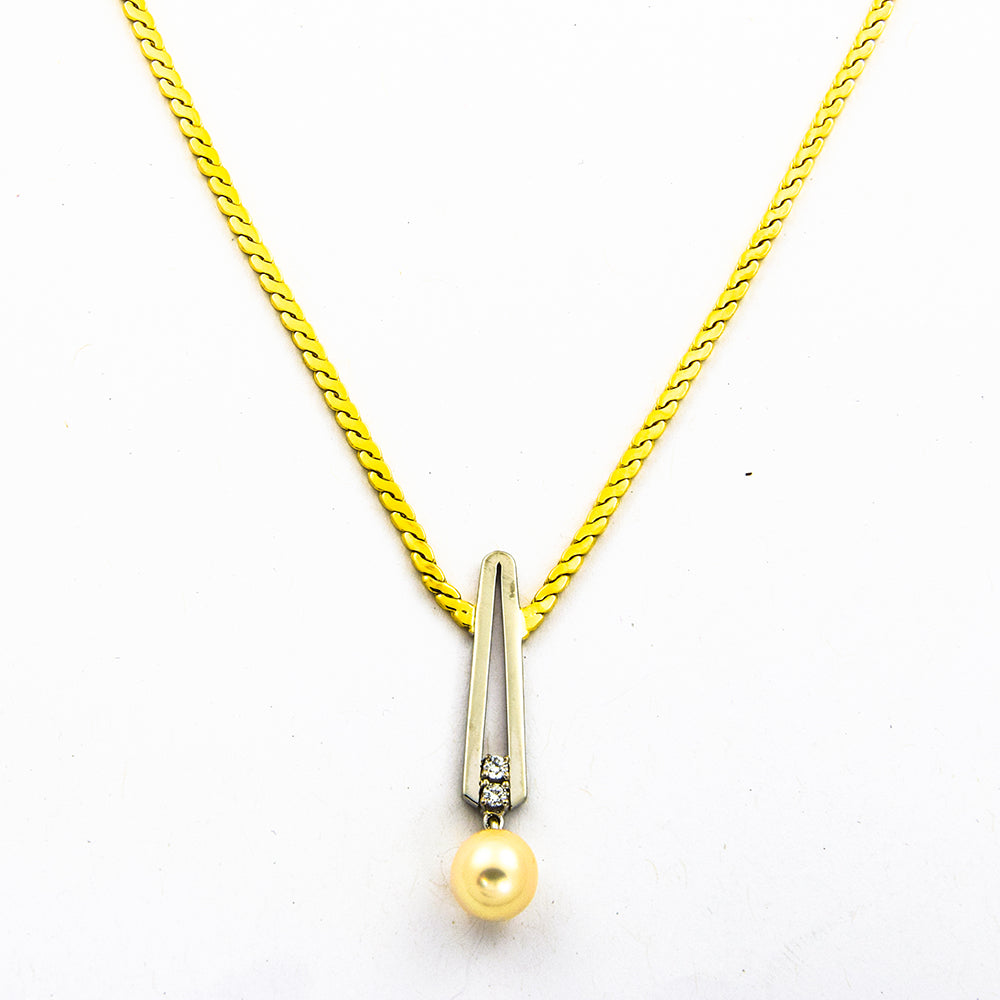 Bei dem Schmuckstück handelt es sich um ein Collier aus 750 Gelb- und Weißgold mit einer Zuchtperle und zwei Brillanten von zusammen ca. 0,06 ct in der Qualität Weiß mit kleinen Einschlüssen (W/si). Das Schmuckstück hat eine Gesamtlänge von 45 cm.