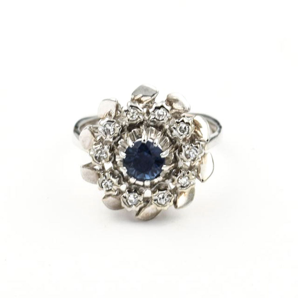 Bei dem Schmuckstück handelt es sich um einen Ring aus 585 Weißgold mit einem Saphir und zehn Diamanten im 8/8 Schliff von zusammen ca. 0,1 ct in der Qualität Weiß mit kleinen Einschlüssen (W/si).