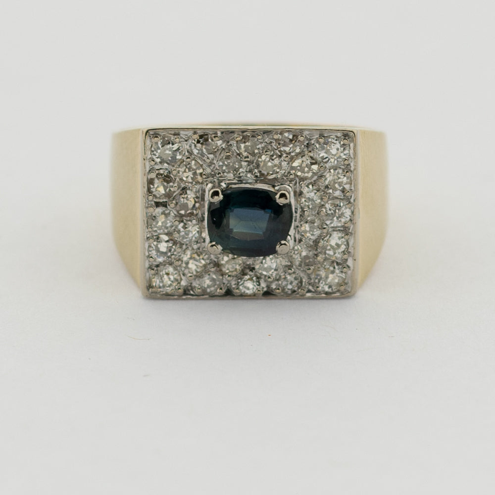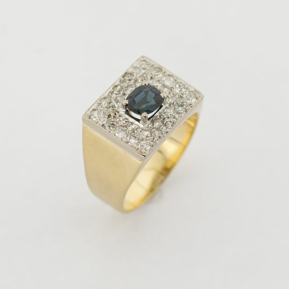 Bei dem Schmuckstück handelt es sich um einen Ring aus 585 Gelb- und Weißgold mit einem Saphir und 29 Diamanten von zusammen ca. 0,725 ct in der Qualität Weiß und piqué 1 (W/p 1).