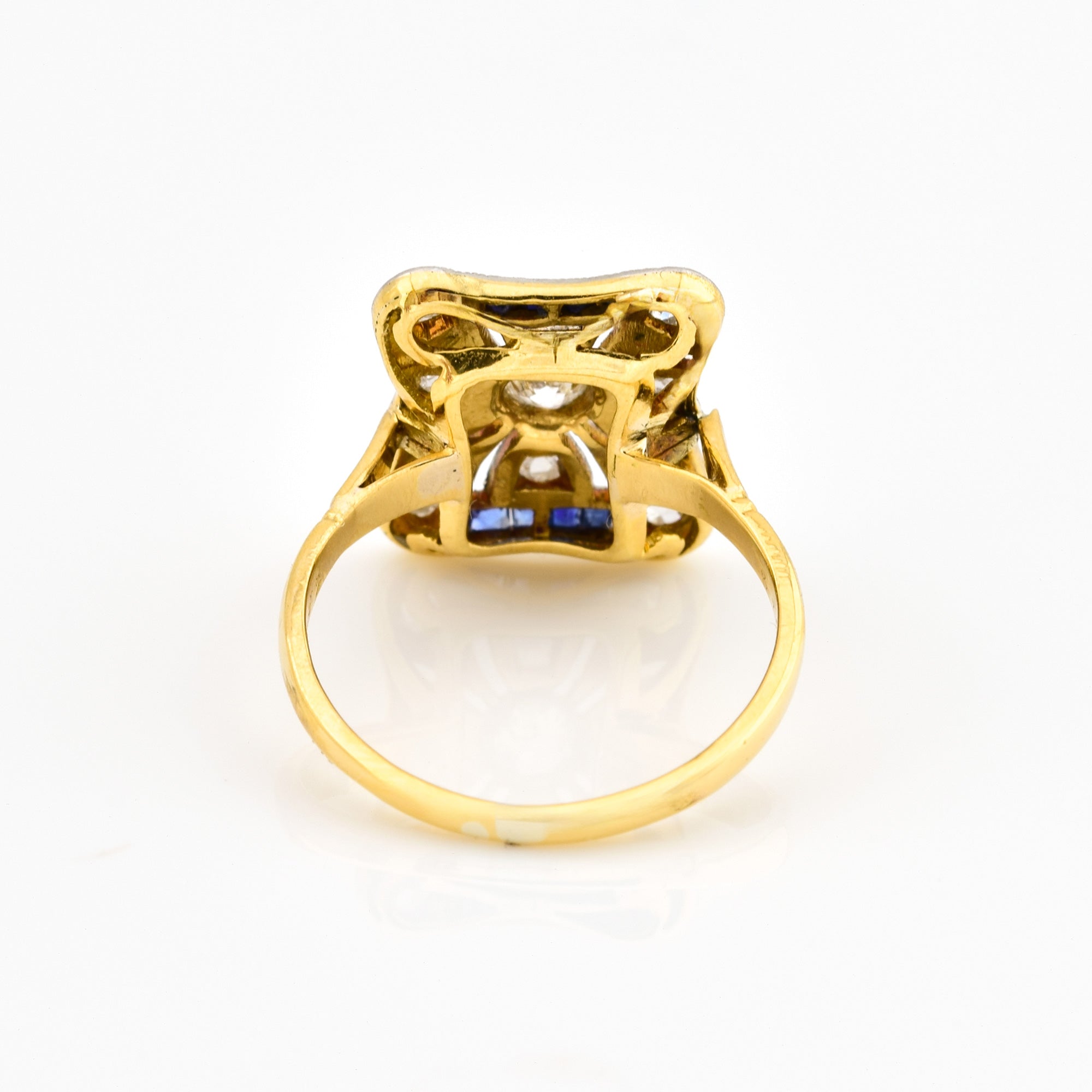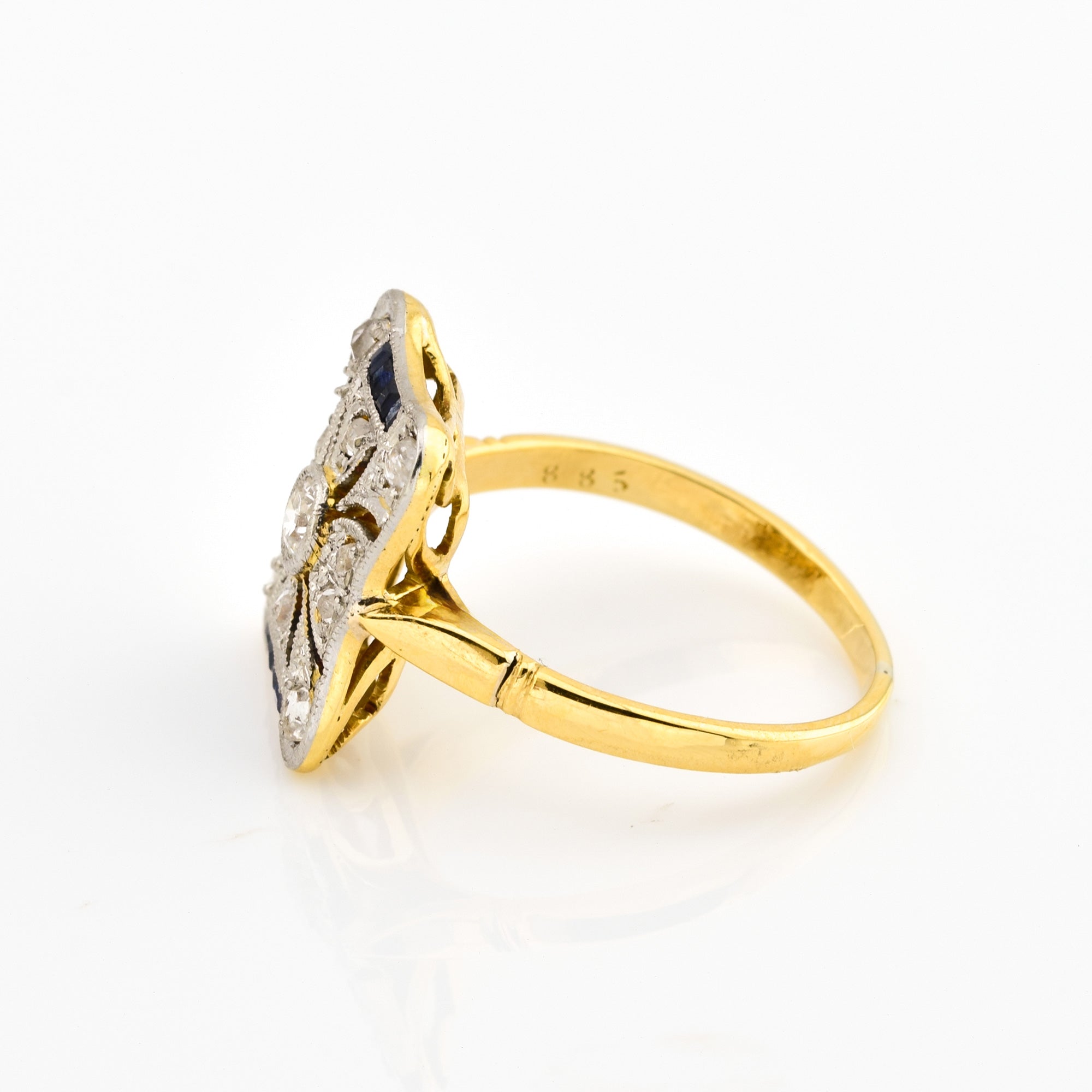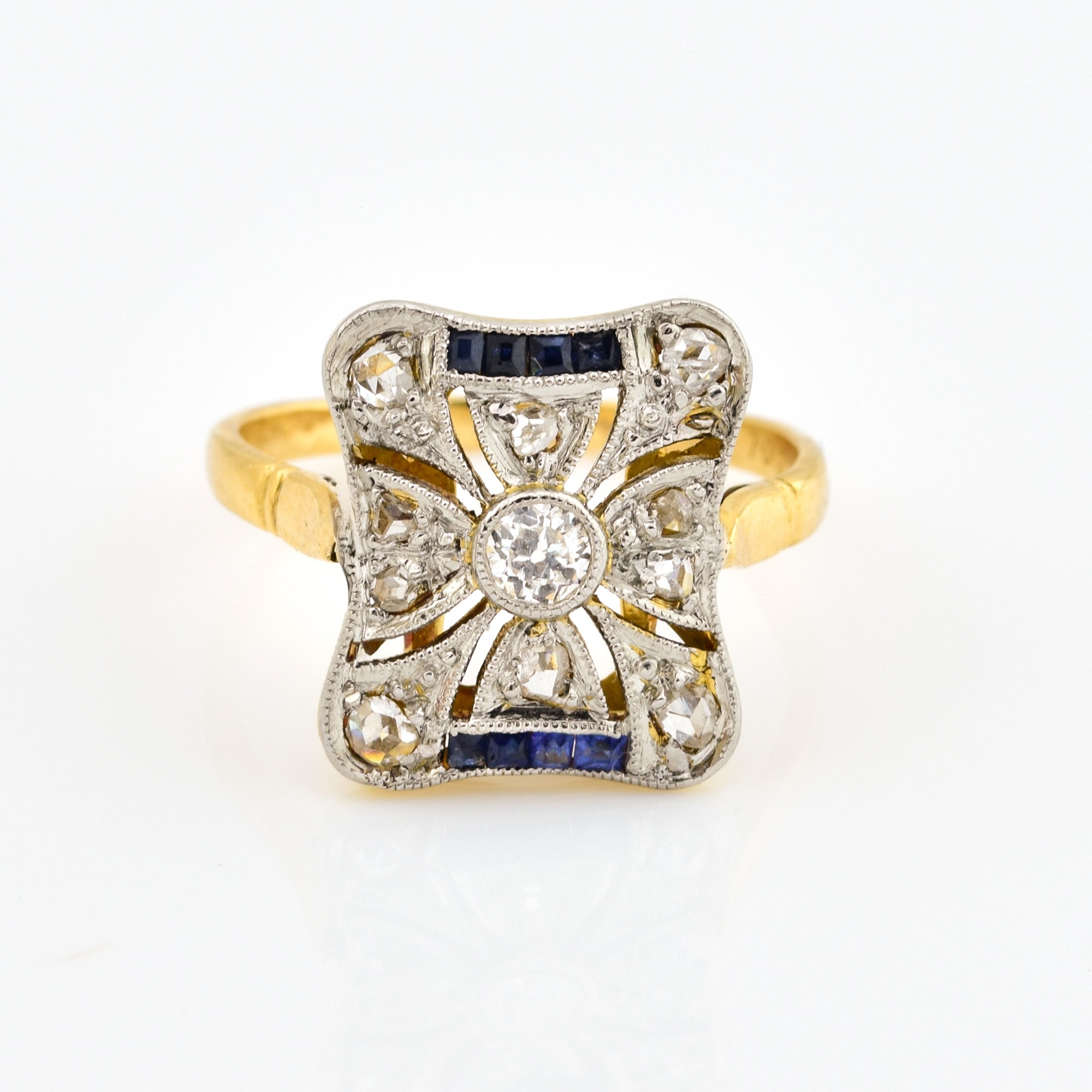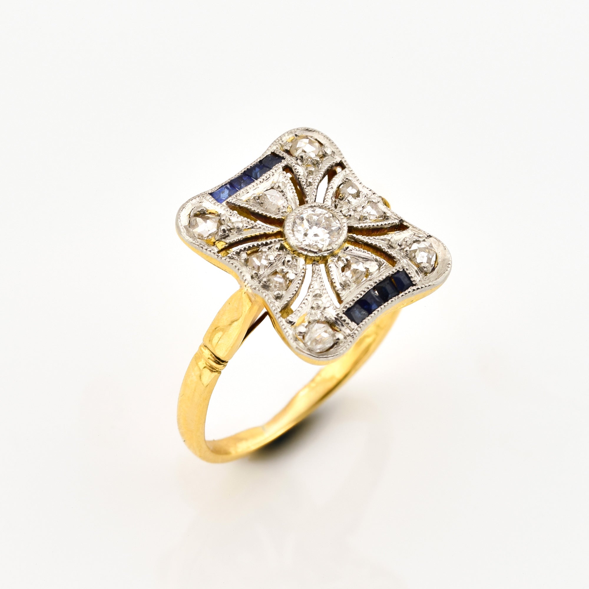 Bei dem Schmuckstück handelt es sich um einen Ring aus 585 Gelbgold/Platin doubliert mit acht Saphircarrés, einem Brillanten im Altschliff von ca. 0,1 ct in der Qualität Weiß und piqué 1 (W/p 1) und zehn Diamantrosen aus der Zeit des Art Déco.