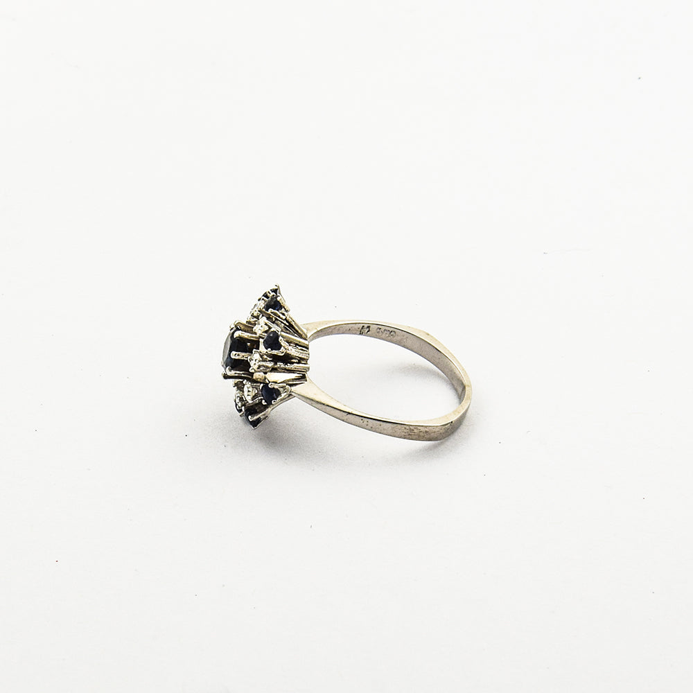 Bei dem Schmuckstück handelt es sich um einen Ring aus 585 Weißgold mit neun Saphiren und acht Diamanten von zusammen ca. 0,24 ct in der Qualität feines Weiß mit kleinen Einschlüssen (TW/si).