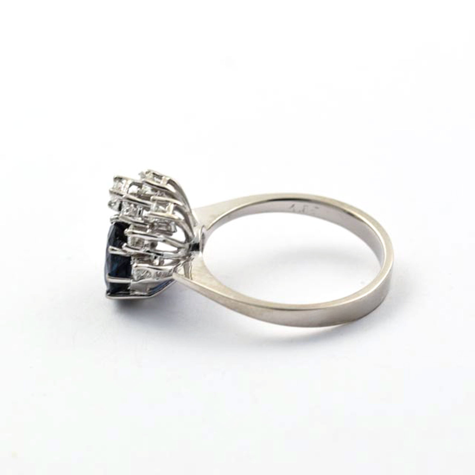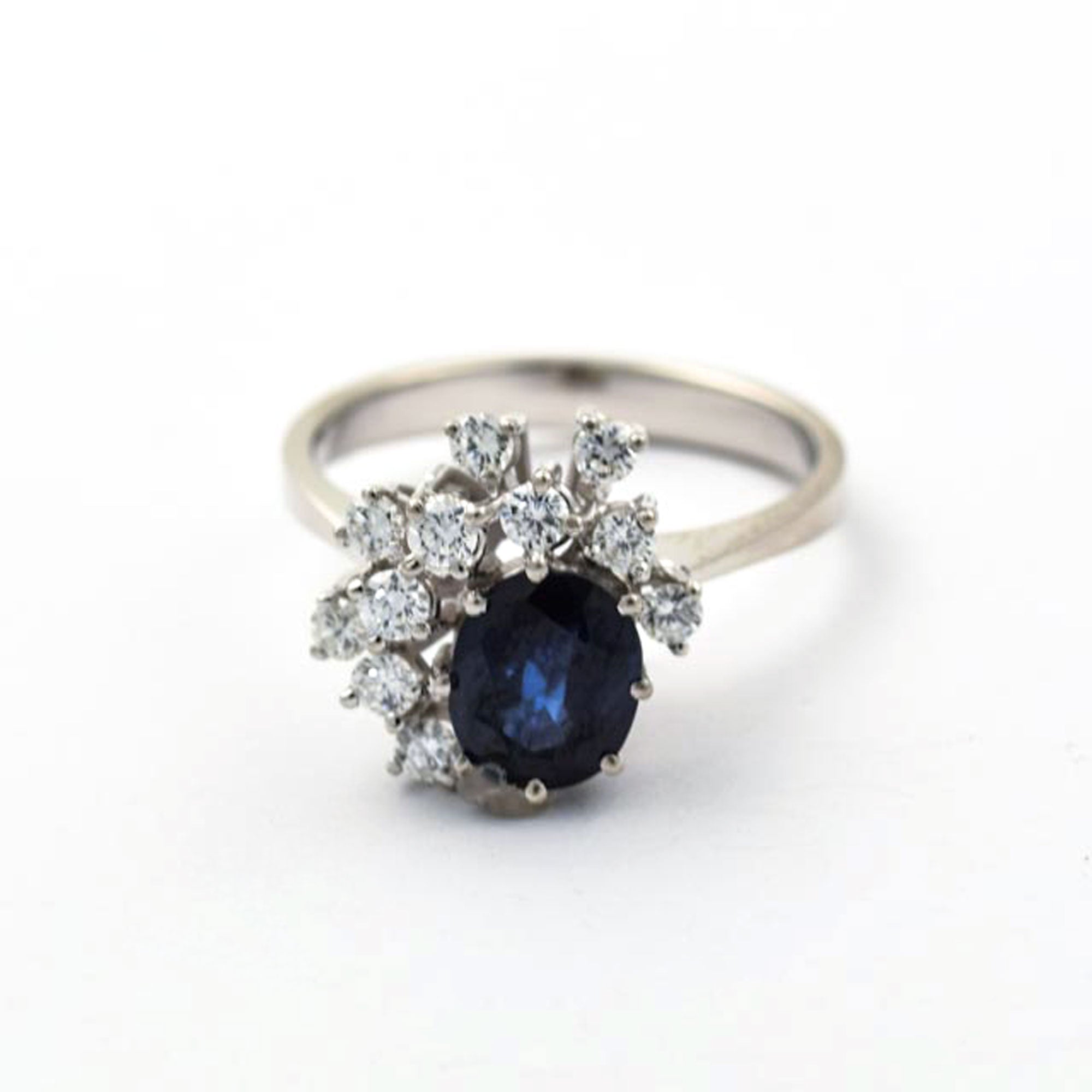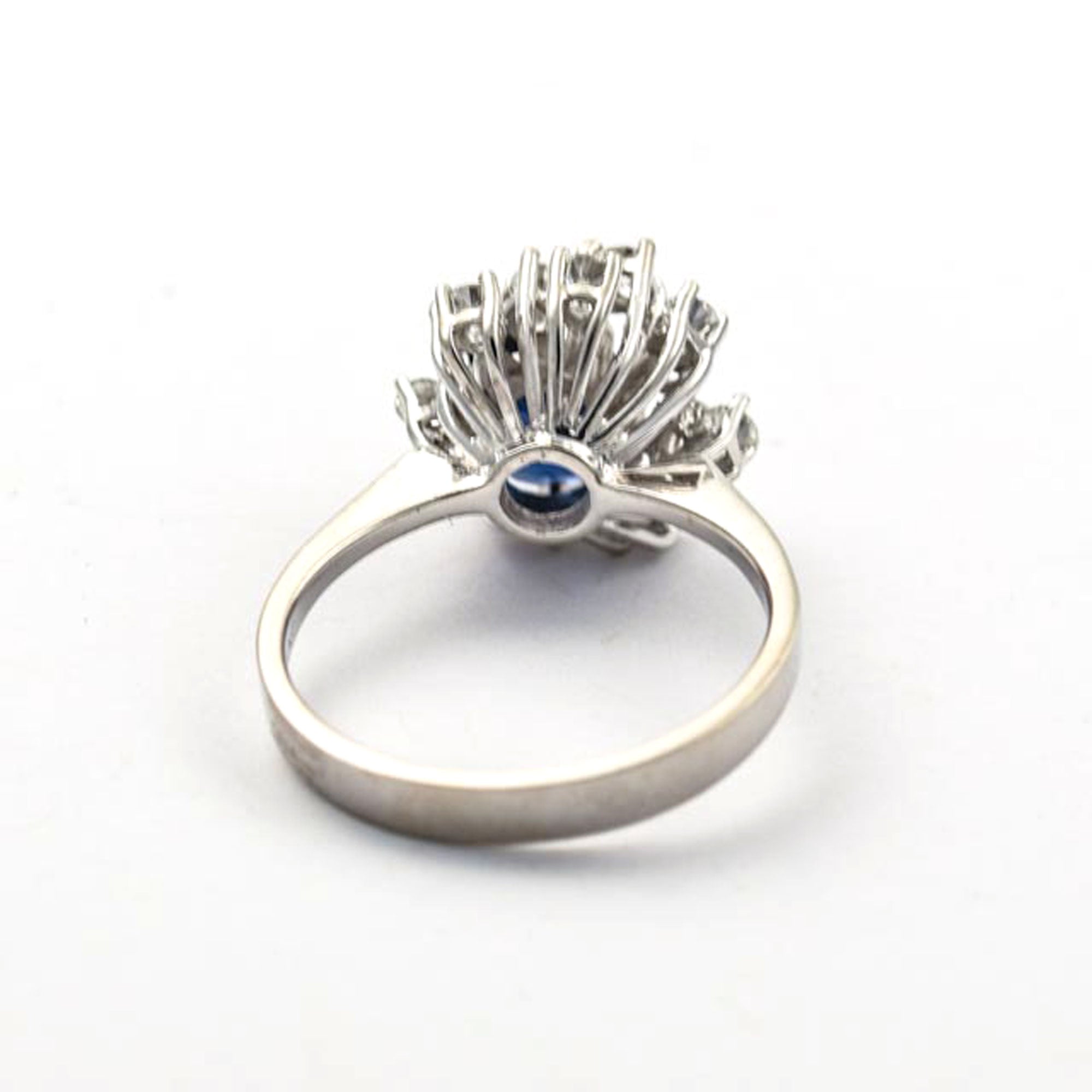 Bei dem Schmuckstück handelt es sich um einen Ring "" der Marke aus 585 Weißgold mit 1 Saphir im von zusammen ca. 0 ct in der Qualität blau mit (blau/); 11 Brillant im von zusammen ca. 0,44 ct in der Qualität feines Weiß mit sehr kleinen Einschlüssen (TW/vs); aus der Zeit , . Das Schmuckstück hat eine Gesamtlänge von cm.