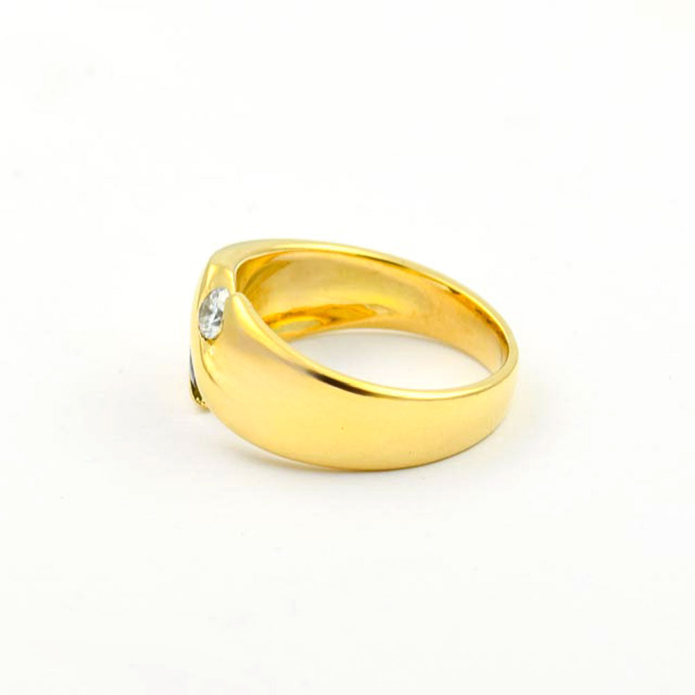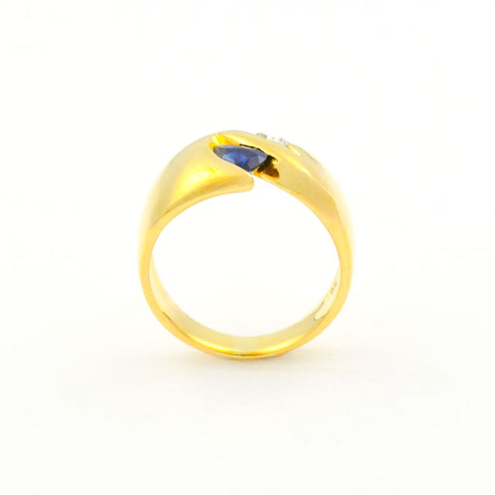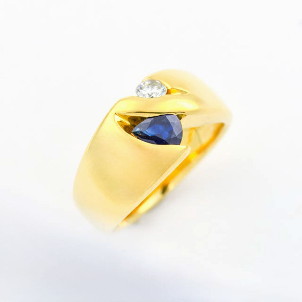 Bei dem Schmuckstück handelt es sich um einen Ring aus 750 Gelbgold mit einem Saphirtropfen von ca. 0,51 ct und einem Brillanten von ca. 0,2 ct in der Qualität Weiß mit kleinen Einschlüssen (W/si).